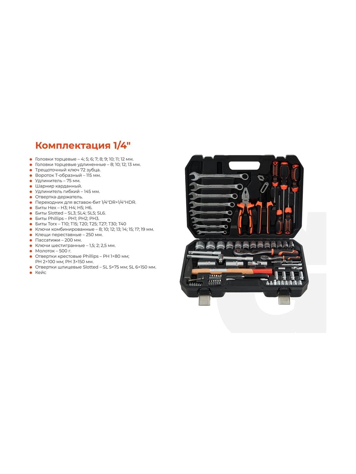 Набор инструментов Gigant 77 предметов GAS 77 представлен в расширенной комплектации и имеет широкую область применения. Комплект включает в себя биты, головки, отвертки, молоток, пассатижи, ключи и прочие универсальные инструменты. Все модели изготовлены из высококачественной стали, что придает им особую прочность и обеспечивает долгий срок службы. Рукоятки инструментов обеспечивают комфорт во время работы, не утомляют и не натирают руку. Набор поставляется в ударопрочном кейсе, который существенно упрощает транспортировку и хранение инструмента. Продукция представлена профессиональными и бытовыми инструментами, имеет доступную цену и высокое качество. При изготовлении товаров Gigant используется современное оборудование и прочные материалы. Производство осуществляется на современных предприятиях России и Азии. Тестирование товаров осуществляется в два этапа, каждая партия инструментов проходит проверку на соответствие стандартам и заявленным техническим характеристикам. Это является залогом качества и надежности готового продукта. Продукция представлена широкой линейкой инструментов. У нас можно приобрести ручной инструмент, строительный, садовый, сантехнический, климатический, крепежный, автогаражный, а также станки, расходные материалы и многое другое.
