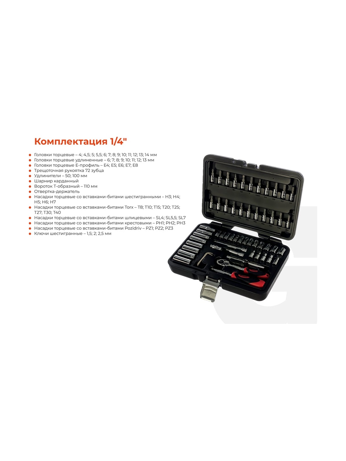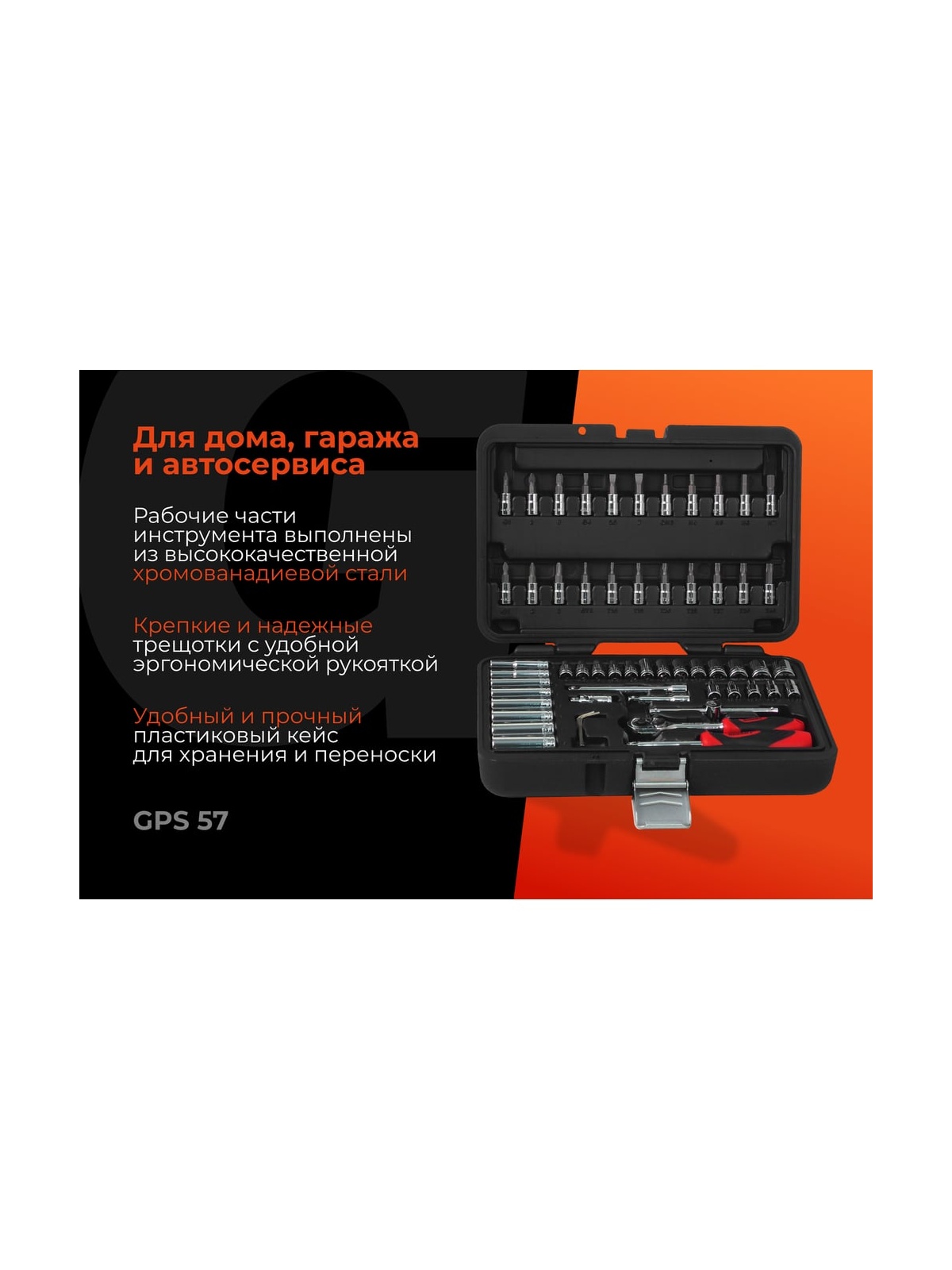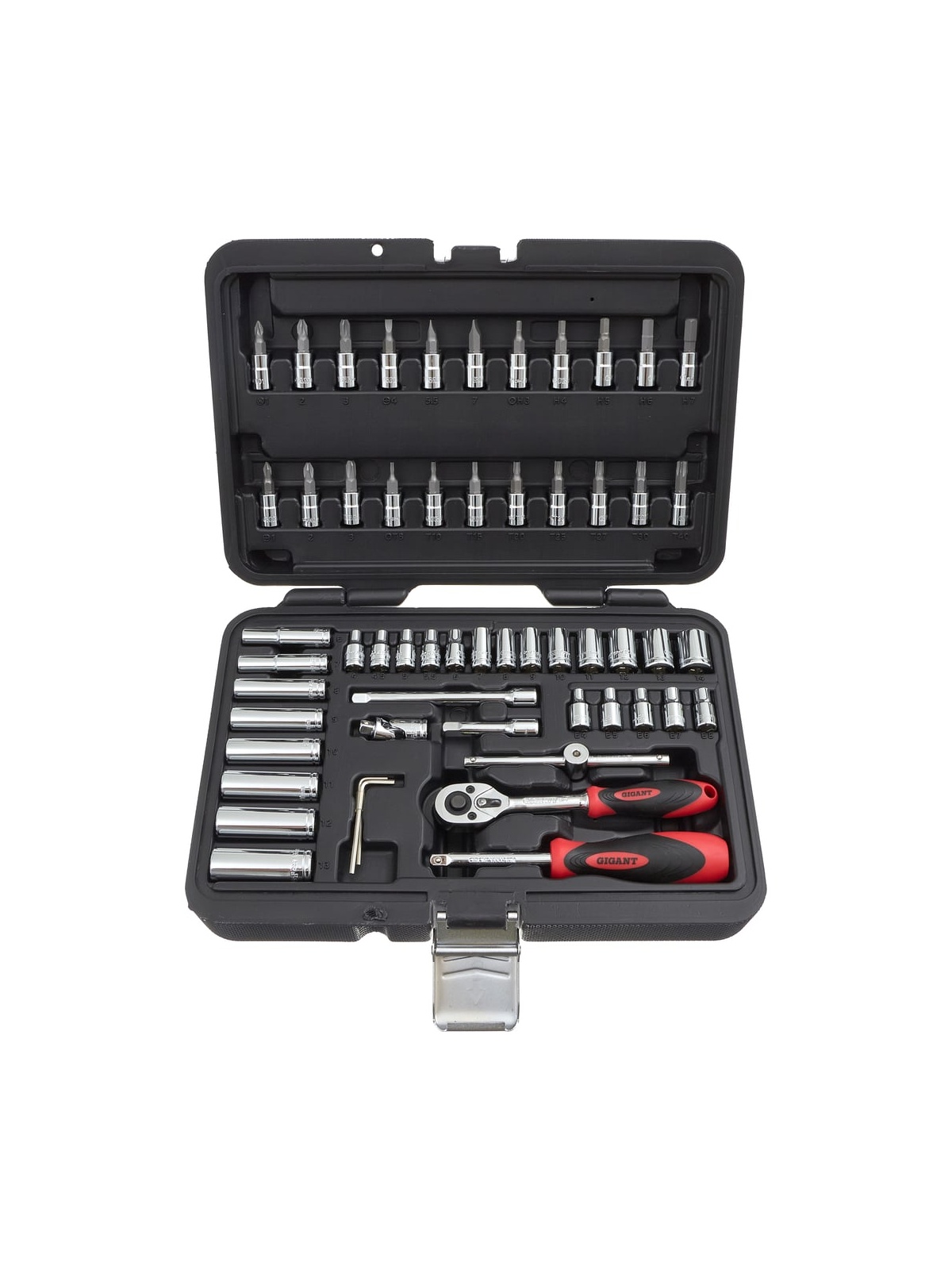 Набор инструментов Gigant Professional 1/4" 57 предметов GPS 57 подходит для проведения монтажных, демонтажных, ремонтных работ. Применяется в автосервисах, мастерских, на станциях технического обслуживания. Комплект включает в себя головки, насадки, ключи, отвертки и прочие универсальные инструменты. Предназначен для профессионального использования. Набор поставляется в компактном и стильном кейсе для удобного хранения и транспортировки. Все модели изготовлены из высококачественной стали, что придает им особую прочность и обеспечивает долгий срок службы. Рукоятки инструментов обеспечивают комфорт во время работы, не утомляют и не натирают руку. Продукция представлена профессиональными и бытовыми инструментами, имеет доступную цену и высокое качество. При изготовлении товаров Gigant используется современное оборудование и прочные материалы. Производство осуществляется на современных предприятиях России и Азии. Тестирование товаров осуществляется в два этапа, каждая партия инструментов проходит проверку на соответствие стандартам и заявленным техническим характеристикам. Это является залогом качества и надежности готового продукта. Продукция представлена широкой линейкой инструментов. У нас можно приобрести ручной инструмент, строительный, садовый, сантехнический, климатический, крепежный, автогаражный, а также станки, расходные материалы и многое другое.