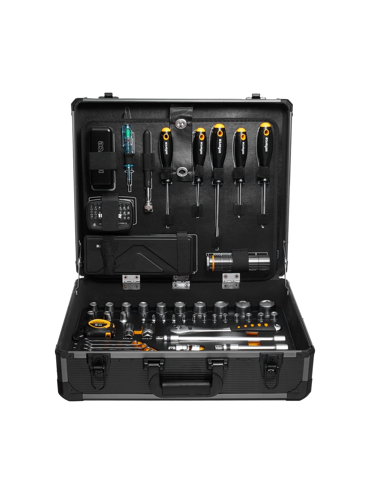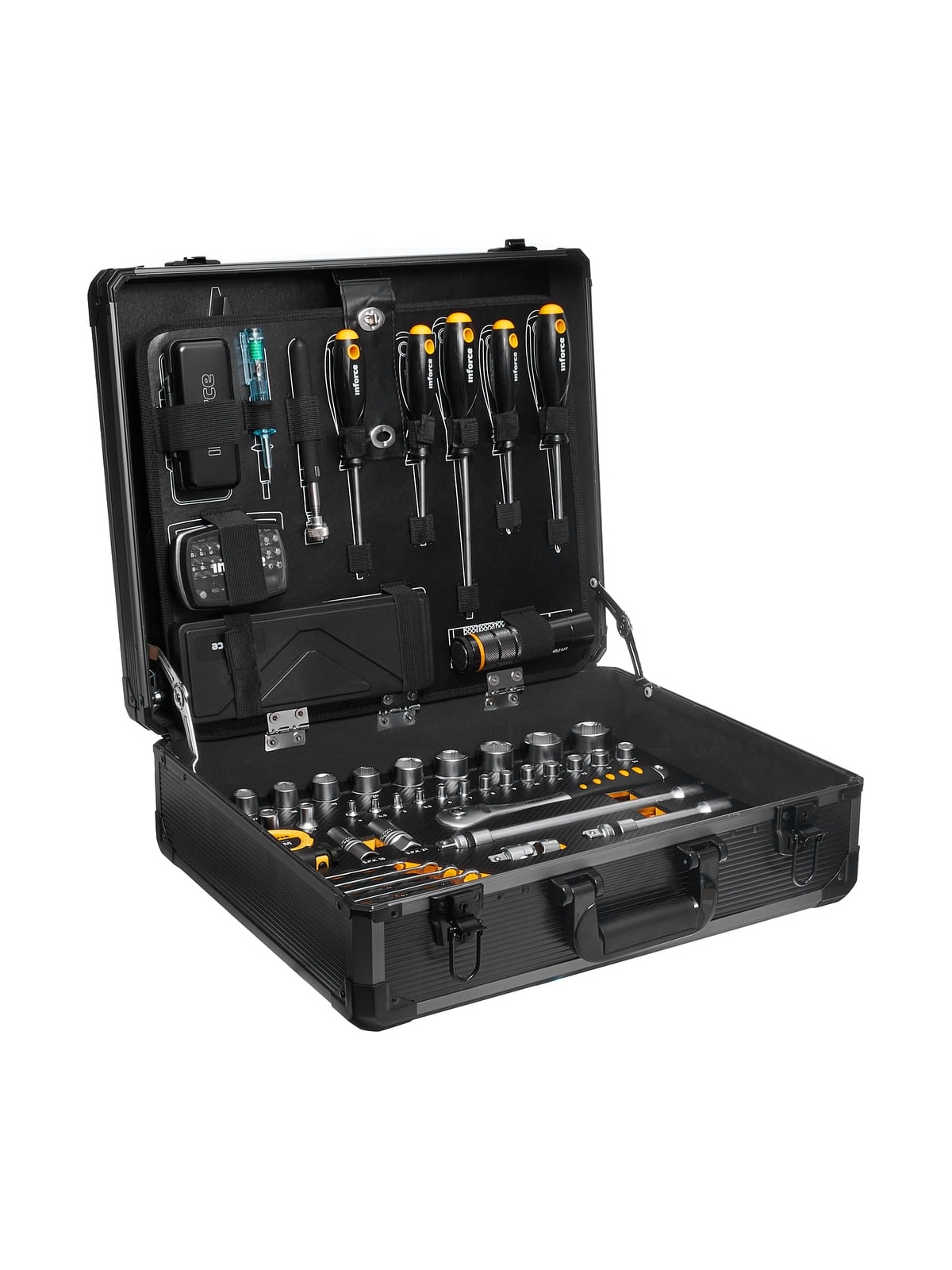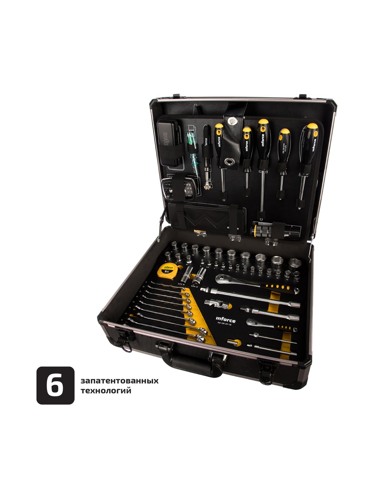 Набор инструментов Inforce 152 предмета 1/2 дюйма и 1/4 дюйма 06-07-18 используется в мастерских и автосервисах для монтажных, демонтажных и ремонтных работ. В комплекте представлены модели профессионального класса. Все инструменты выполнены из прочной стали. Набор поставляется в кейсе для удобного и компактного хранения. Перед использованием рекомендуется произвести 25 циклов вращения трещоточного механизма - для распределения смазки по всей поверхности механизма.