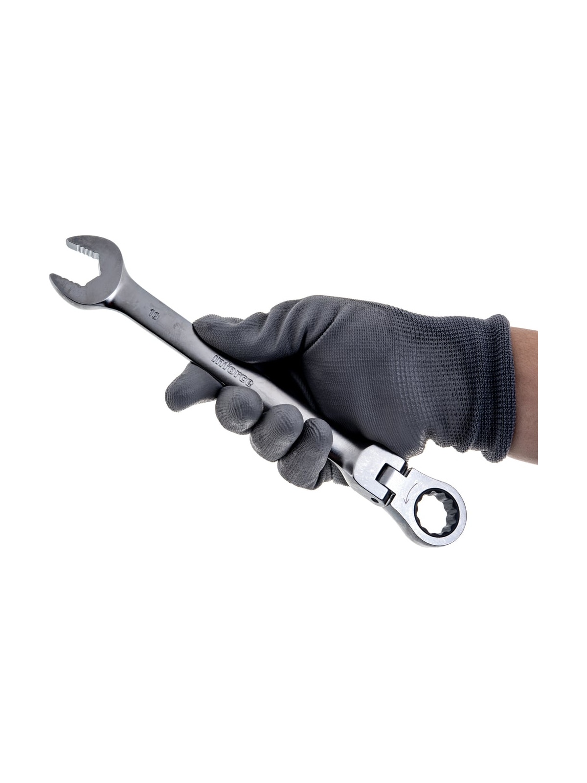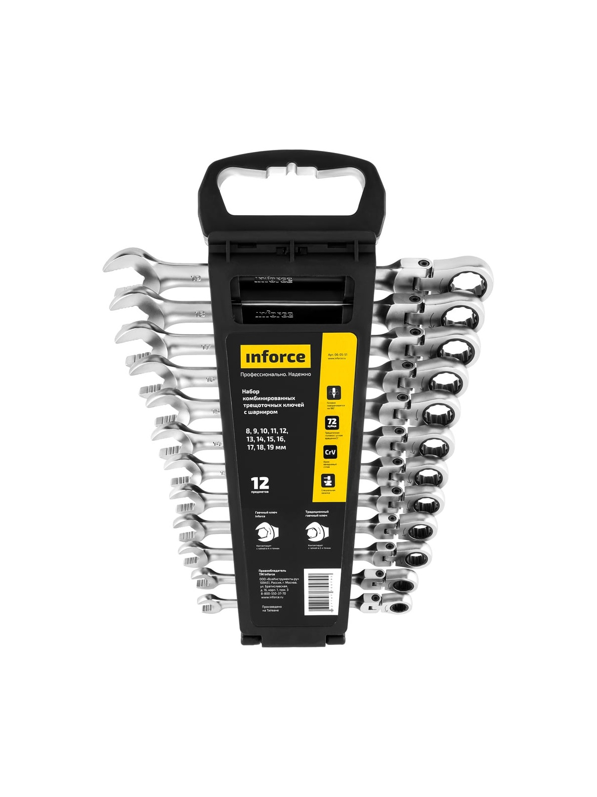 Набор комбинированных шарнирных ключей с трещоткой 12 предметов Inforce 06-05-51 выполнен из прочной хромованадиевой стали с защитным антикоррозийным покрытием. Комплект включает в себя 12 инструментов для работы с крепежом различного размера. Металл закален до 46 HRC.