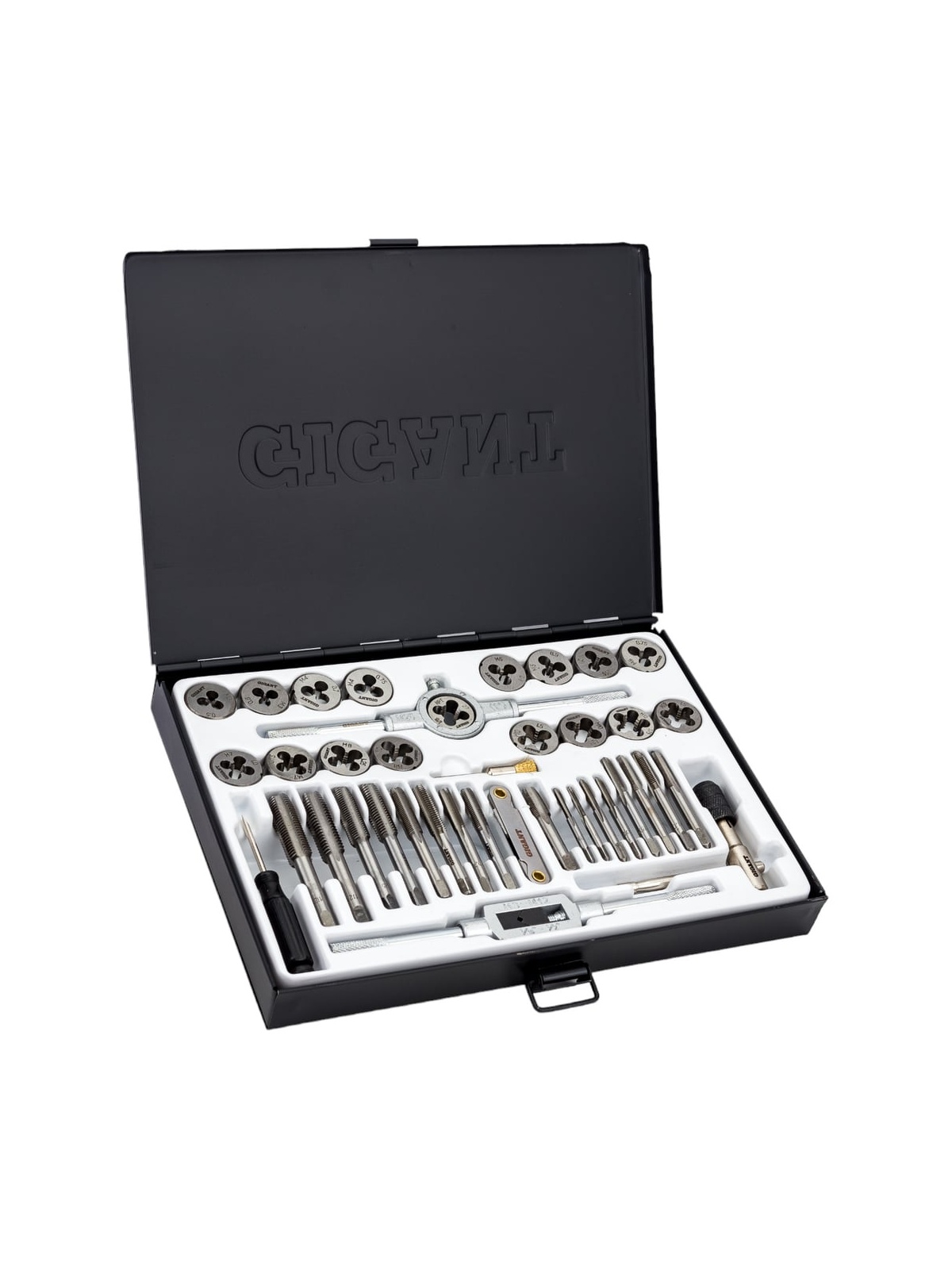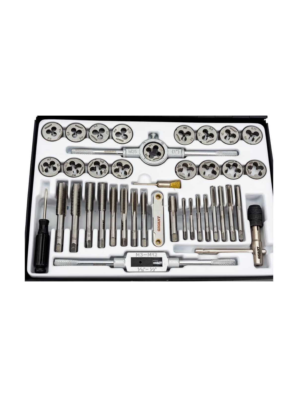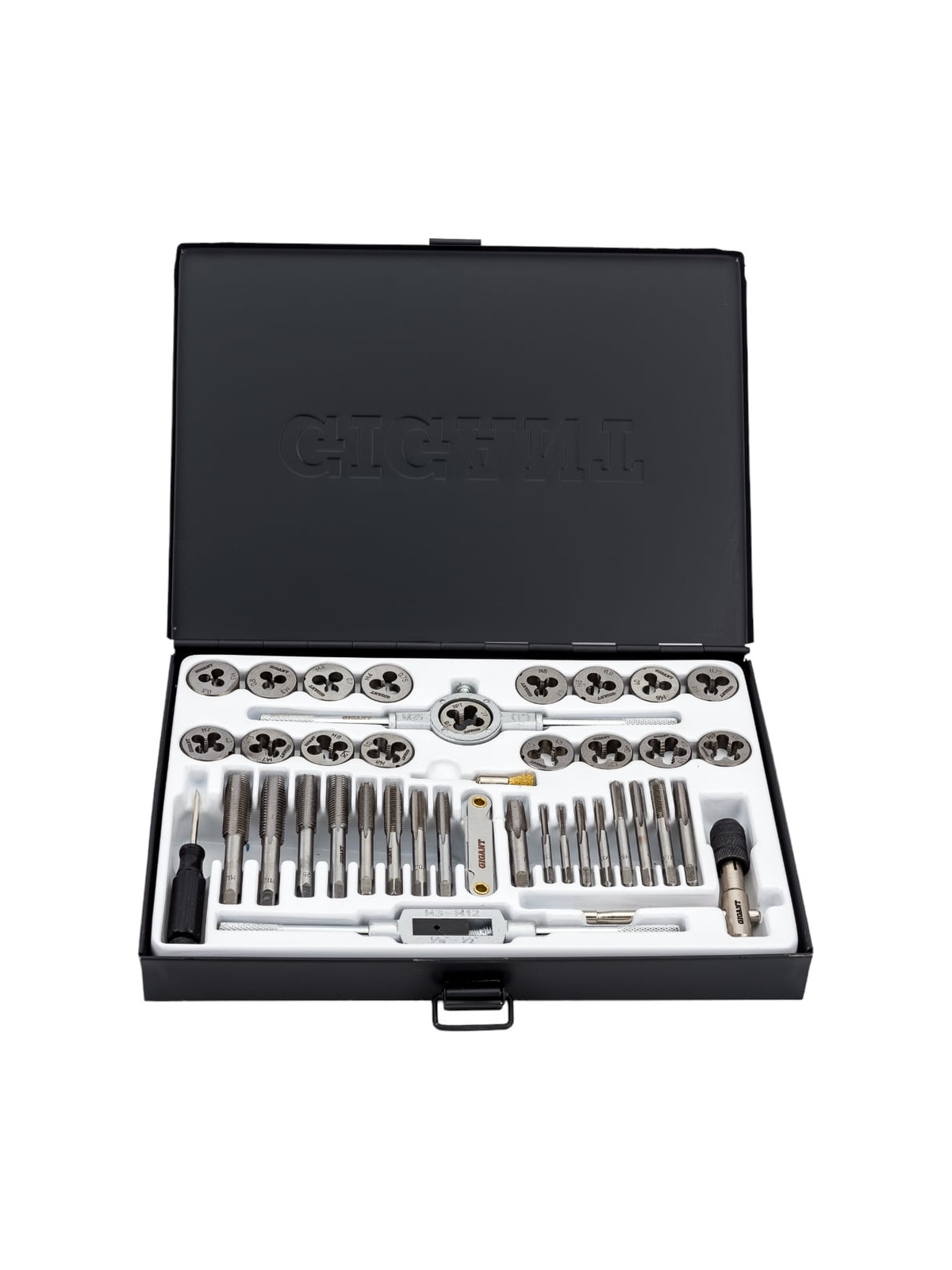 Набор метчиков и плашек 40 предметов Gigant STD040 содержит инструменты и приспособления для нарезания и калибрования внешней и внутренней резьбы на металлических деталях и заготовках. Входящие в комплект предметы выполнены из прочной и долговечной стали 9XC. Повышенная износостойкость, упругость; Сопротивление изгибу и кручению; Стойкость к высоким нагрузкам; Удобный кейс обеспечивает сохранность и мобильность набора.