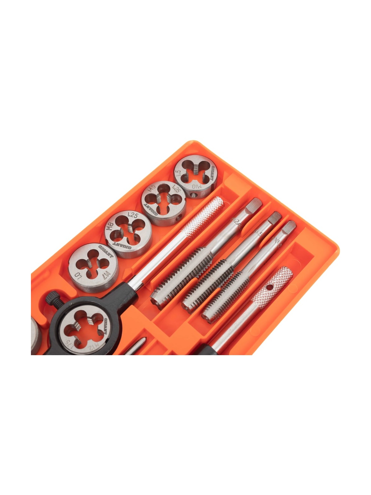 Набор метчиков и плашек Gigant 20 предметов STD20 предназначен для получения чистой внешней и внутренней резьбы. Метчики и плашки изготовлены из стали, которая отличается высокой контактной прочностью и износостойкостью.