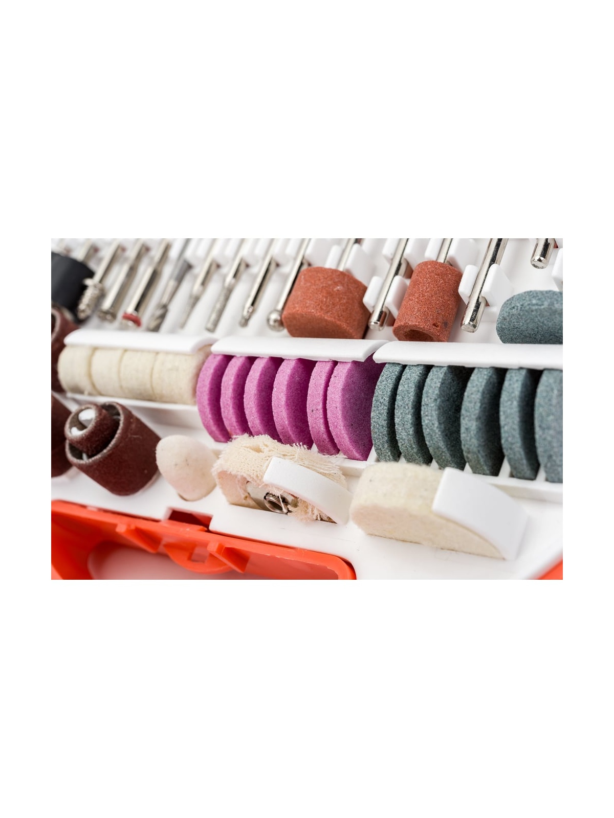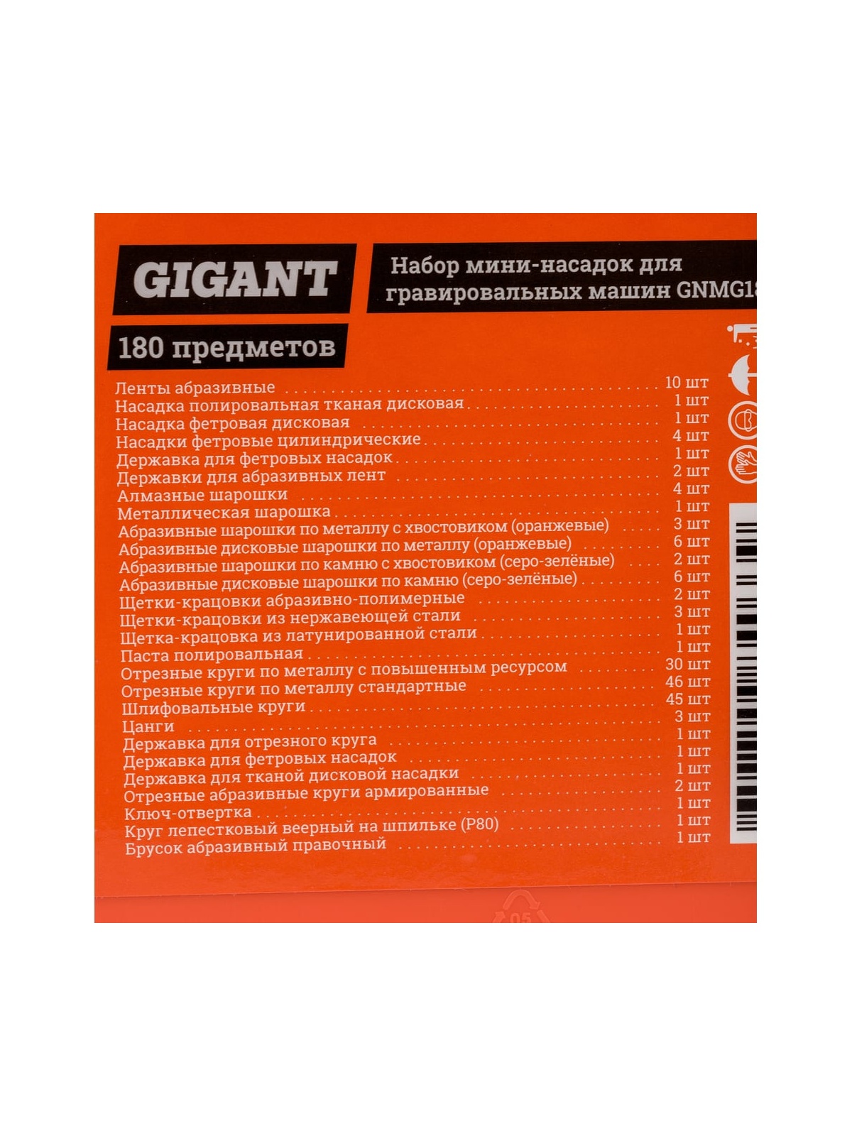 Набор мини-насадок для гравировальных машин 180 предметов Gigant GNMG180 содержит мини-насадки для гравировальных машин. Насадки применяются для чистовой обработки различных материалов. В набор входят предметы для выполнения разных операций, например, шлифовки, полировки, резки. Зернистость и форма насадок также различны. Благодаря этому можно выполнять работы любой сложности и даже в труднодоступных местах. Поставляется набор в пластиковом кейсе.