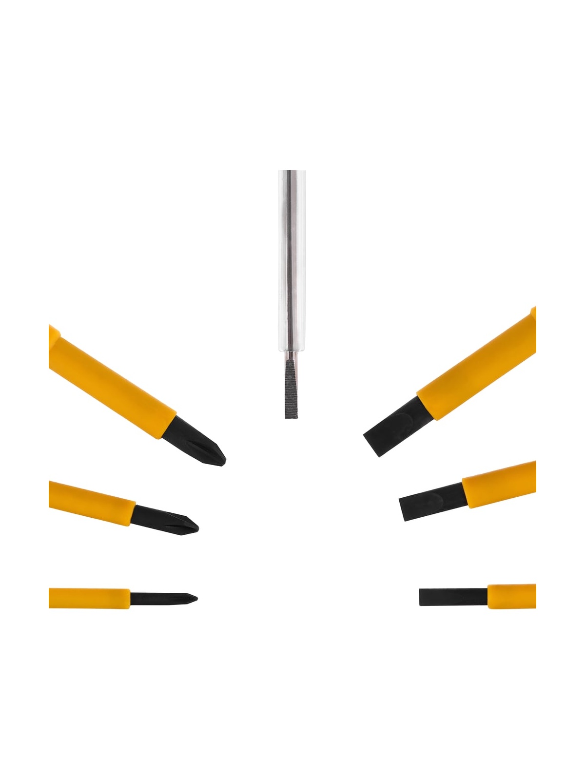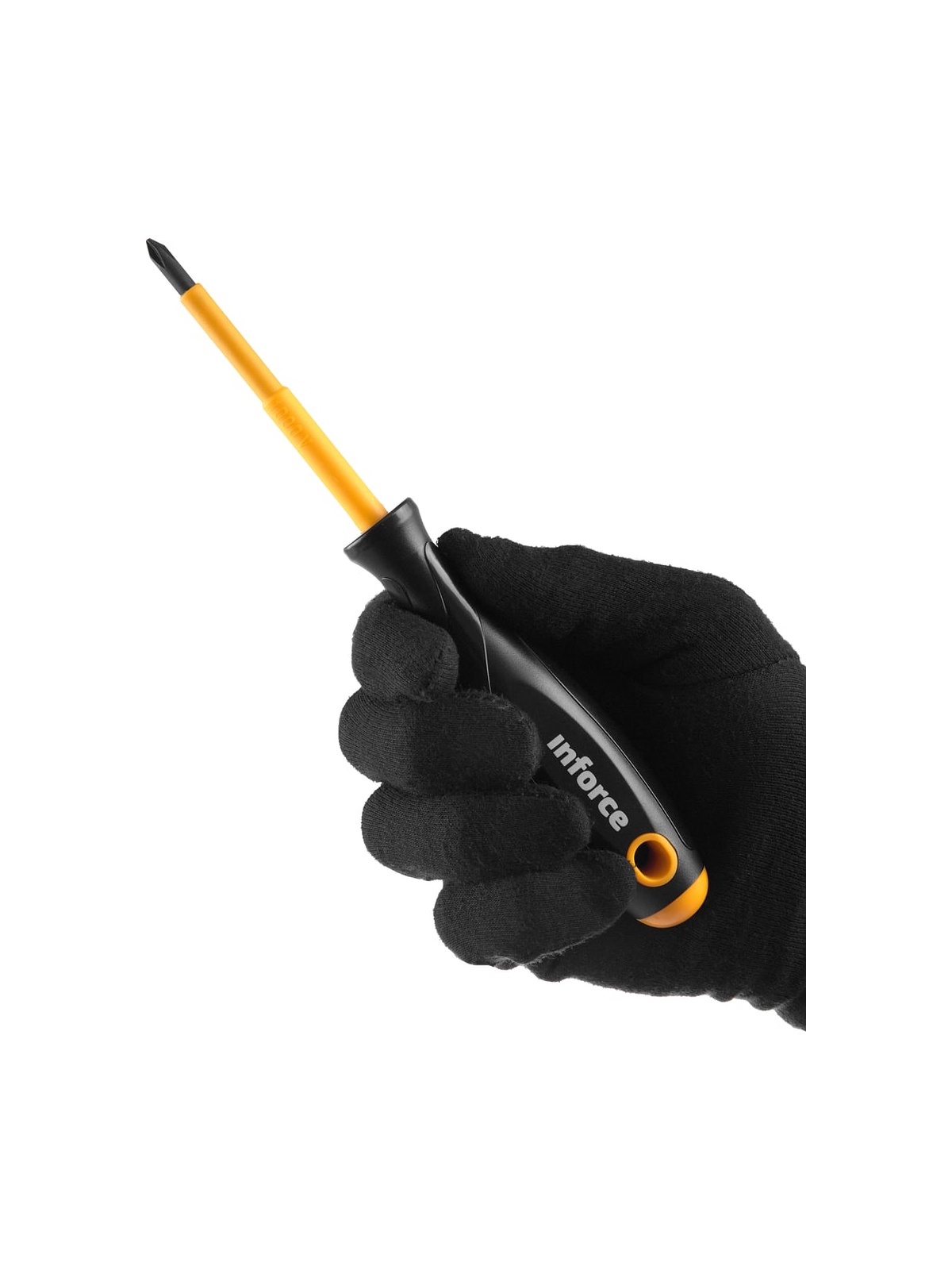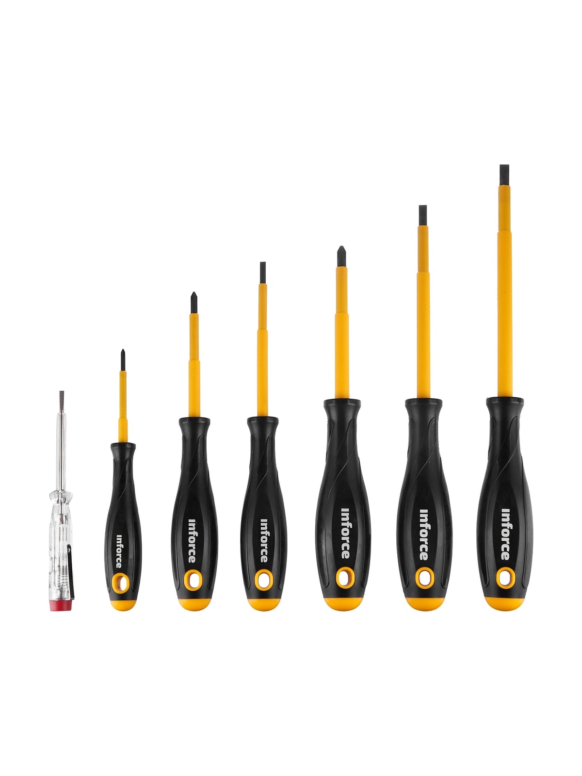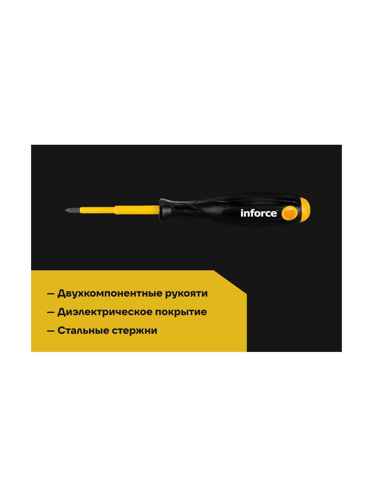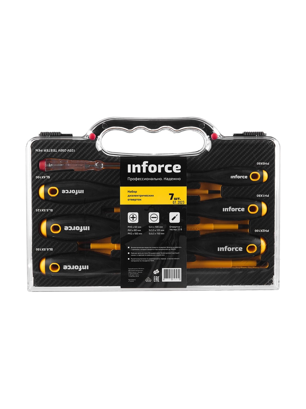Набор отверток диэлектрических 7шт Inforce 06-09-84 подойдет для электрика при следующих видах работ под напряжением до 1000 В: монтаже розеток и выключателей; сборке или ремонте распределительного щитка; иных электротехнических работ. Инструмент уложен в удобный кейс с прозрачной крышкой и индивидуальными позициями для каждой отвертки.