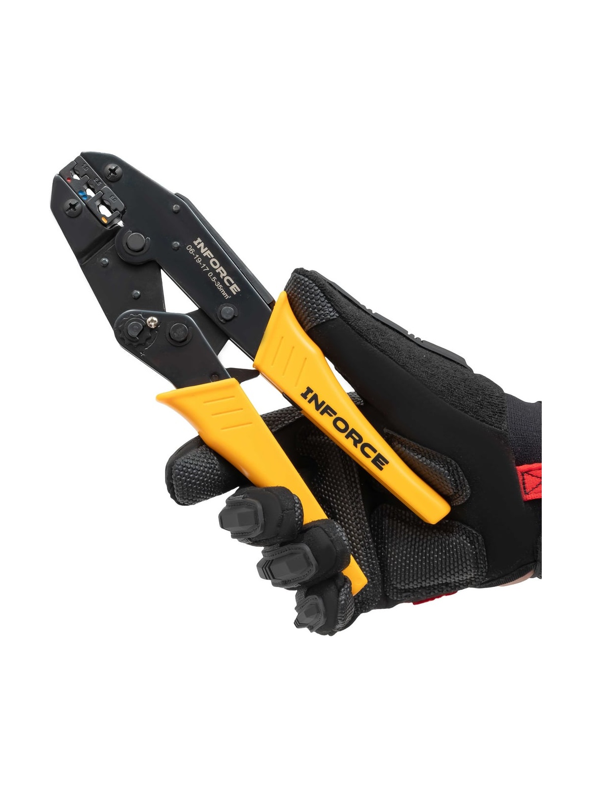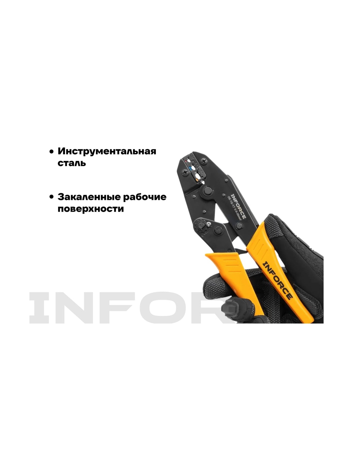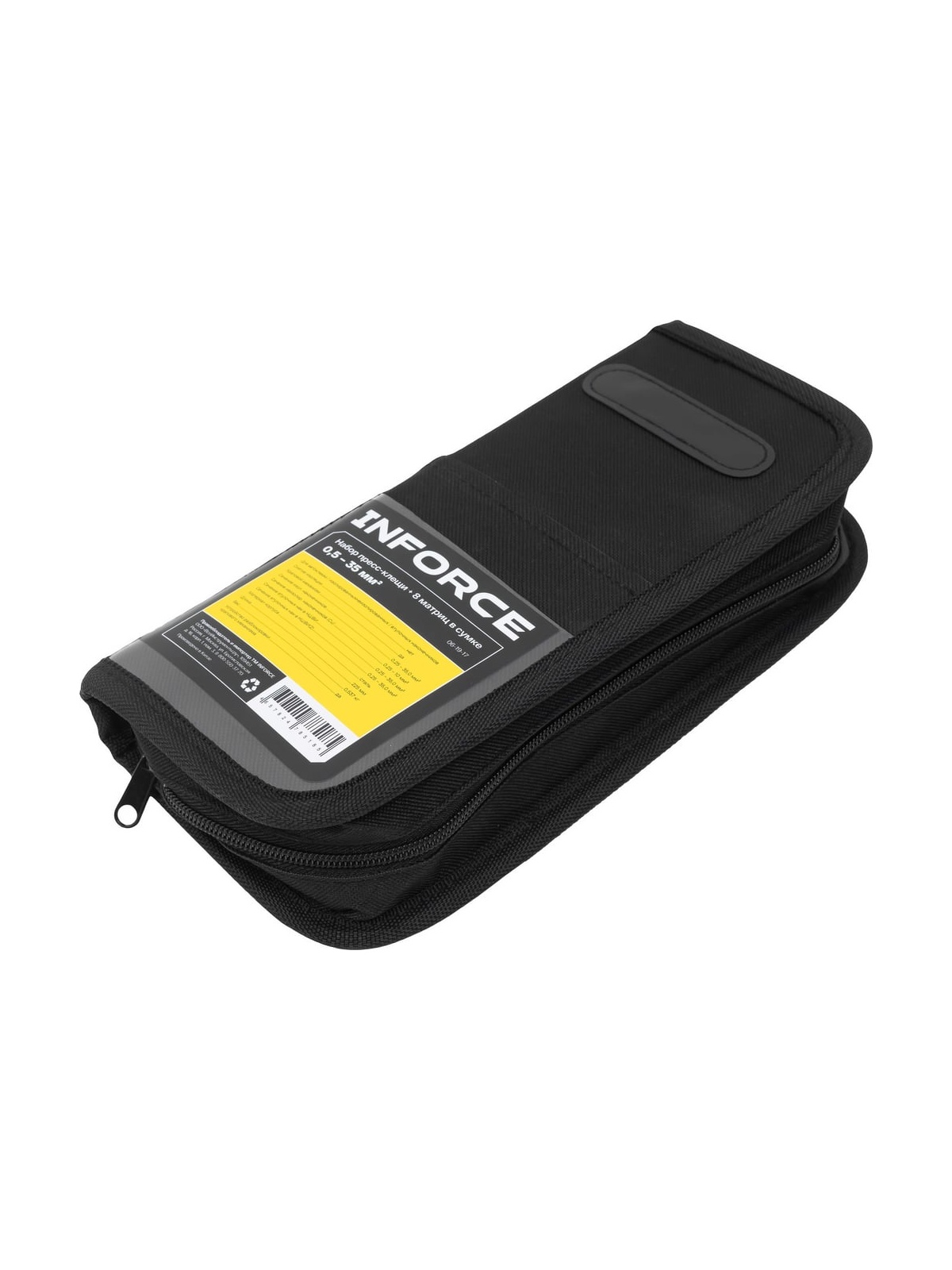 Набор пресс-клещи Inforce + 8 матриц в сумке 0,5 – 35 мм2 06-19-17 представляет собой универсальный комплект для обжима кабельных наконечников и гильз разного типа. Набор предназначается для профессионального использования, это позволяет проводить электромонтажные работы наивысшего качества. Набор изготовлен из инструментальной стали и имеет закаленные рабочие поверхности. Это значительно увеличивает рабочий ресурс и обеспечивает высокую стойкость к интенсивным нагрузкам. Рычажный механизм упрощает рабочий процесс, снижая нагрузку на руку пользователя. Храповый механизм гарантирует полный цикл опрессовки и облегчает работу. В комплекте 8 матриц: Матрица 10WF для изолированных клемм: 0,25–0,75; 1,0–1,5; 2,5; 4,0; 6,0; 10 мм² Матрица 35WF для изолированных клемм увеличенного сечения: 10; 16; 25; 35 мм² Матрица MC4 для солнечных коннекторов: 2,5; 4; 6 мм² Матрица 10A для изолированных наконечников: 0,5–1; 1,5–2,5; 4–6; 10 мм² Матрица 30B для неизолированных наконечников: 0,25–6 мм² Матрица 30H для неизолированных наконечников: 0,25–6 мм² Матрица 30Y для изолированных наконечников: 0,5–1; 1,5–2,5; 4–6 мм² Матрица 03B для изолированных наконечников: 0,5; 1–1,5; 2,5; 4–6 мм² Дополнительные характеристики: Материал корпуса - сталь Твердость рабочих узлов - 45 HRC Устройство разблокировки храпового механизма