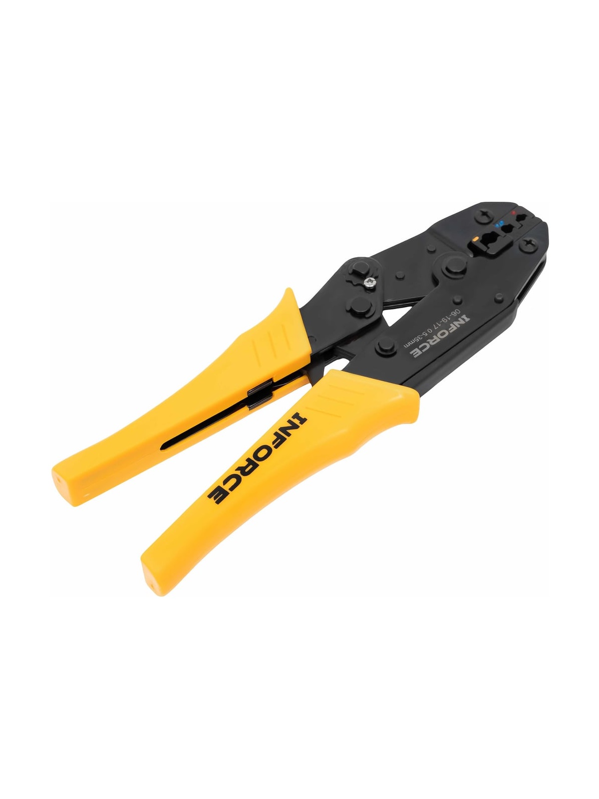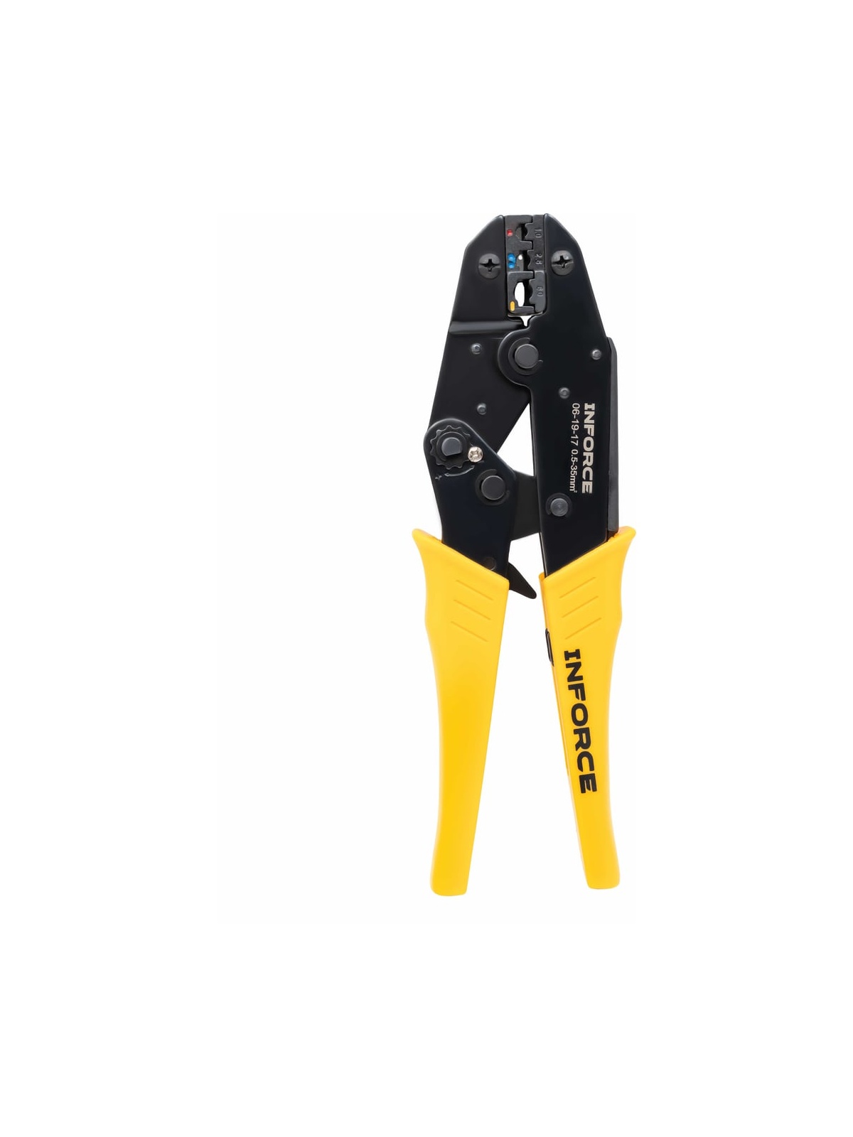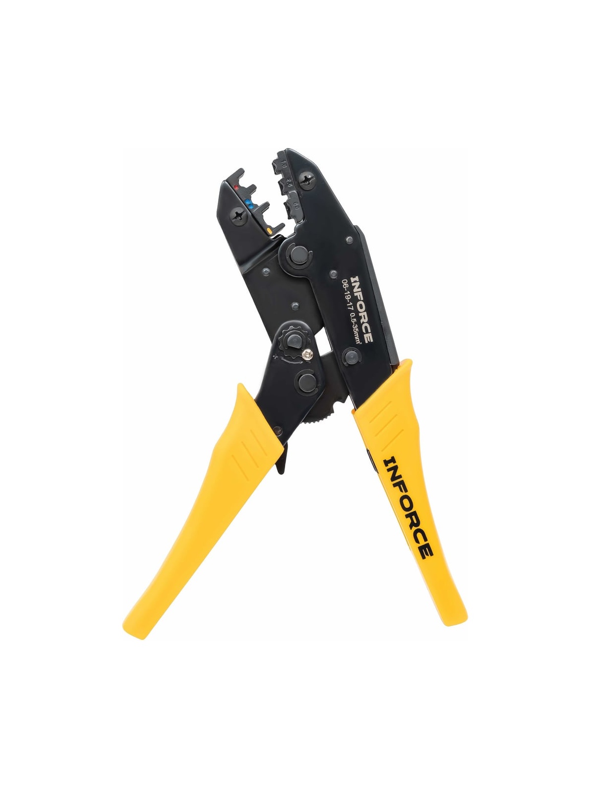 Набор пресс-клещи Inforce + 8 матриц в сумке 0,5 – 35 мм2 06-19-17 представляет собой универсальный комплект для обжима кабельных наконечников и гильз разного типа. Набор предназначается для профессионального использования, это позволяет проводить электромонтажные работы наивысшего качества. Набор изготовлен из инструментальной стали и имеет закаленные рабочие поверхности. Это значительно увеличивает рабочий ресурс и обеспечивает высокую стойкость к интенсивным нагрузкам. Рычажный механизм упрощает рабочий процесс, снижая нагрузку на руку пользователя. Храповый механизм гарантирует полный цикл опрессовки и облегчает работу. В комплекте 8 матриц: Матрица 10WF для изолированных клемм: 0,25–0,75; 1,0–1,5; 2,5; 4,0; 6,0; 10 мм² Матрица 35WF для изолированных клемм увеличенного сечения: 10; 16; 25; 35 мм² Матрица MC4 для солнечных коннекторов: 2,5; 4; 6 мм² Матрица 10A для изолированных наконечников: 0,5–1; 1,5–2,5; 4–6; 10 мм² Матрица 30B для неизолированных наконечников: 0,25–6 мм² Матрица 30H для неизолированных наконечников: 0,25–6 мм² Матрица 30Y для изолированных наконечников: 0,5–1; 1,5–2,5; 4–6 мм² Матрица 03B для изолированных наконечников: 0,5; 1–1,5; 2,5; 4–6 мм² Дополнительные характеристики: Материал корпуса - сталь Твердость рабочих узлов - 45 HRC Устройство разблокировки храпового механизма