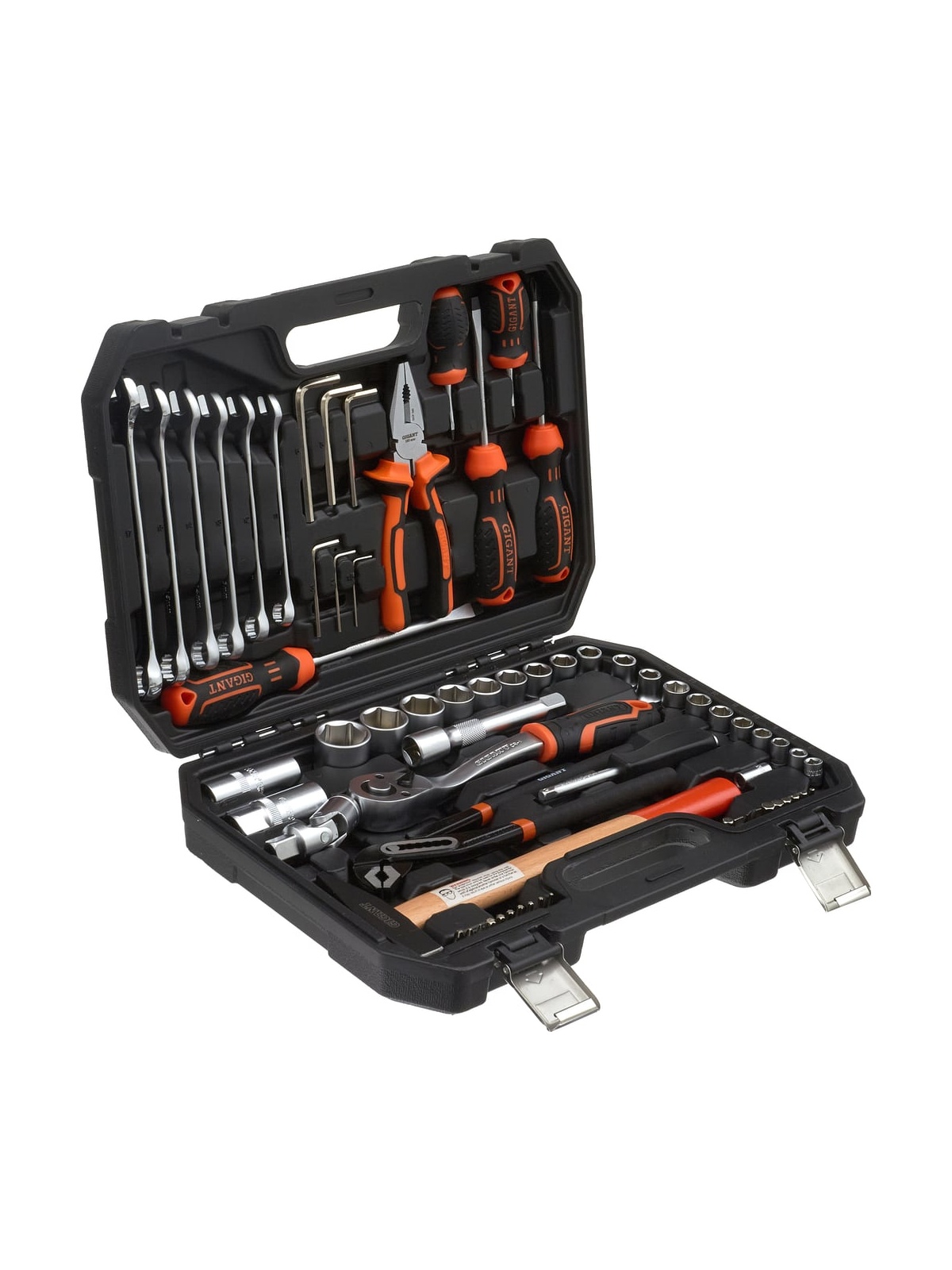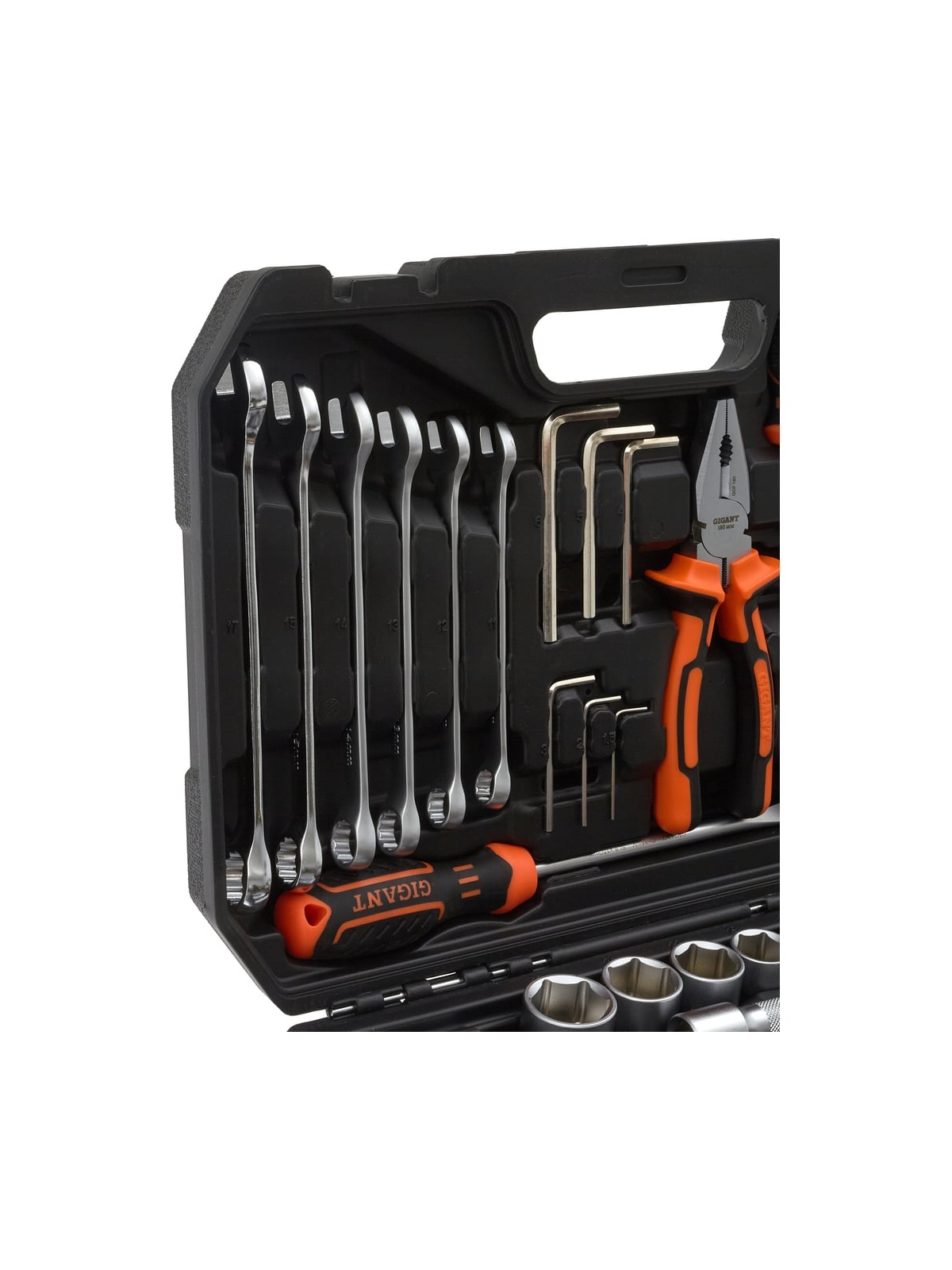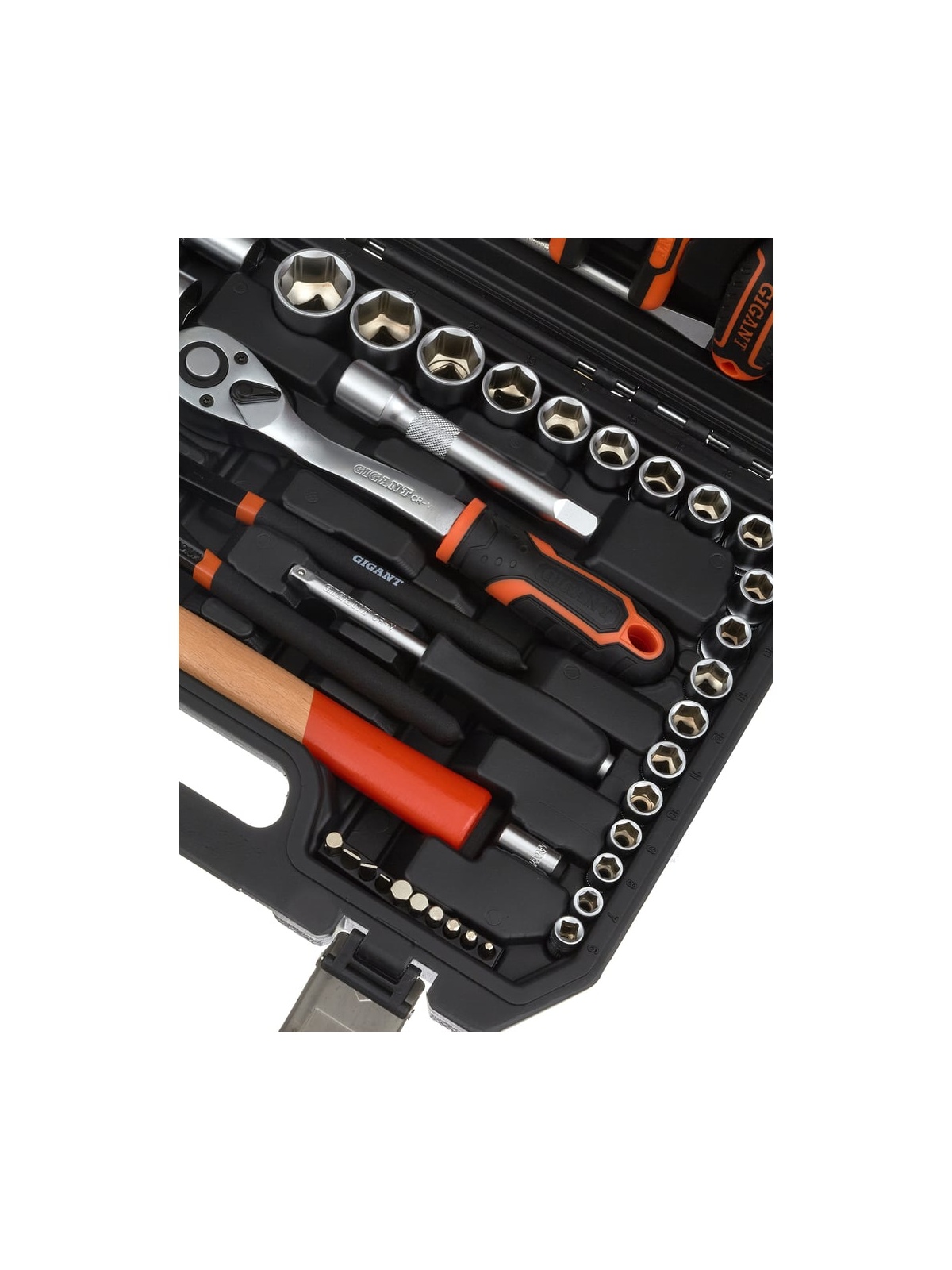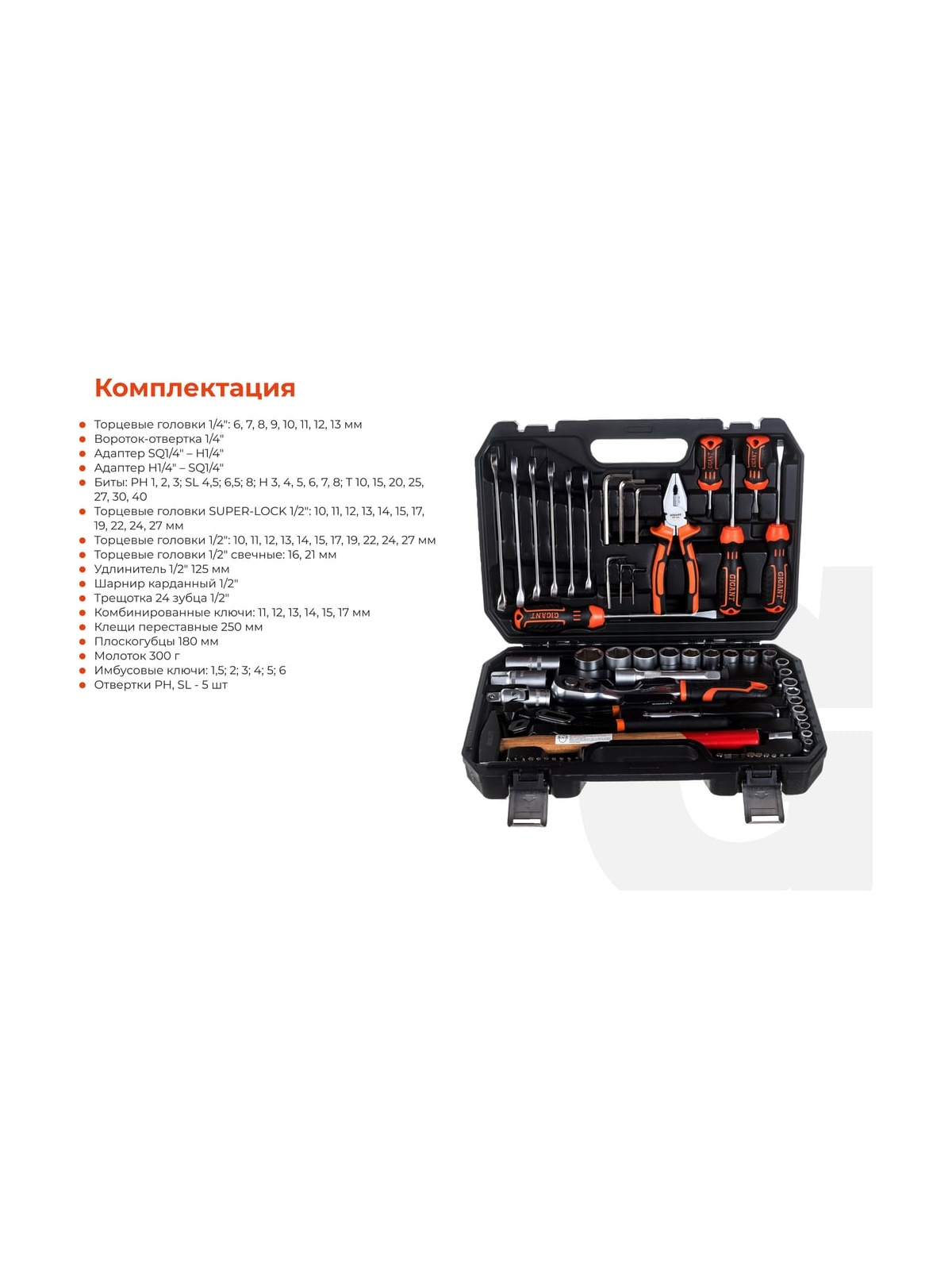 Набор представлен в оптимальной комплектации и включает в себя самые необходимые инструменты и популярные типоразмеры головок и ключей. Это делает данный набор универсальным и незаменимым помощником для выполнения ремонтных работ в гараже и дома. Рабочие части инструмента изготовлены из прочной стали и отличаются высокой стойкостью к износу. Антикоррозийное покрытие надежно защищает инструмент от негативного внешнего воздействия и значительно продлевает его срок службы. Набор поставляется в удобном кейсе, где каждый предмет имеет свое отделение. Это обеспечивает бережное хранение, комфортную транспортировку и удобный поиск необходимой модели во время работы.