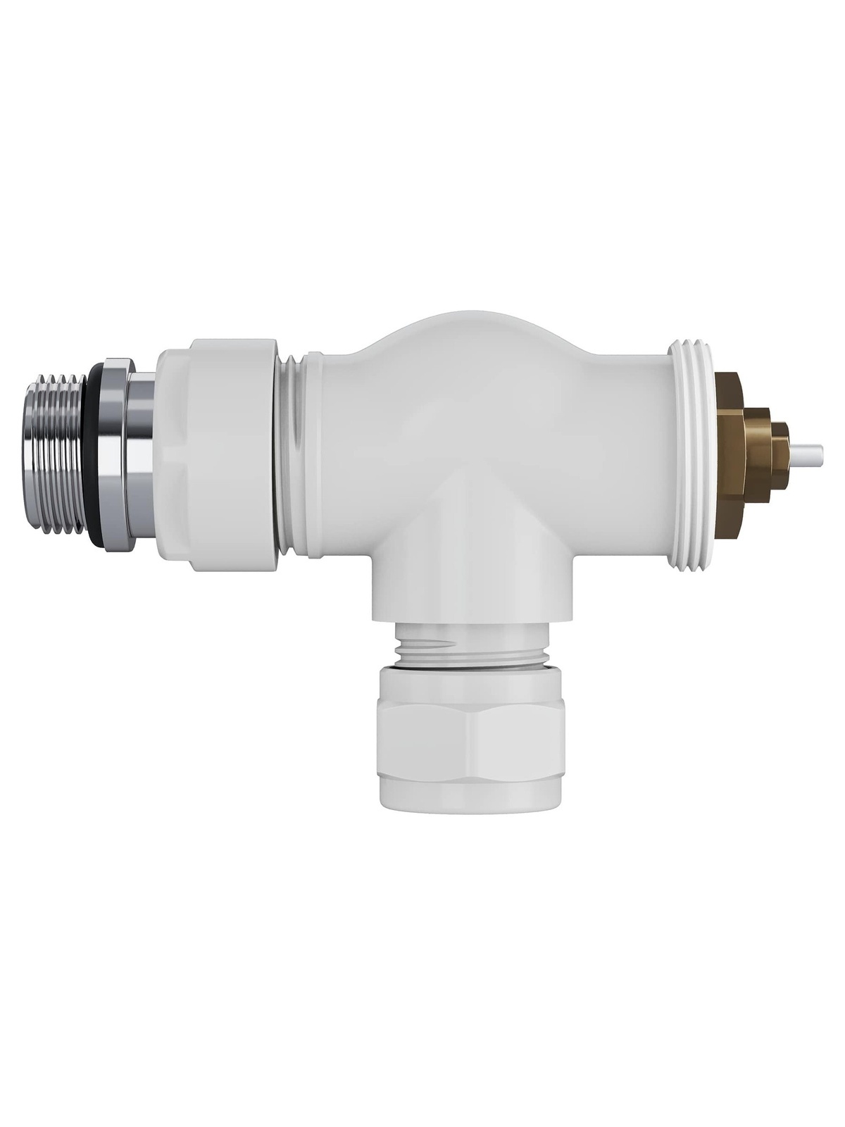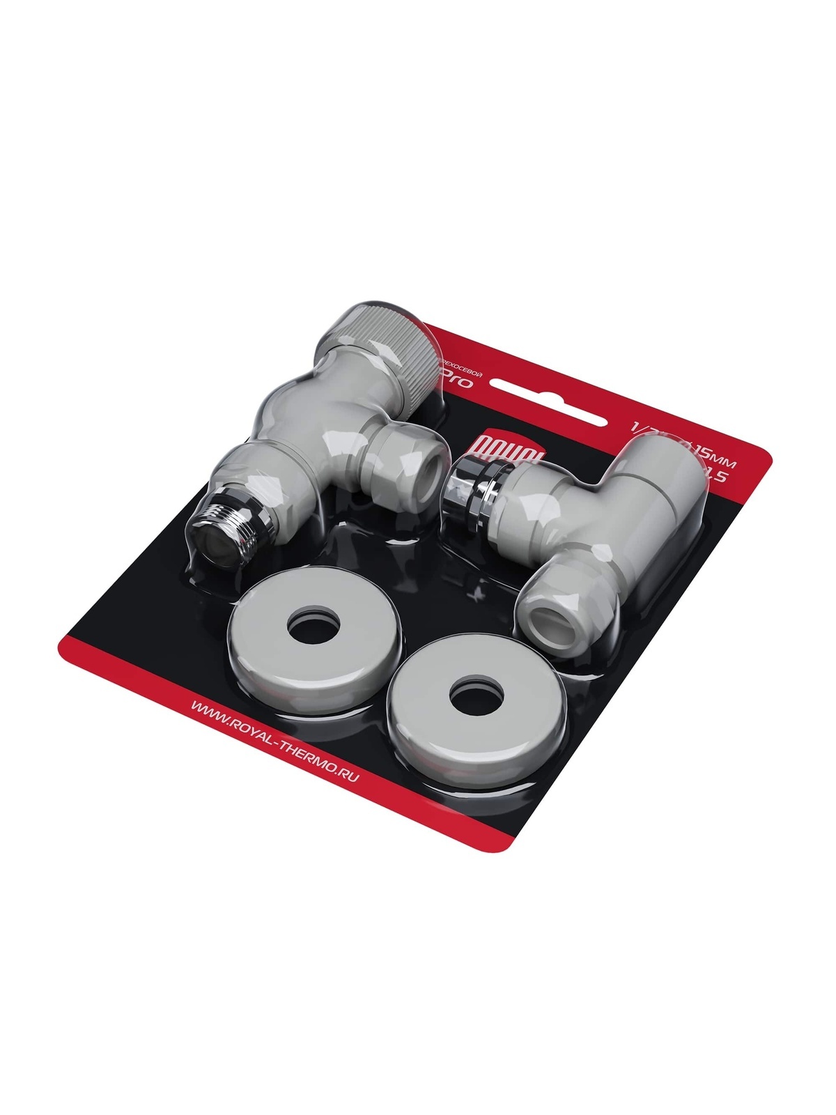 Термостатические наборы серии Design Pro поставляется в необходимой для чистового монтажа комплектации: клапан термостатический для установки на подающий трубопровод, запорный клапан для установки на обратный трубопровод, 2 гайки-фитинга для подключения клапанов к монтажной трубке 15 мм и 2 цельных латунных отражателя с внутренним резиновым уплотнением внутренним диаметром 15,2 мм.