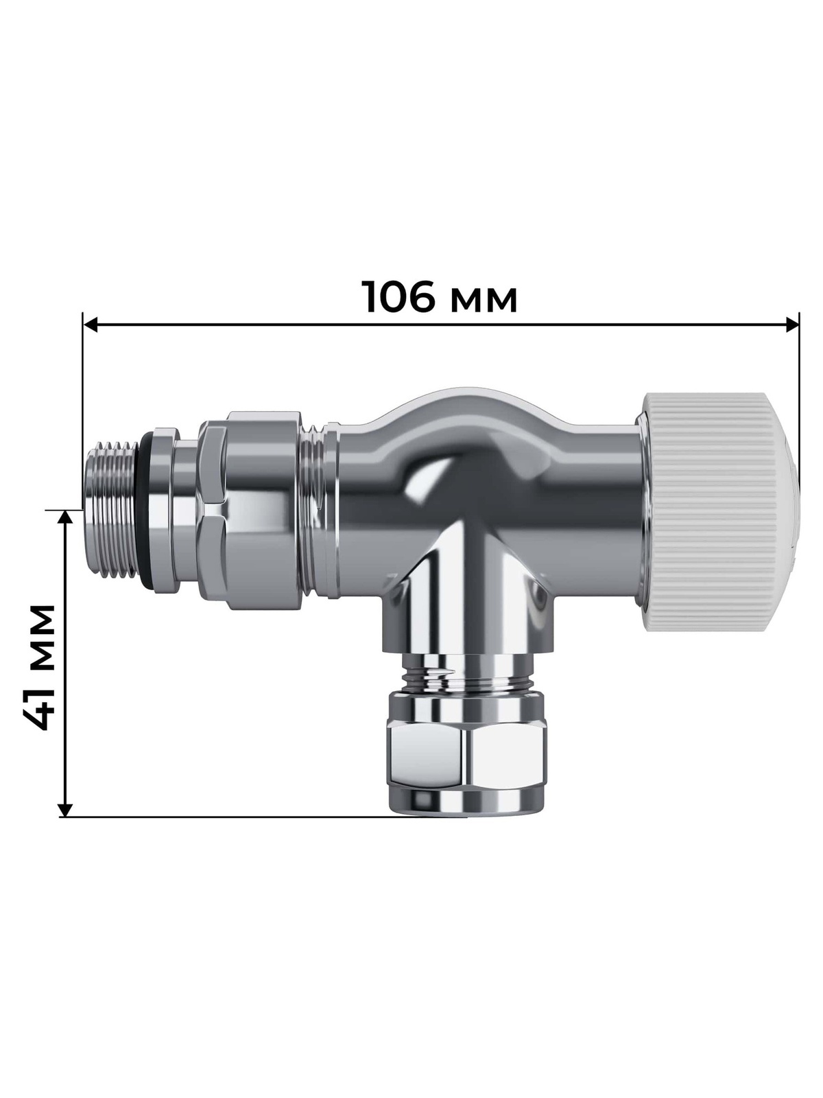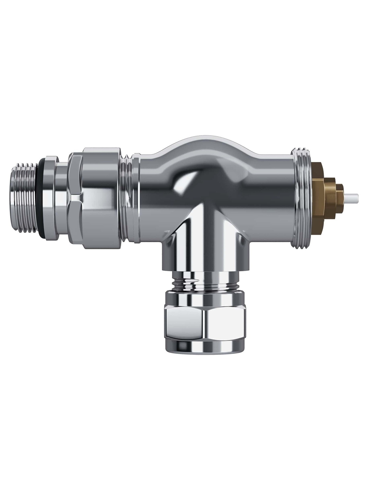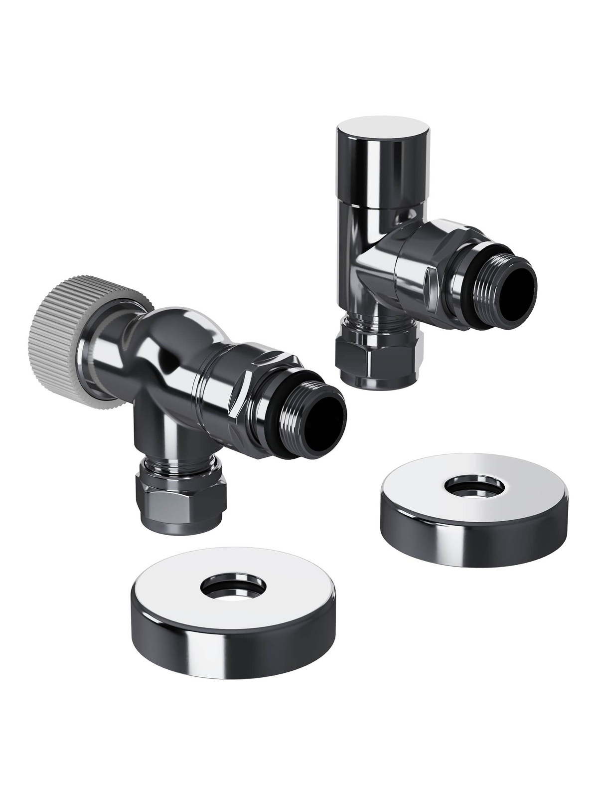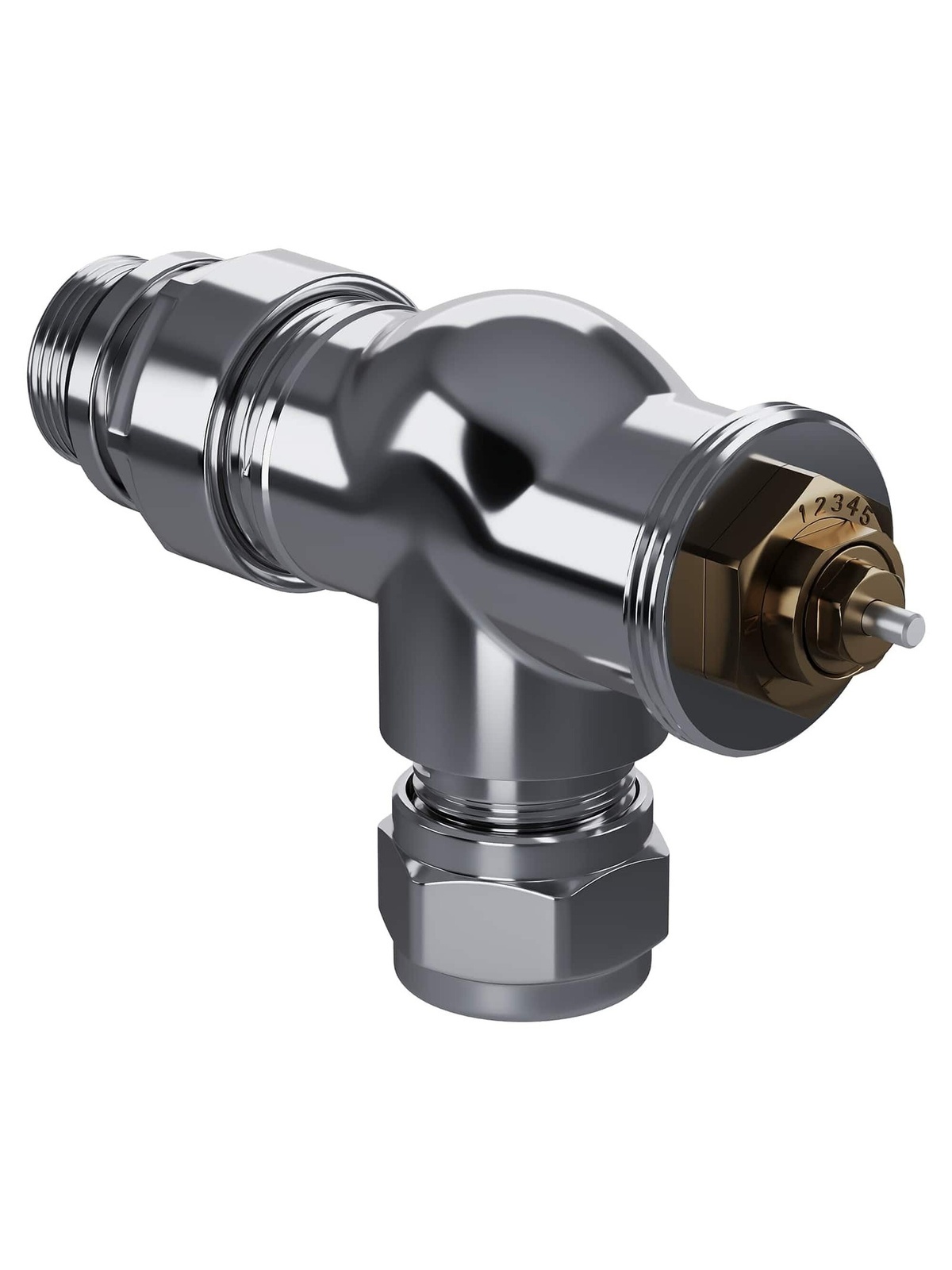 Термостатические наборы серии Design Pro поставляется в необходимой для чистового монтажа комплектации: клапан термостатический для установки на подающий трубопровод, запорный клапан для установки на обратный трубопровод, 2 гайки-фитинга для подключения клапанов к монтажной трубке 15 мм и 2 цельных латунных отражателя с внутренним резиновым уплотнением внутренним диаметром 15,2 мм.