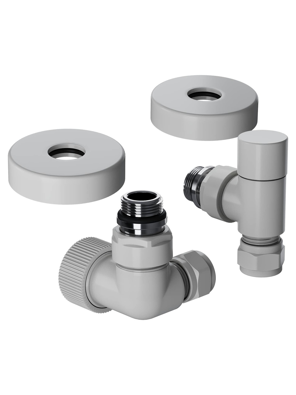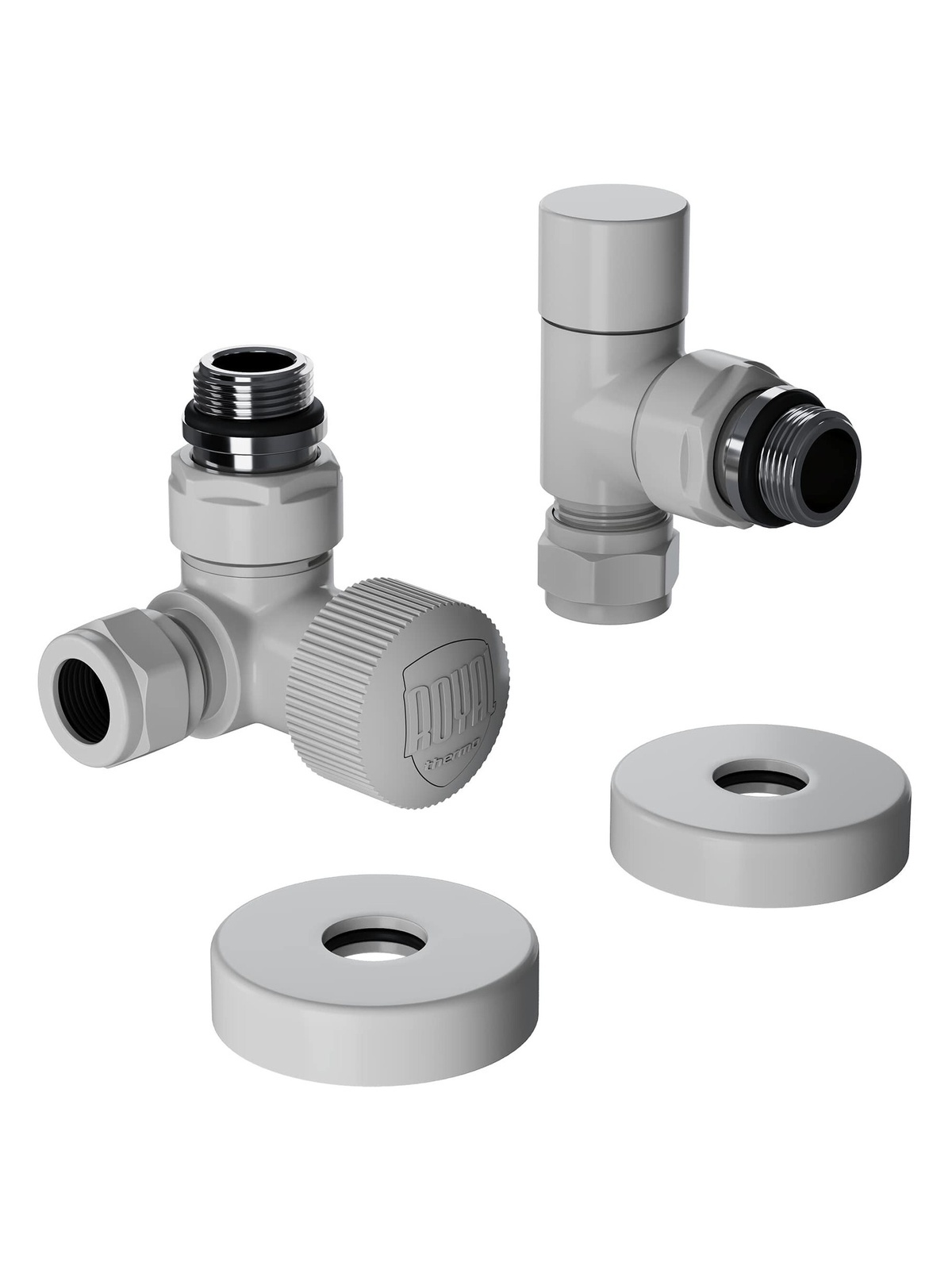 Термостатические наборы серии Design Pro поставляется в необходимой для чистового монтажа комплектации: клапан термостатический для установки на подающий трубопровод, запорный клапан для установки на обратный трубопровод, 2 гайки-фитинга для подключения клапанов к монтажной трубке 15 мм и 2 цельных латунных отражателя с внутренним резиновым уплотнением внутренним диаметром 15,2 мм.