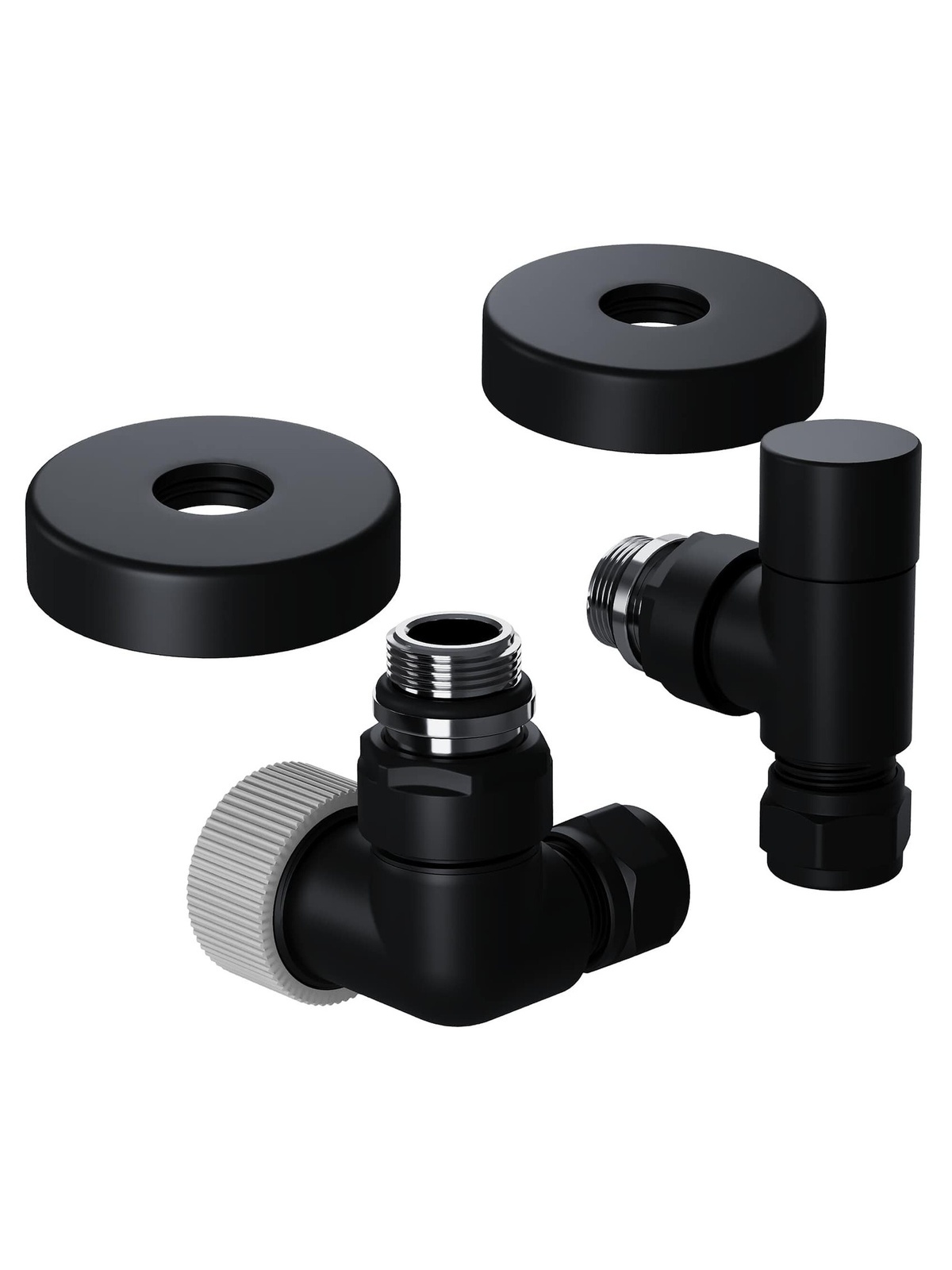 Термостатические наборы серии Design Pro поставляется в необходимой для чистового монтажа комплектации: клапан термостатический для установки на подающий трубопровод, запорный клапан для установки на обратный трубопровод, 2 гайки-фитинга для подключения клапанов к монтажной трубке 15 мм и 2 цельных латунных отражателя с внутренним резиновым уплотнением внутренним диаметром 15,2 мм.