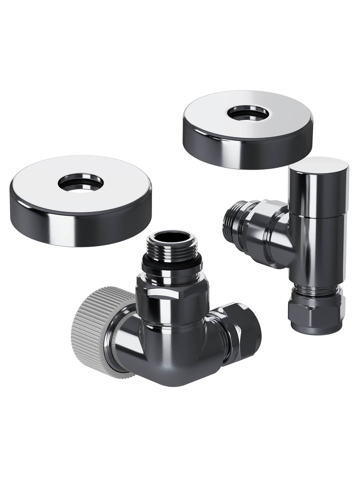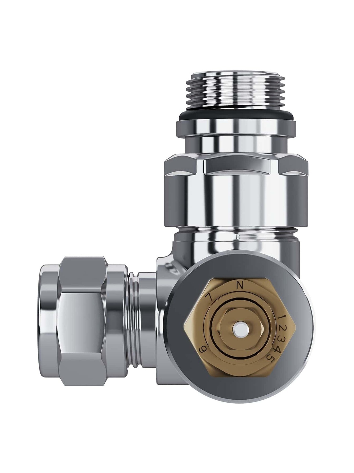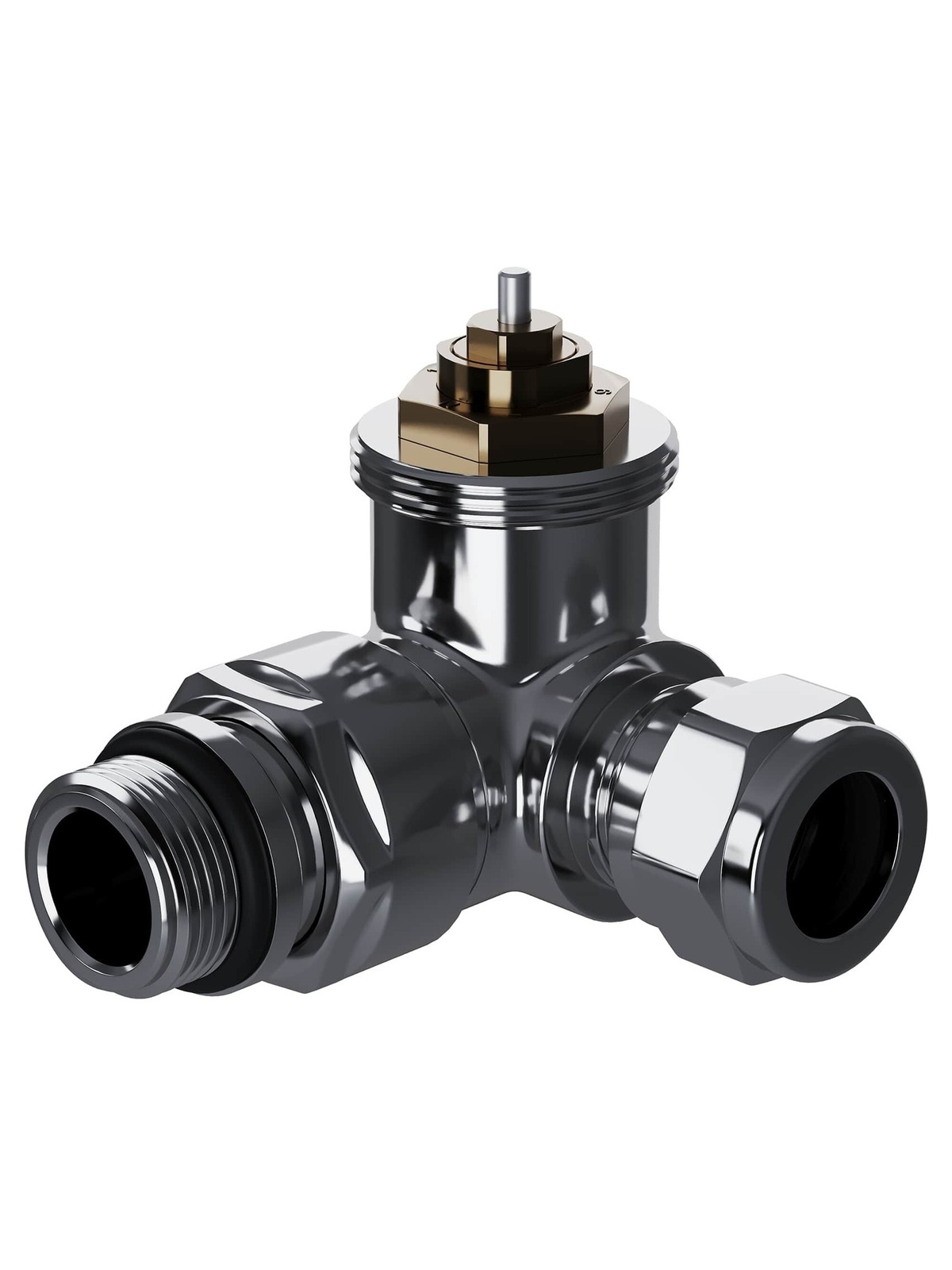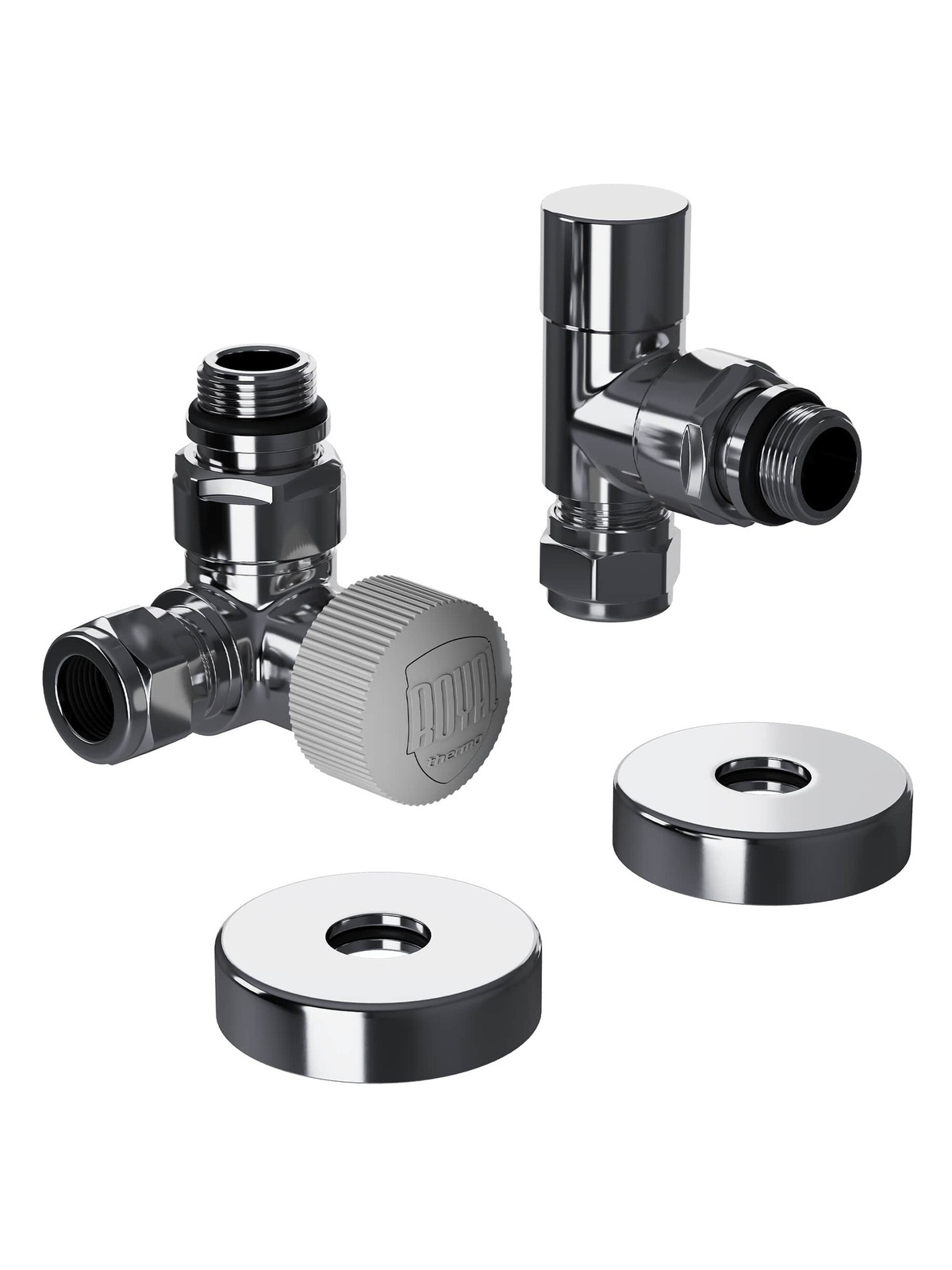 Термостатические наборы серии Design Pro поставляется в необходимой для чистового монтажа комплектации: клапан термостатический для установки на подающий трубопровод, запорный клапан для установки на обратный трубопровод, 2 гайки-фитинга для подключения клапанов к монтажной трубке 15 мм и 2 цельных латунных отражателя с внутренним резиновым уплотнением внутренним диаметром 15,2 мм.