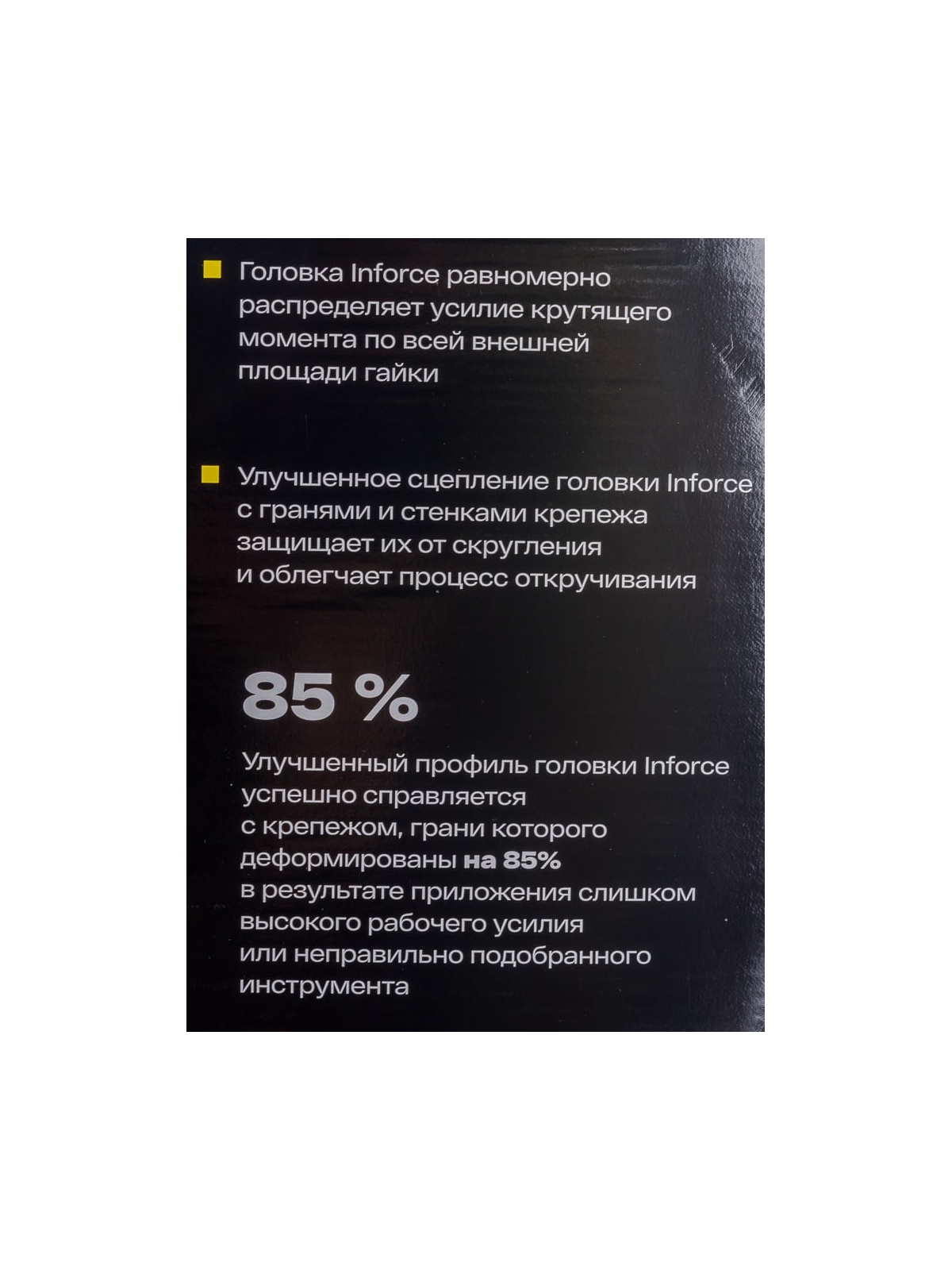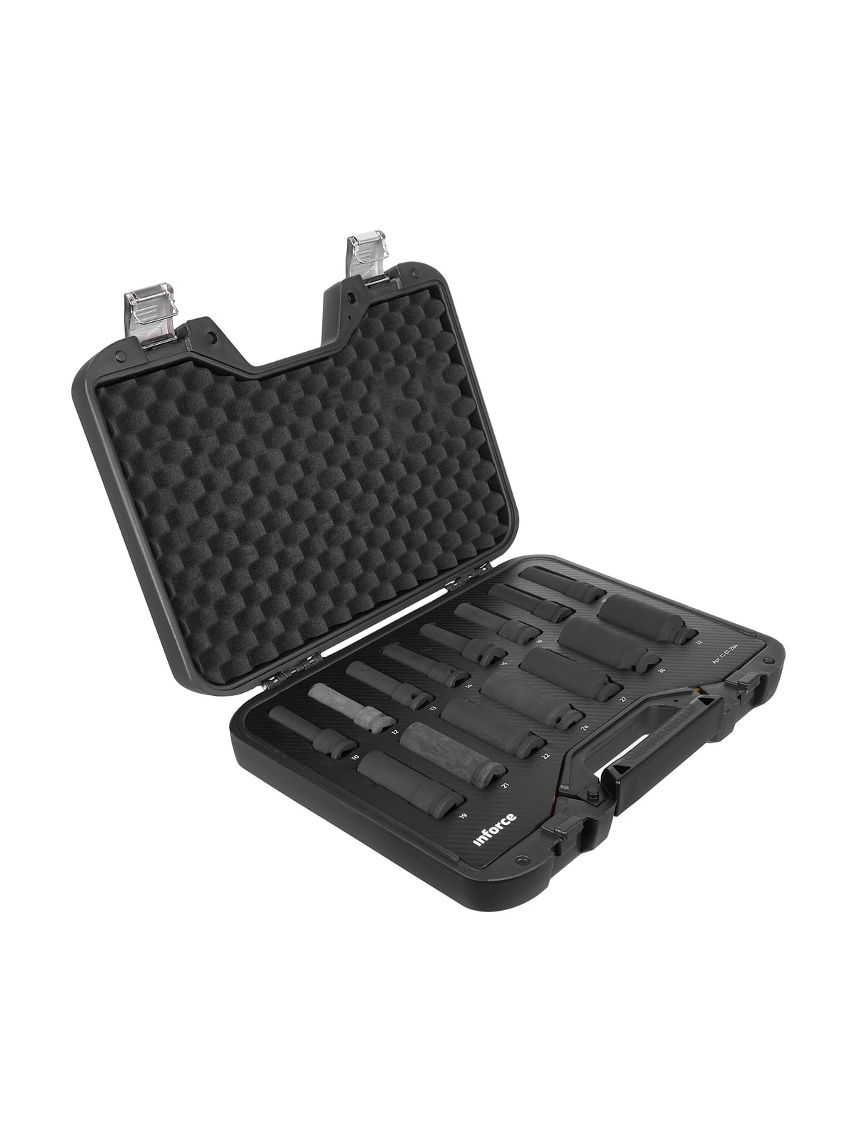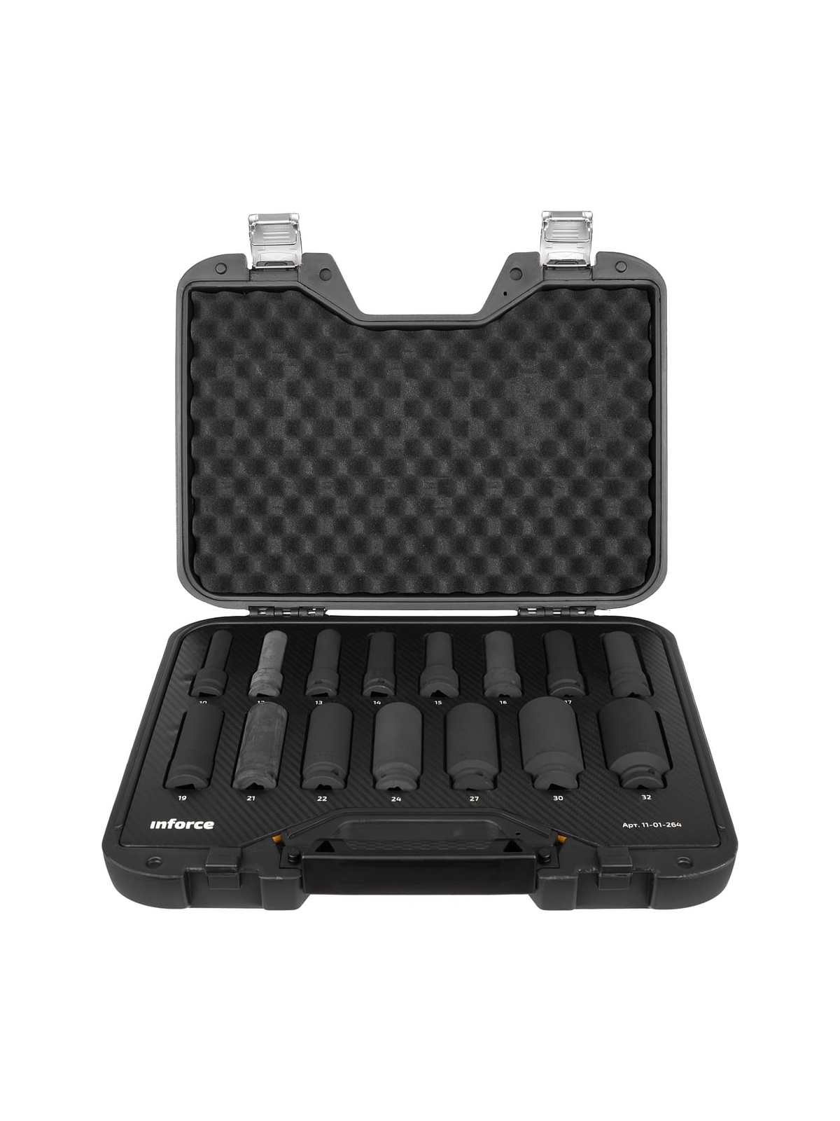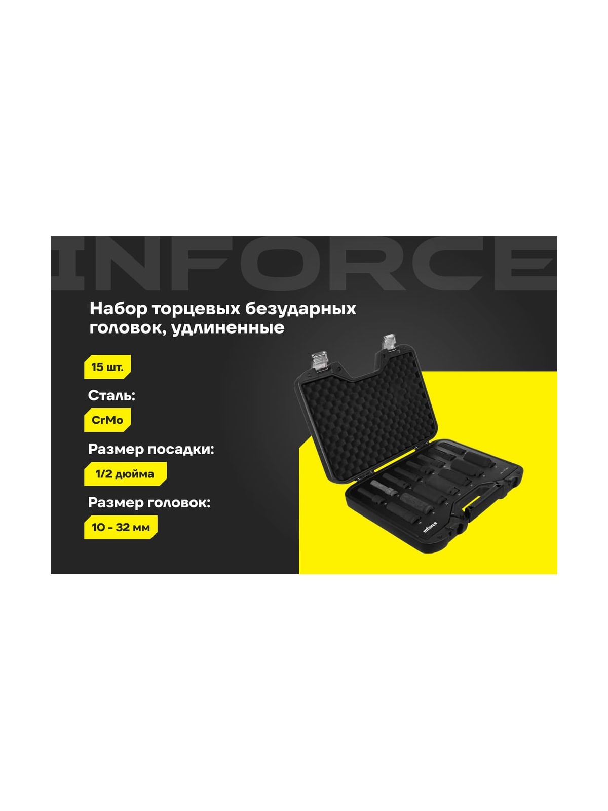 Набор торцевых ударных удлиненных головок Inforce 11-01-264 предназначен для ударных гайковертов. Применяется для работы с крепежом. В наборе 15 предметов. Головки изготовлены из хром-молибденовой стали. Улучшенный профиль головок успешно справляется с крепежом, грани которого деформированы на 85%.