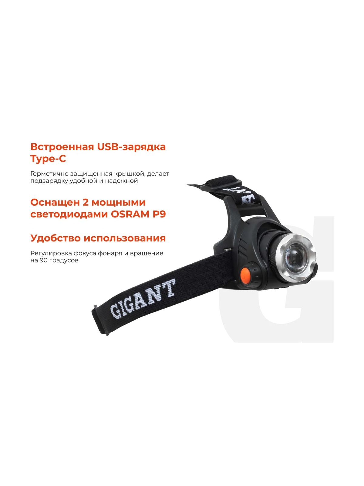 Налобный фонарь Gigant с регулируемым фокусом HL-10 отличается высокой мощностью и экономичностью освещения. Он питается от двух литий-ионных аккумуляторов типа 18650, которые поставляются в комплекте. Фокус фонаря можно изменять, выбирая между дальним направленным лучом и ближним широким светом. Также можно регулировать наклон фонаря. В комплекте мягкий эластичный ремешок с брендированием и возможностью регулировки размера. Корпус фонаря изготовлен из алюминия, устойчивого к механическим повреждениям, царапинам, сколам. Фонарь защищен по стандарту IPX4, благодаря чему не боится брызг воды, пыли и падений. Встроенная USB-зарядка Type-C, герметично защищенная крышкой, делает подзарядку удобной и надежной. Регулировка фокуса фонаря, а также его вращение на 90 градусов позволяет направить луч света туда, куда нужно. Мощный светодиод имеет световой поток 250 Лм и светит на расстояние до 100 м. 4 режима работы позволят настроить фонарь под разные условия: мощность 100%, 50%, стробоскоп, сигнал SOS. Дополнительные характеристики: Тип и емкость батареи: 18650 (3,7 В, 1200 мАч) - 2 шт. Время зарядки: 2-3 часа. Размер: 3,5 * 5,5 см. Индикатор зарядки: красный свет - идёт зарядка, желтый свет - устройство заряжено.