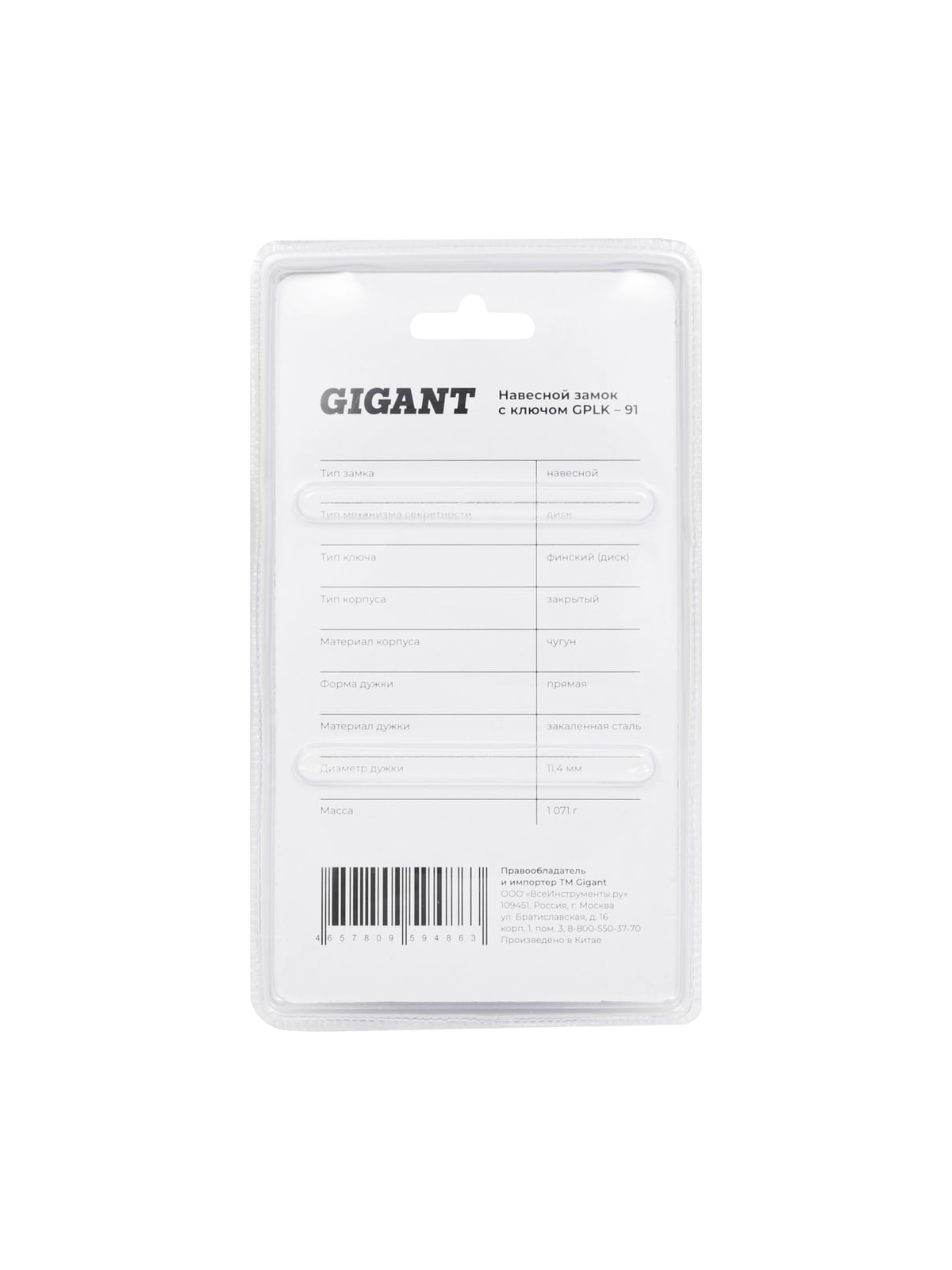 Навесной замок с ключом Gigant GPLK-91 используют для гаражных дверей. Механизм П-образной формы выполнен из прочного металла. Корпус полностью закрывает запорный штырь из закаленной стали, исключая возможность спиливания. В комплект поставки входят 3 ключа финского типа с уникальным кодом.