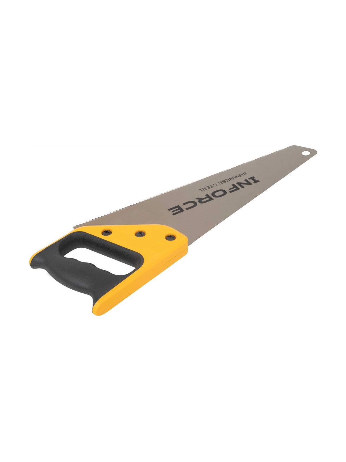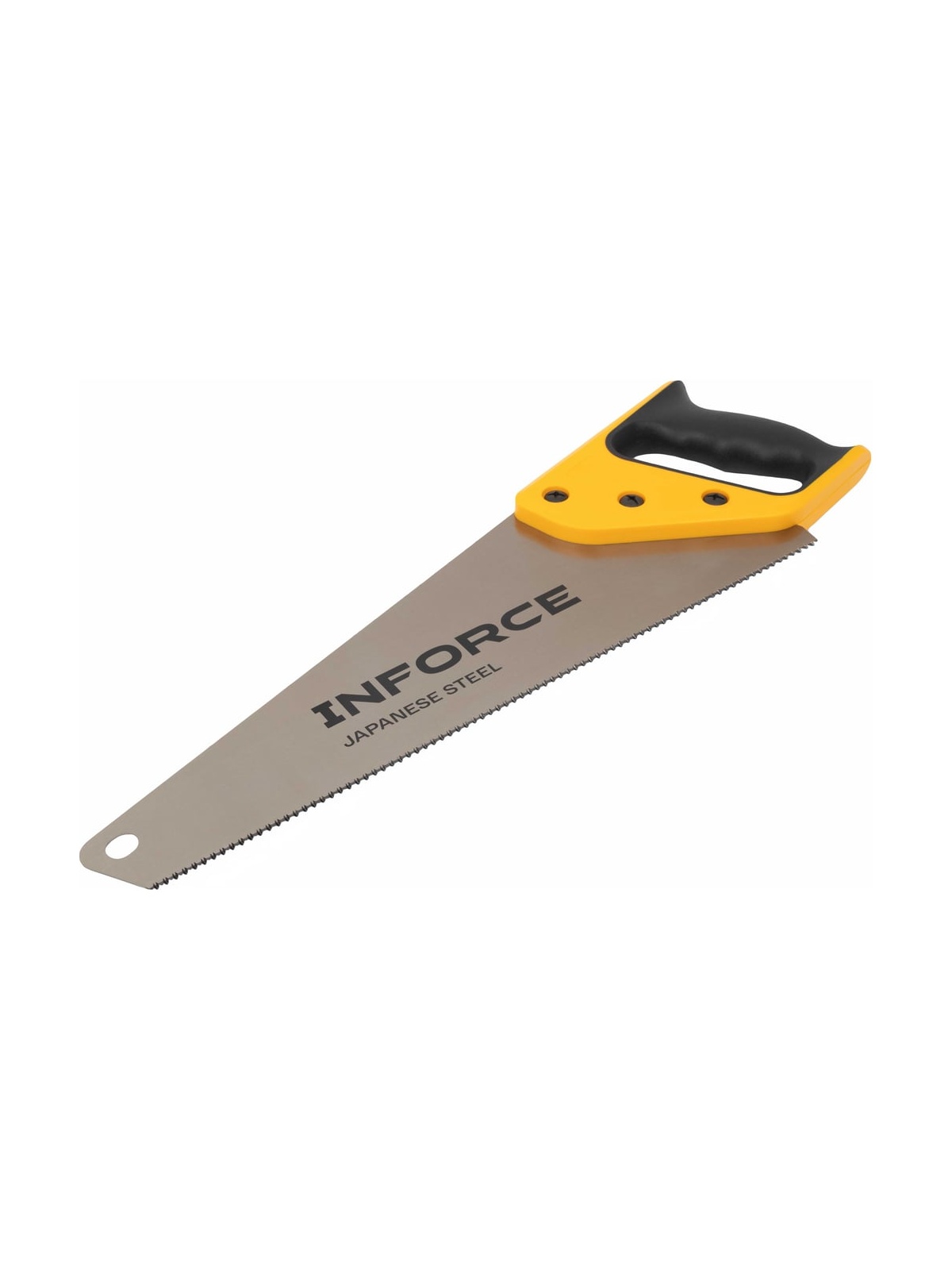 Ножовка по дереву Inforce 11-12 TPI, 400 мм 06-08-28 служит для продольного и поперечного распила заготовок из древесины. Двухкомпонентная рукоятка обеспечивает удобный хват и максимальный контроль инструмента во время работы. Для удобного хранения в полотне ножовки предусмотрено специальное отверстие для подвеса.