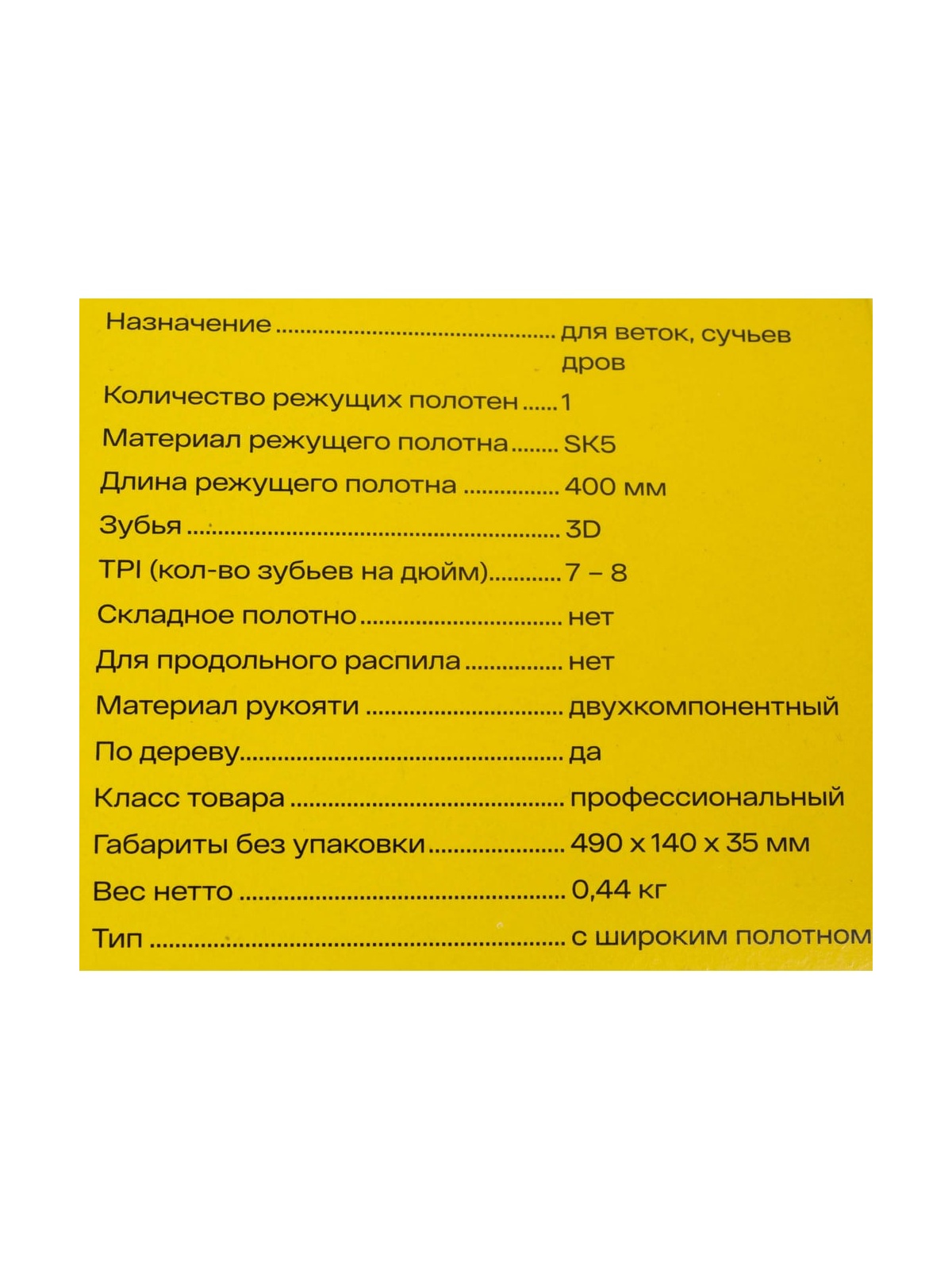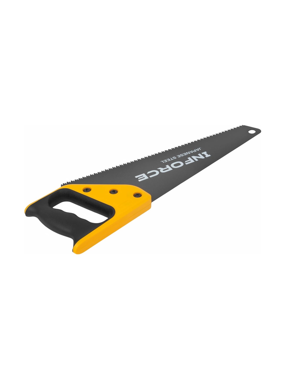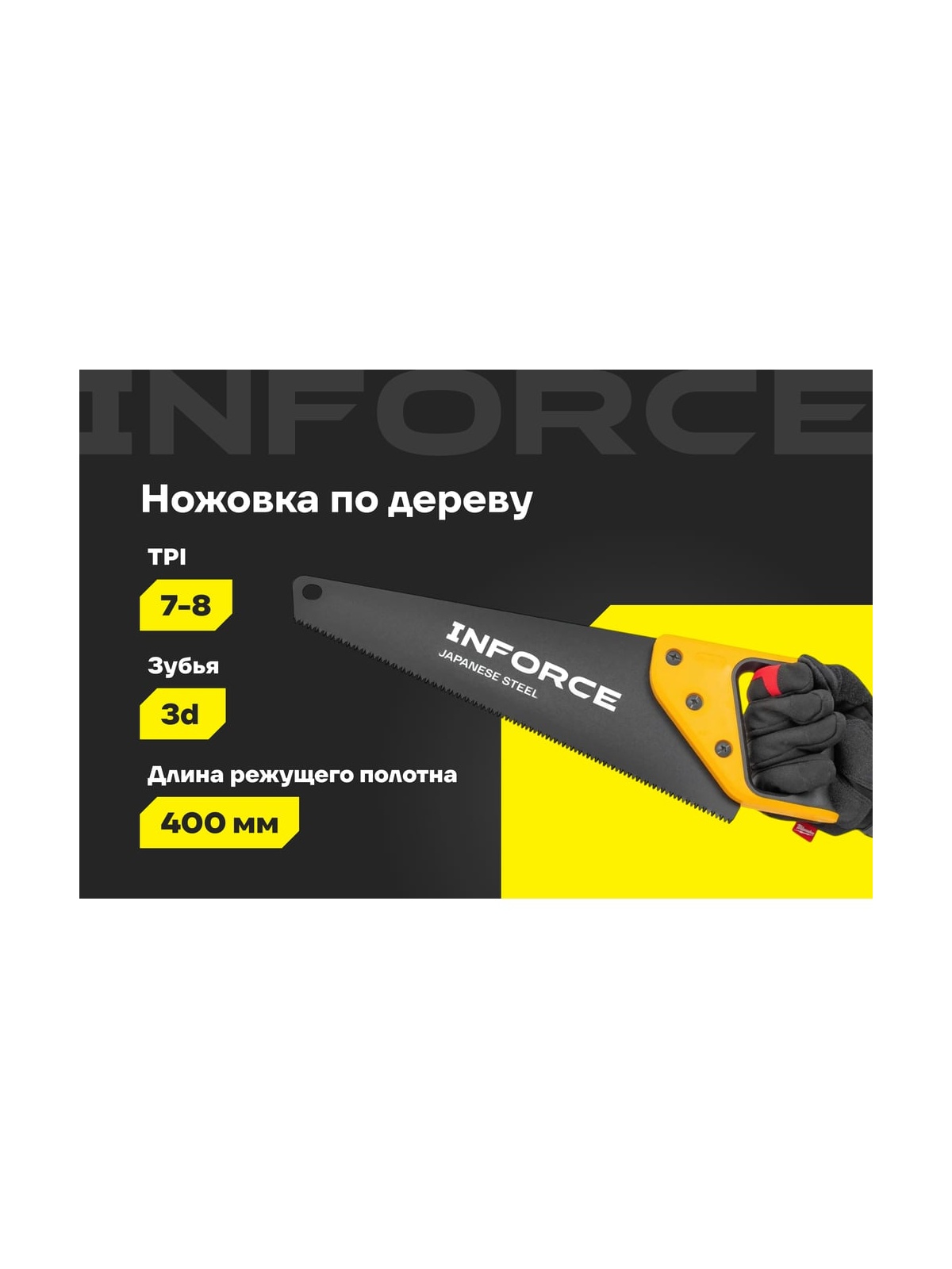 Ножовка по дереву Inforce 7-8 TPI, 400 мм 06-08-29 представляет собой профессиональный инструмент, предназначенный для работы с деревом. Она оснащена широким полотном длиной 400 мм, что делает её идеальной для распила веток, сучьев и дров. Режущее полотно изготовлено из высококачественной стали SK5, обеспечивающей долговечность и надежность в эксплуатации. Зубья с 3D профилем и плотностью 7-8 TPI способствуют эффективному и быстрому распилу, минимизируя усилия пользователя. Двухкомпонентная рукоять обеспечивает удобный и надежный хват, что особенно важно при длительной работе.