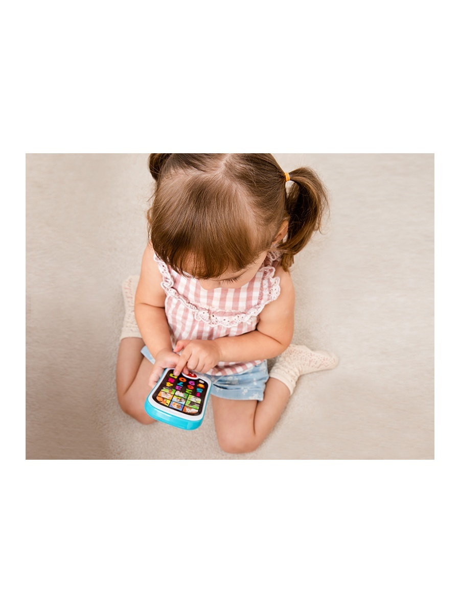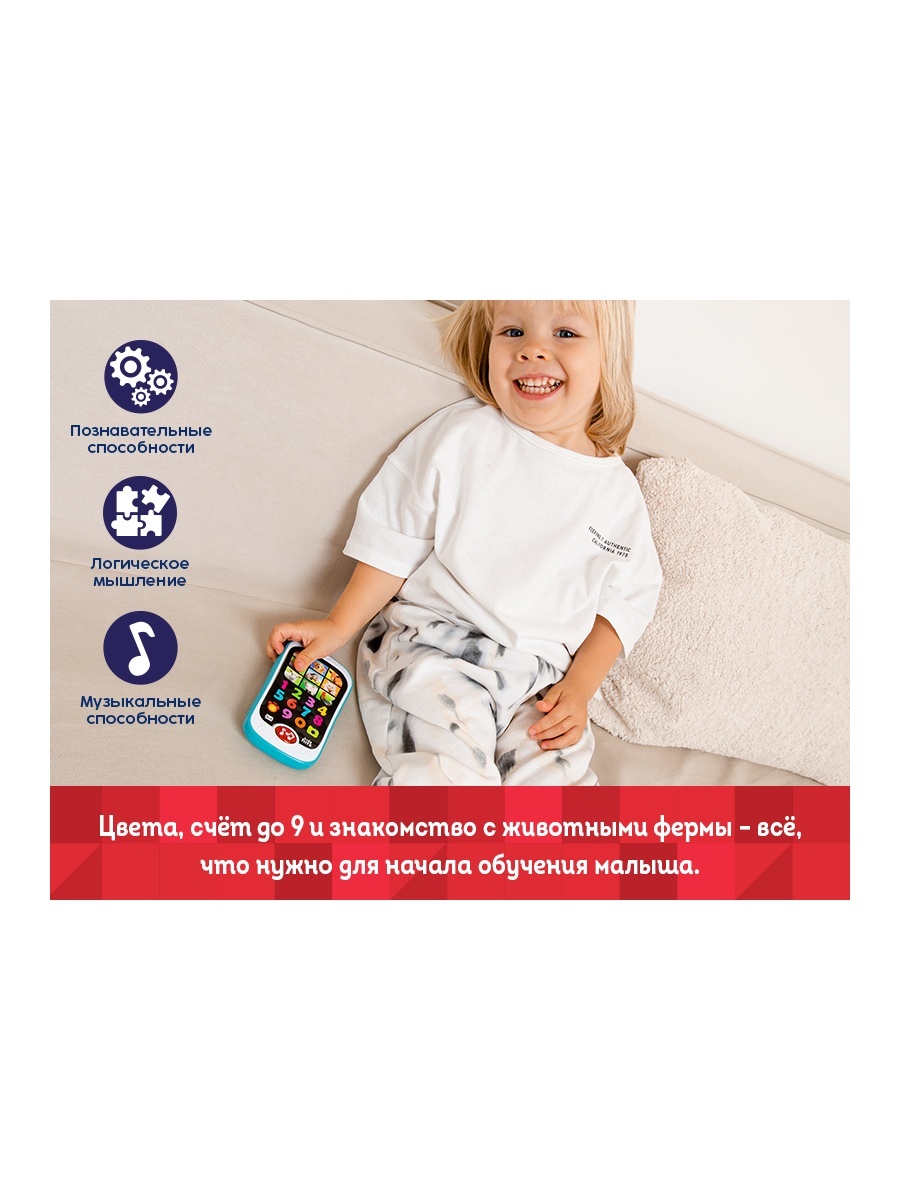 Смартфончик предлагает 9 реалистичных звуков животных, каждый из которых не только развлекает, но и способствует запоминанию. А 9 забавных миксов и 10 веселых песенок дополнительно развивают музыкальные способности малыша, пробуждая в нем любовь к творчеству.