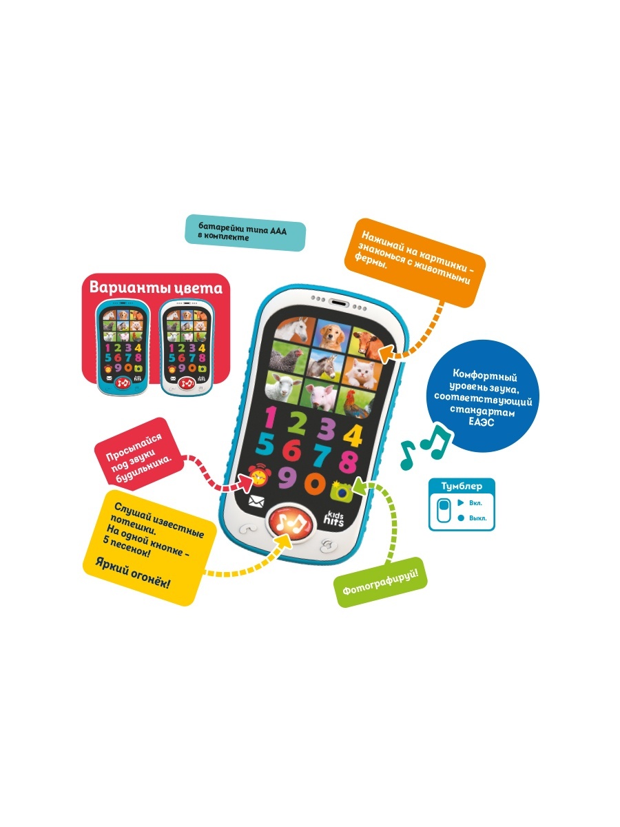 С помощью данной игрушки малыш сможет не только развивать познавательные и логические навыки, но и совершенствовать свои коммуникативные способности в процессе взаимодействия с яркими персонажами и звучащими мелодиями. Просыпайтесь под веселые будильники, фотографируйте яркие моменты и наслаждайтесь обучением в игре с Kids Hits Смартфончиком Ферма!