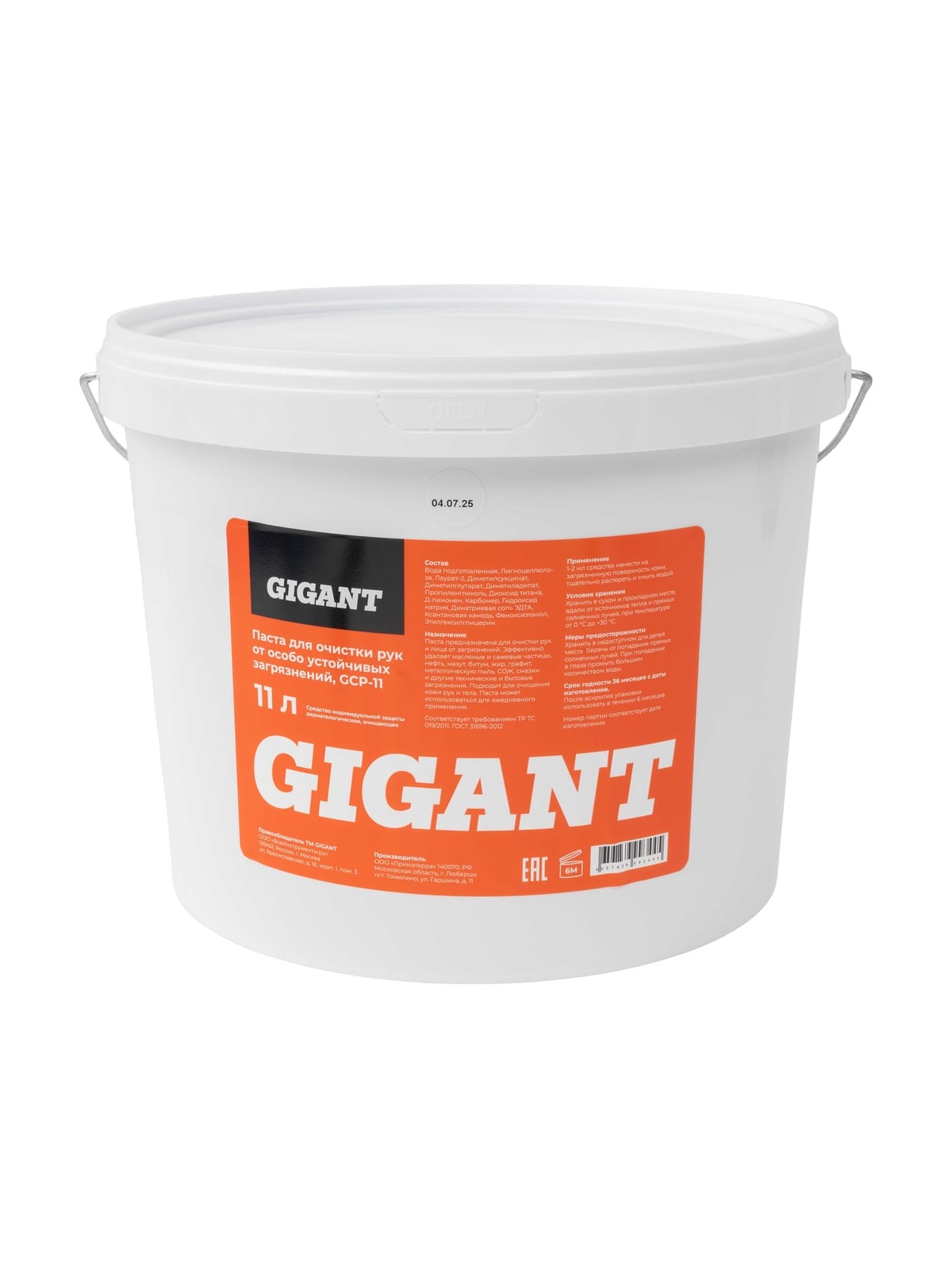 Паста Gigant ведро 11 л GCP-11 предназначена для безопасной и эффективной очистки рук во время или после работ, связанных с особо устойчивыми загрязнениями, такими как: высоковязкие продукты нефтепереработки (битум, гудрон и др.), смолы, лакокрасочные материалы, монтажная пена, а также типографская краска, масло, грязь, жир, металлическая пыль, антикоррозийные материалы и др. Соответствует требованиям ТР ТС 019/2011 и ГОСТ 31696-2012.