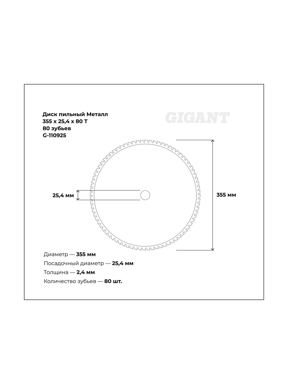 Пильный диск Металл 355x25.4x80T 80 зубьев Gigant G-110925 применяется при работе с заготовками из мягкой конструкционной стали и алюминия толщиной до 10 мм. Осуществляет ровный чистый рез, не нагревая края металла и практически не образуя искр. Не требует дополнительного охлаждения. Пильный диск оснащен твердосплавными зубьями из карбида вольфрама.