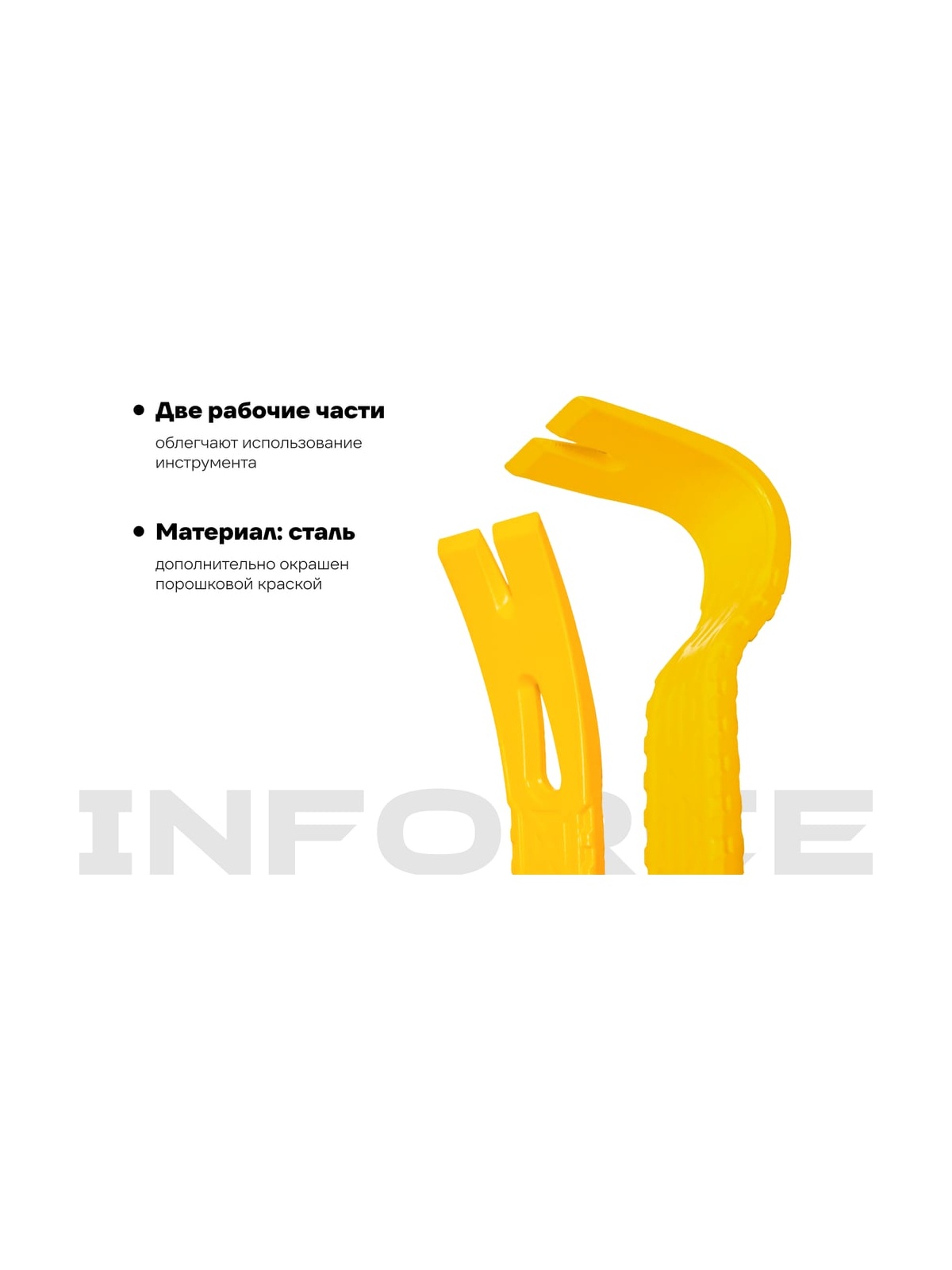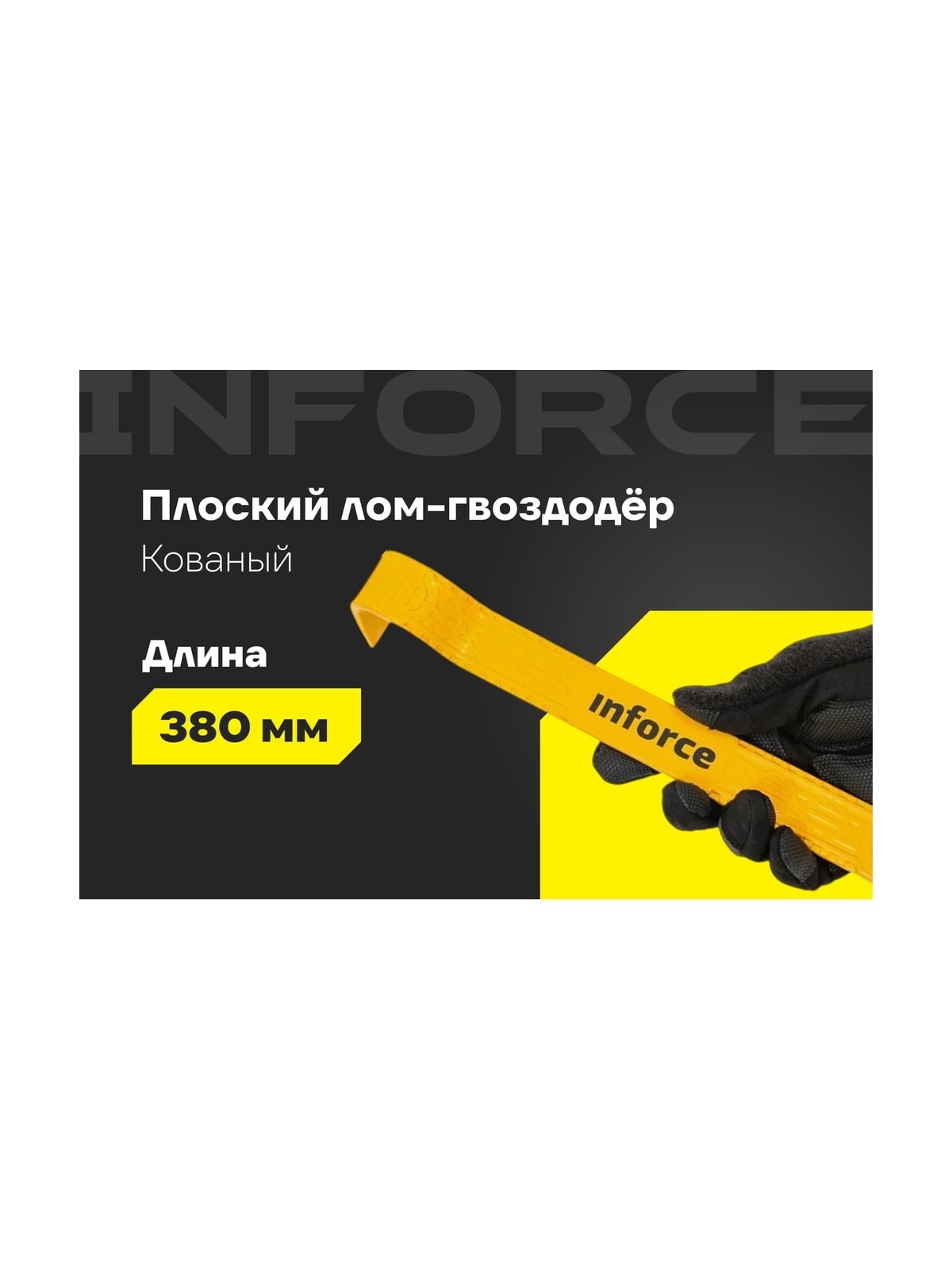 Плоскопрофильный лом-гвоздодер Inforce 380x35x8мм 06-16-29 выполнен из стали и дополнительно окрашен порошковой краской. Плоский профиль позволяет сделать общий вес инструмента меньше. Наличие нескольких рабочих зон делает гвоздодер практичным в использовании.