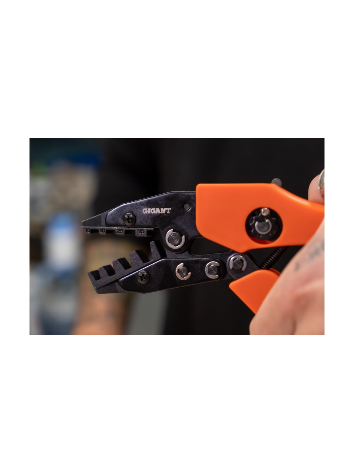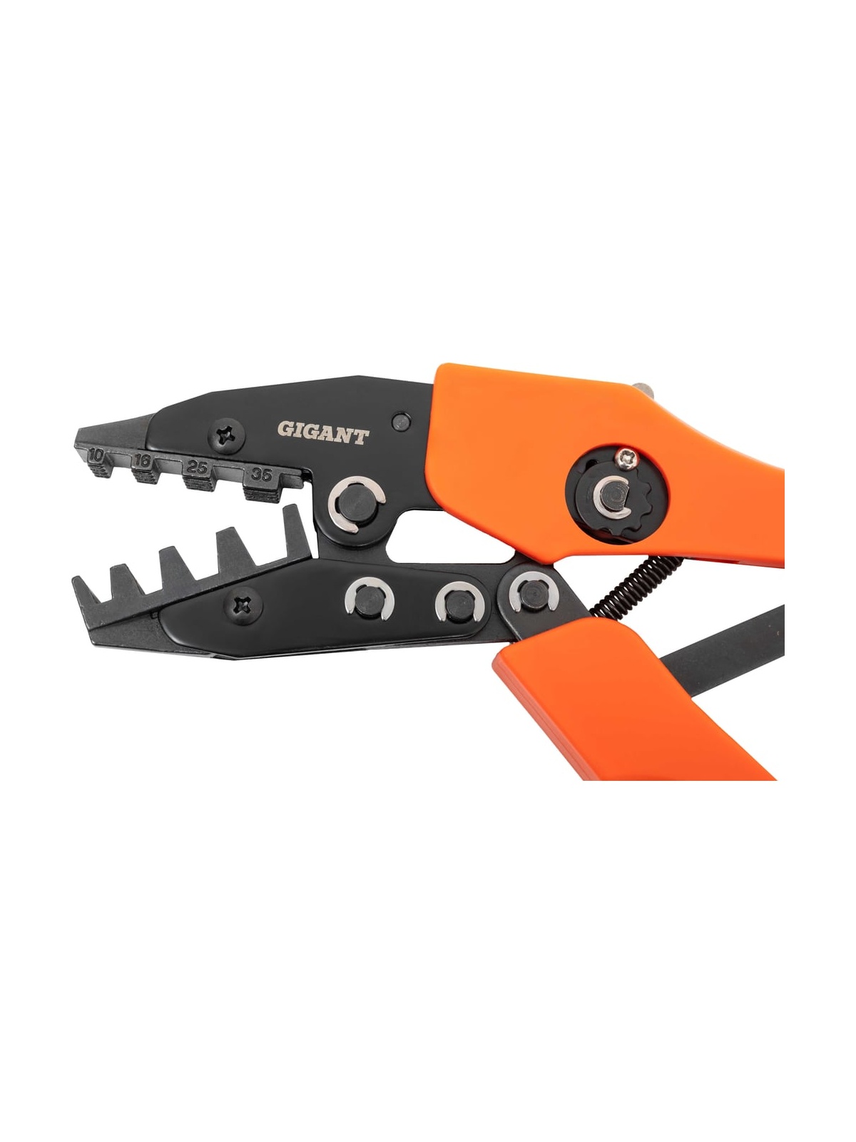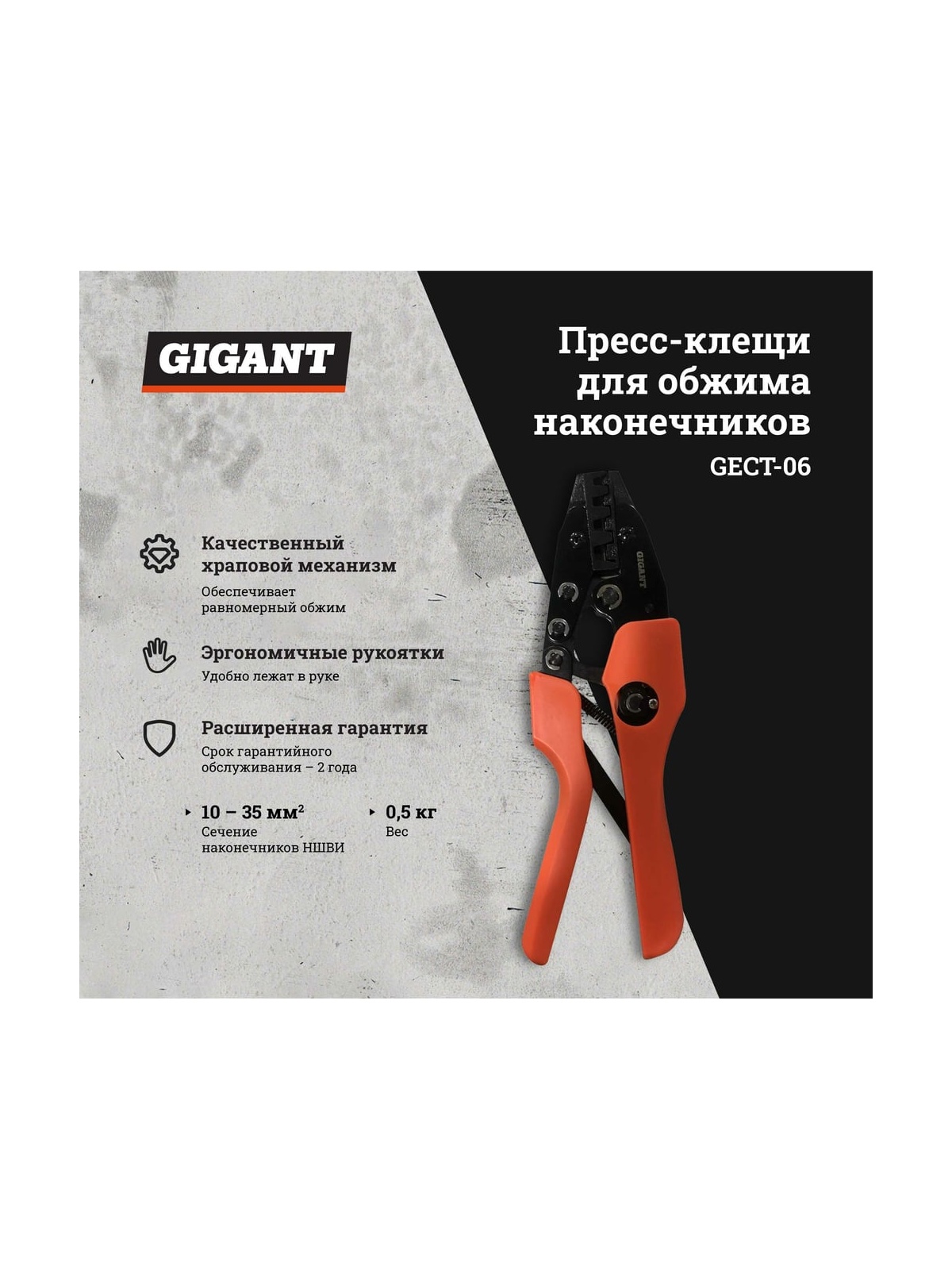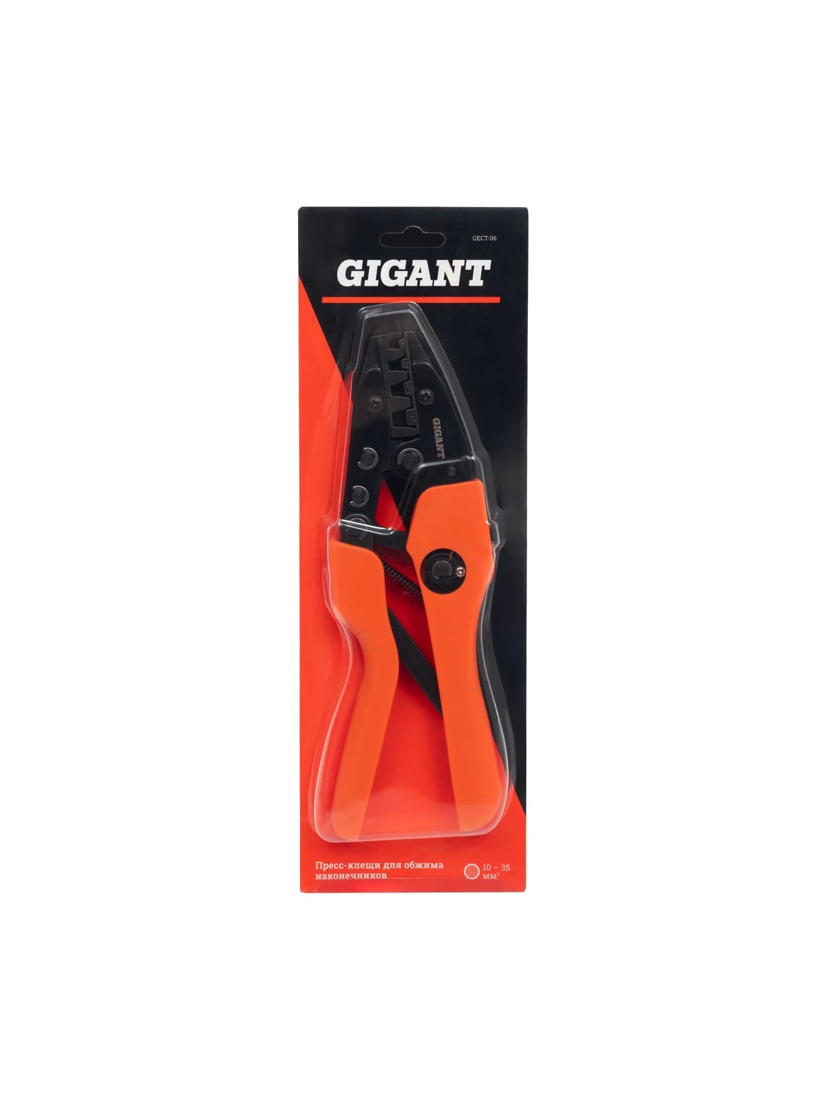 Пресс-клещи для обжима наконечников Gigant 10 - 35 мм² GECT-06 находит применение в мастерских и при прокладке различных сетей. Инструмент оборудован удобными нескользящими рукоятками, которые равномерно распределяют давление по ладони в процессе эксплуатации. Имеет эргономичные рукоятки и дополнительно оснащен храповиком для удобства обжима. Клещи поставляются с 1 комплектом матриц.