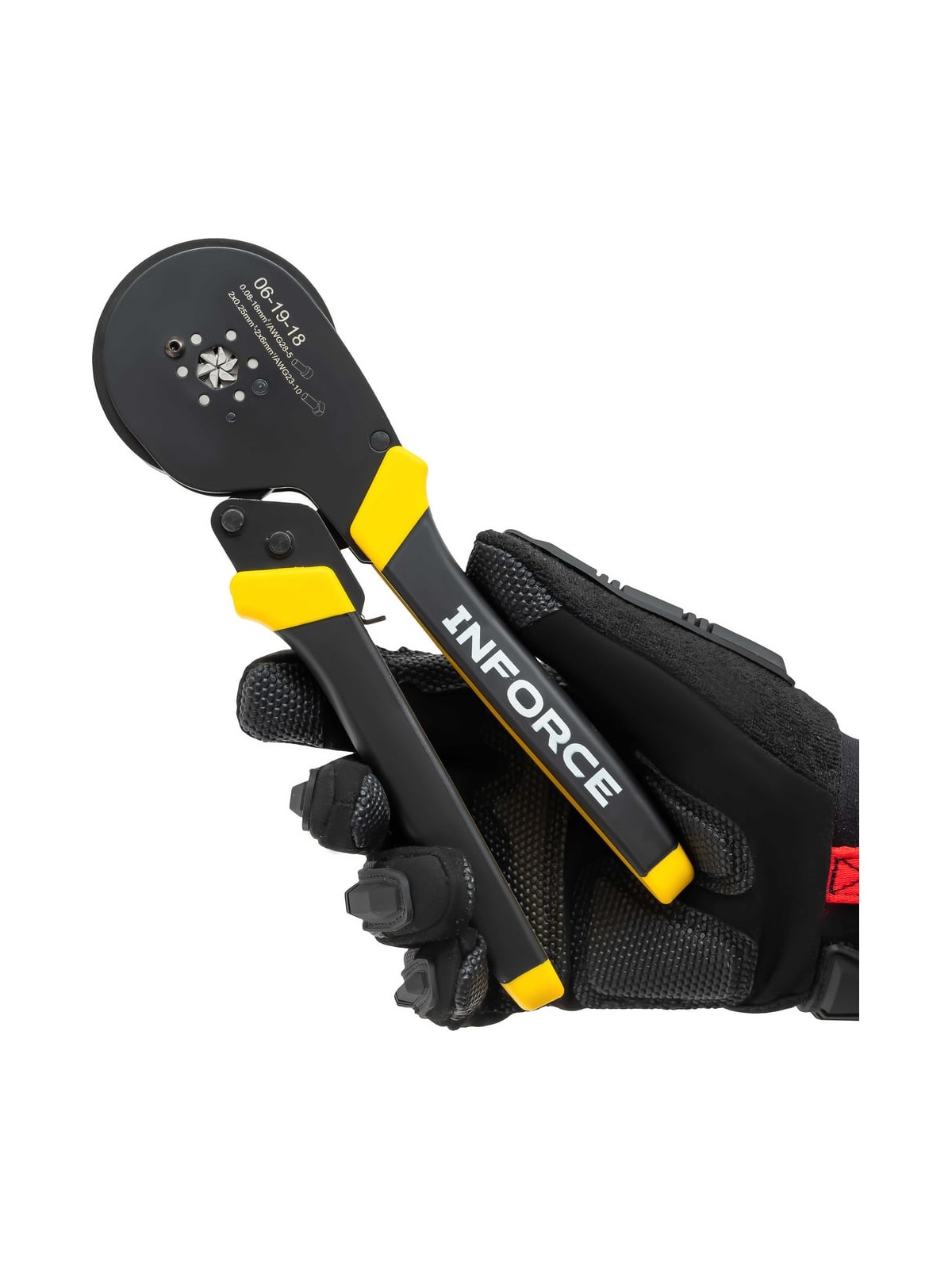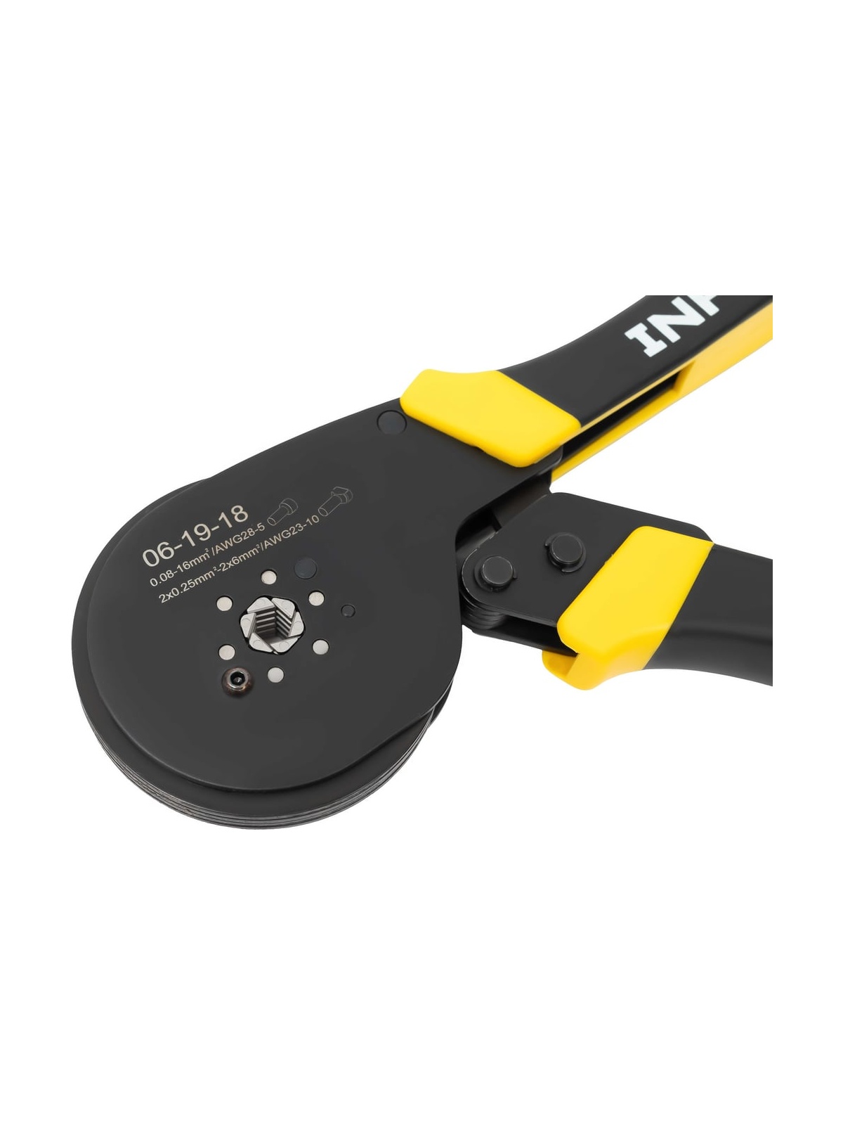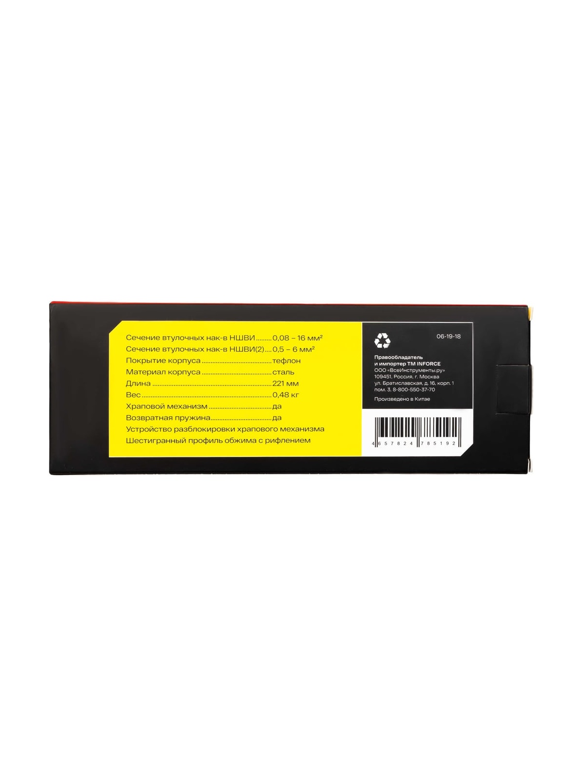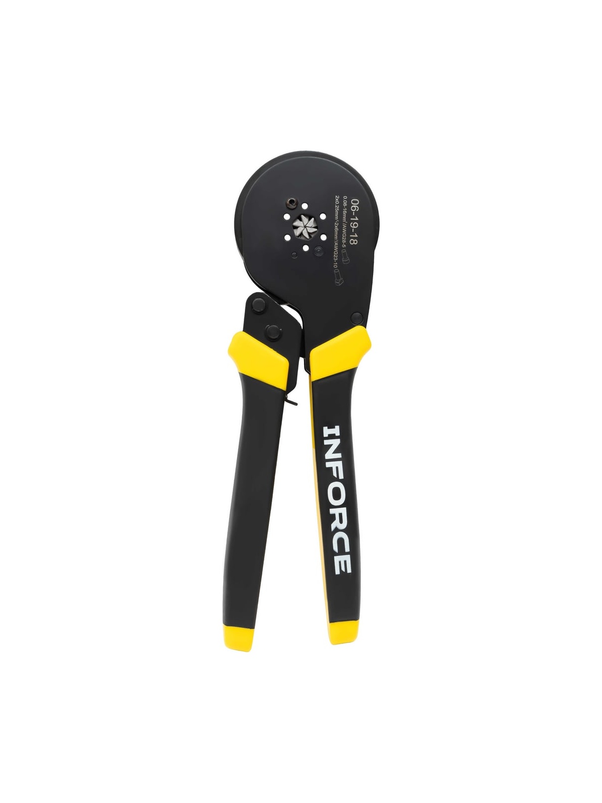 Пресс-клещи Inforce шестигранные 0,08 - 16 мм2 тефлон 06-19-18 используются для опрессовки втулочных наконечников с сечением 0,25 - 16 мм2 – как изолированных, так и неизолированных. Саморегулирующаяся матрица автоматически подстраивается под размер наконечника. Пресс-клещи Inforce предназначены для профессионального использования и выдерживают повышенные нагрузки. Прорезиненные рукоятки с упорами для пальцев обеспечивают комфортный хват и удобную работу. Тефлоновое покрытие защищает корпус от воздействия агрессивных сред и коррозии, обеспечивает долгий срок службы инструмента. Храповый механизм обеспечивает полный цикл опрессовки, гарантируя правильный обжим наконечников. Есть устройство разблокировки храпового механизма. Дополнительные характеристики: Твердость рабочих частей - 48-52 HRC Шестигранный профиль обжима с рифлением Регулятор прижимного усилия Материал корпуса: сталь Возвратная пружина Вес пресс-клещей 0,48 кг