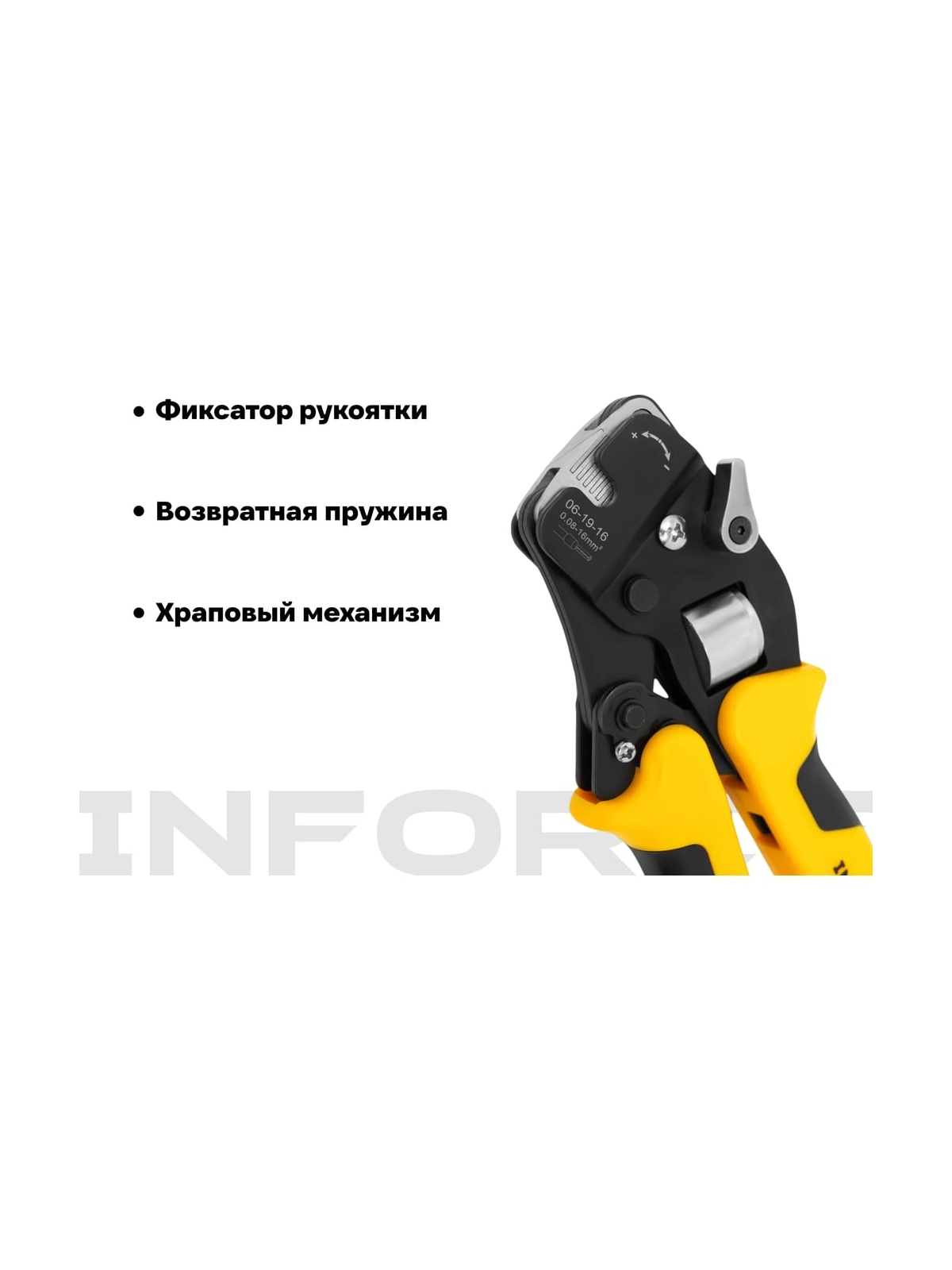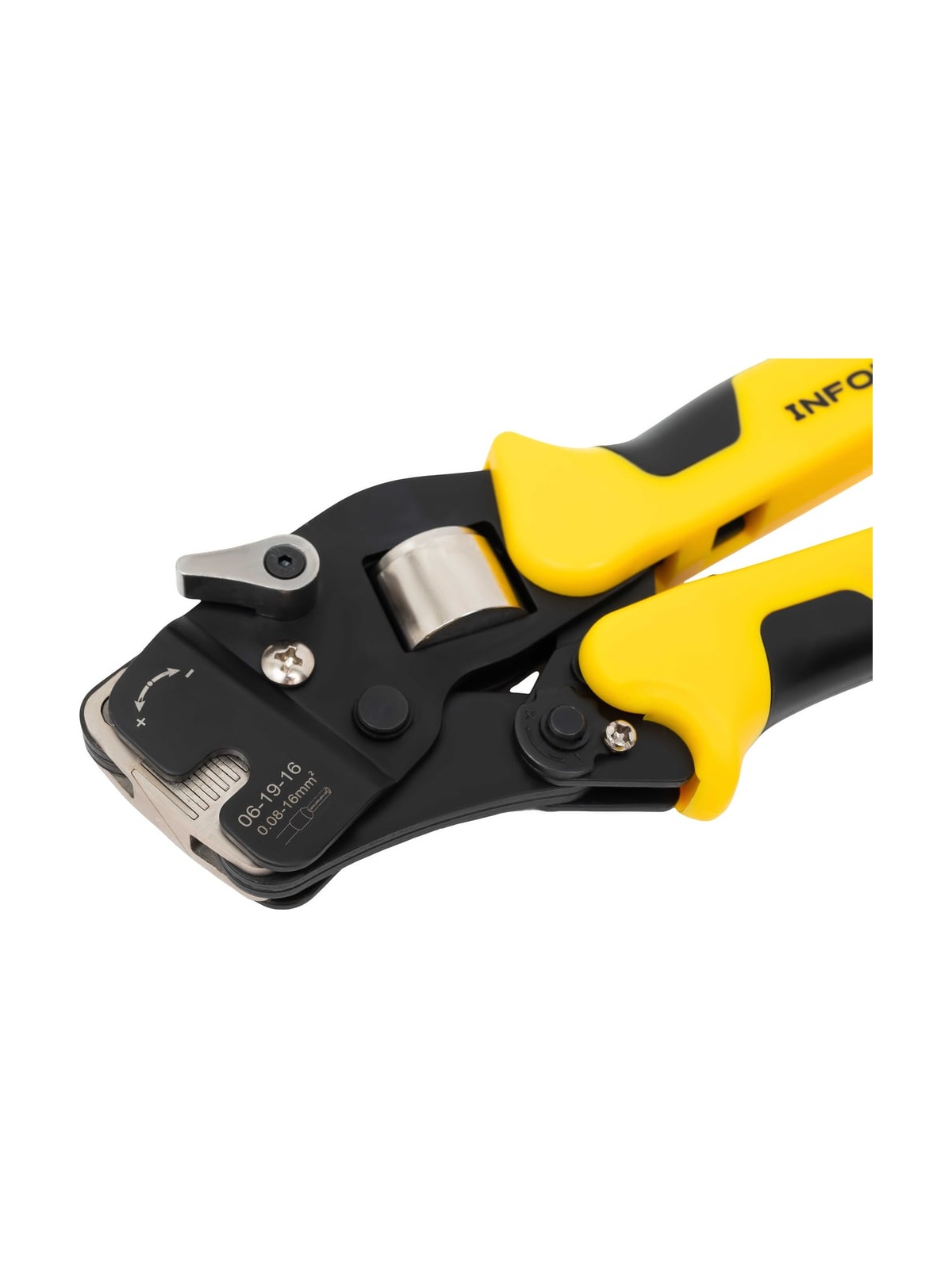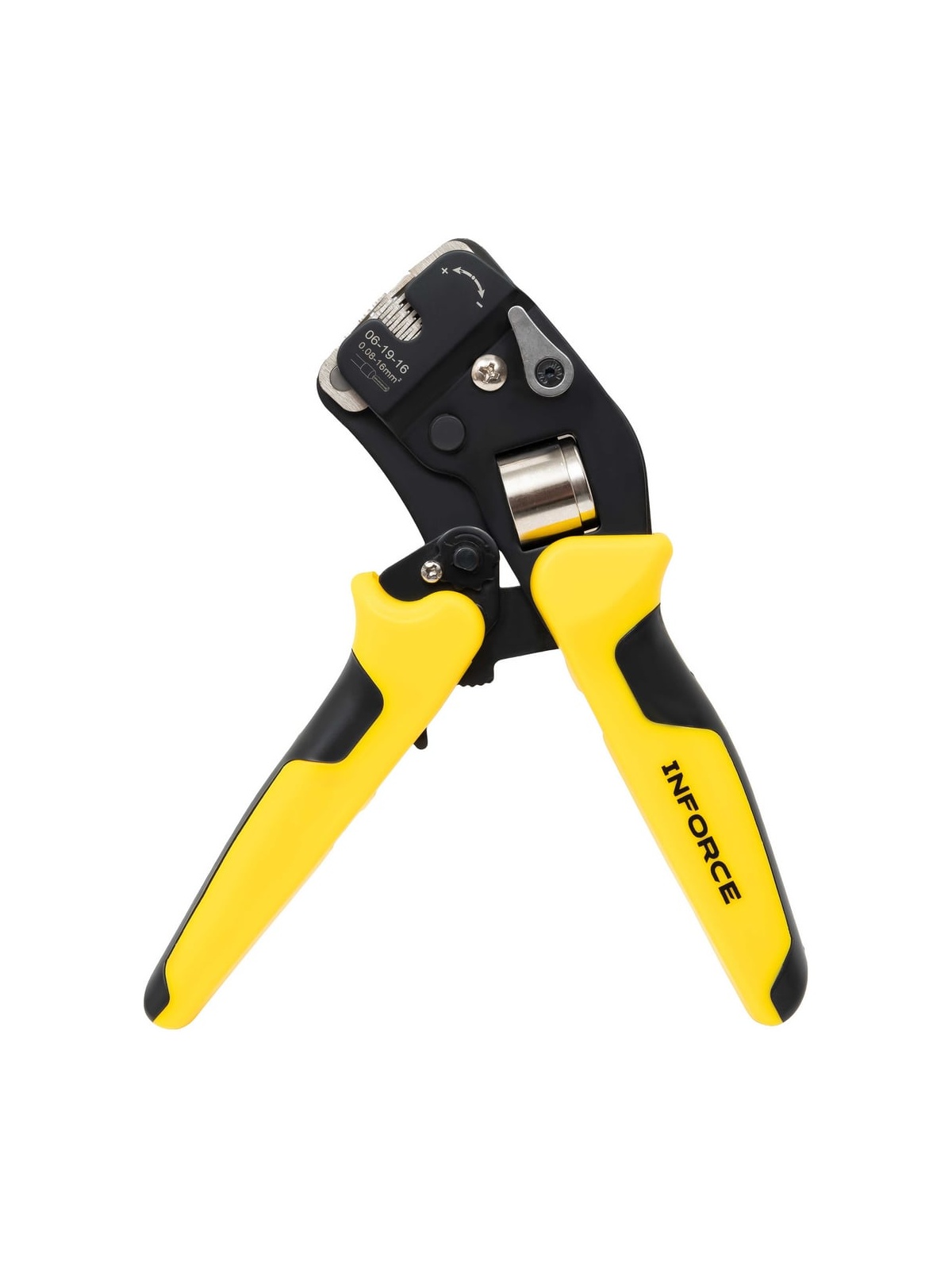 Пресс-клещи Inforce торцевые 0,08 – 16 мм2 06-19-16 оснащены универсальной саморегулирующейся матрицей, которая позволяет работать сразу с 19 размерами наконечников. Предназначены для профессионального использования и выдерживают повышенные нагрузки. Инструмент легко регулируется под конкретный диаметр, имеется переключатель прижимного усилия матрицы. Удобные прорезиненные рукоятки с упорами обеспечивают достаточную передачу усилия. Храповый механизм обеспечивает полный цикл опрессовки, гарантируя правильный обжим наконечников. Есть устройство разблокировки храпового механизма.. Преимущество инструмента заключается в небольшой длине и оптимальном наклоне головки по отношению к рукояткам. Дополнительные характеристики: Материал корпуса: сталь Покрытие корпуса: тефлон Длина: 190 мм Фиксатор рукоятки для удобства транспортировки Возвратная пружина Храповый механизм Устройство разблокировки храпового механизма