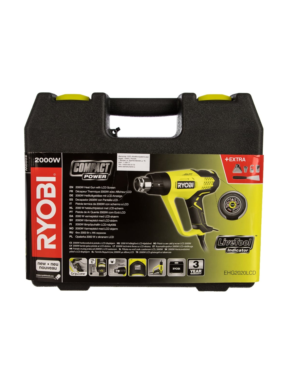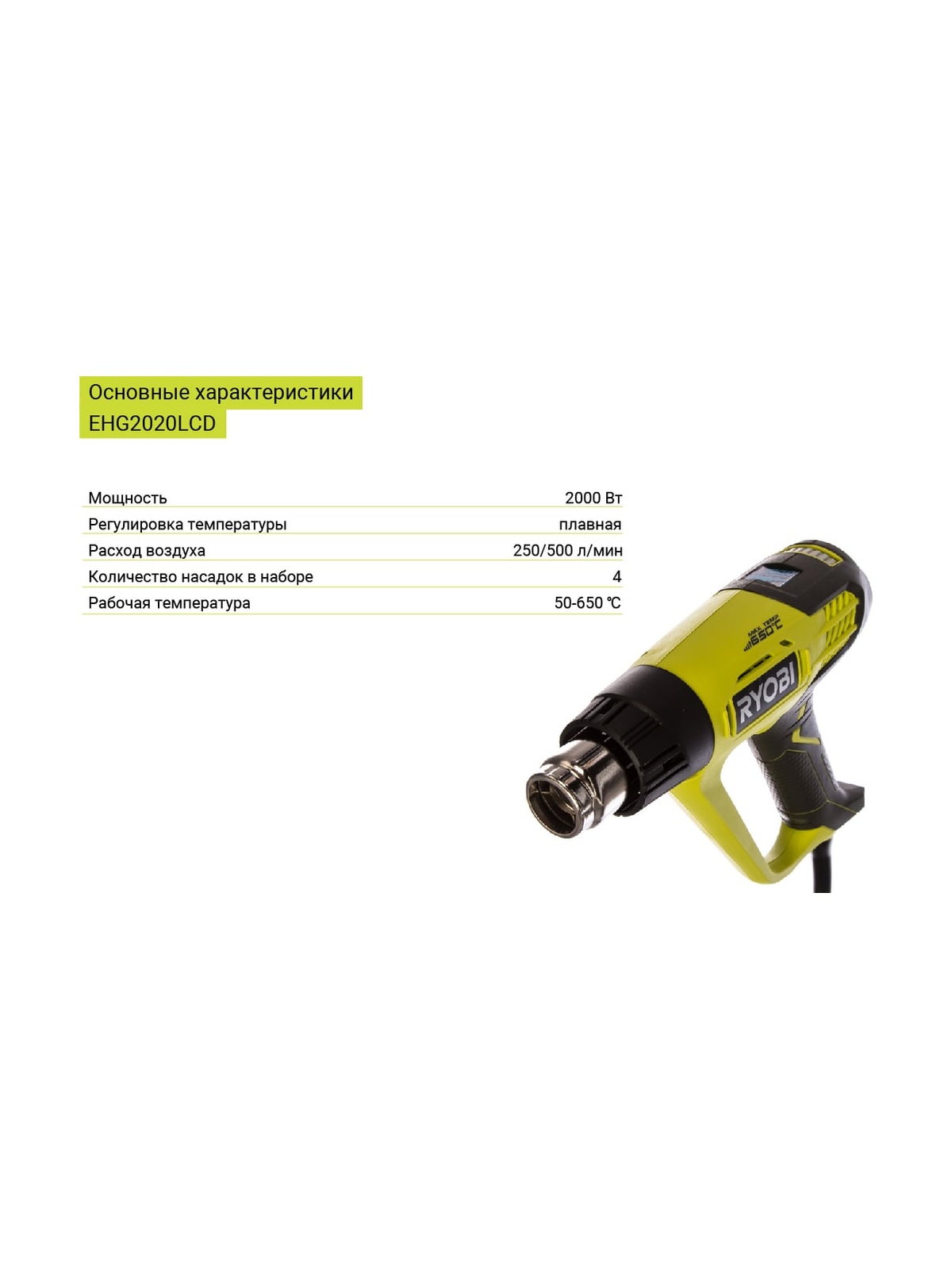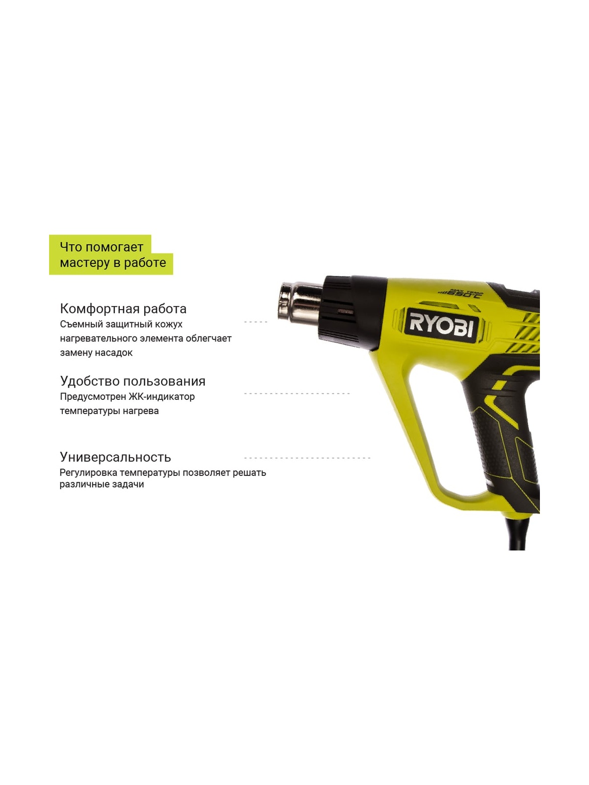 Термопистолет Ryobi EHG2020LCD 5133001730 благодаря нагретому воздушному потоку позволяет решать широкий круг задач, таких как размягчение клеев, удаление старой краски или подсушивание новой. Регулировка температуры позволяет решать различные задачи. Предусмотрен ЖК-индикатор температуры нагрева. Съемный защитный кожух нагревательного элемента облегчает замену насадок.