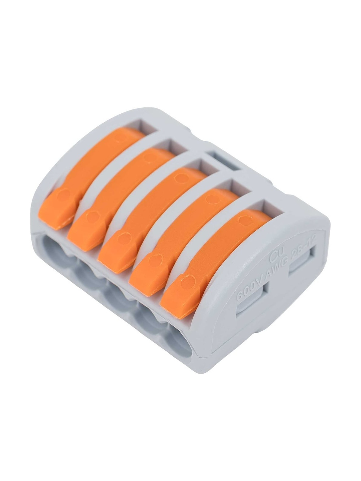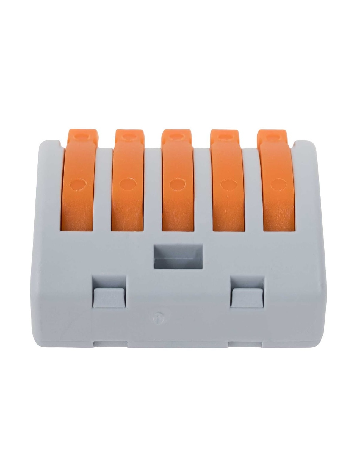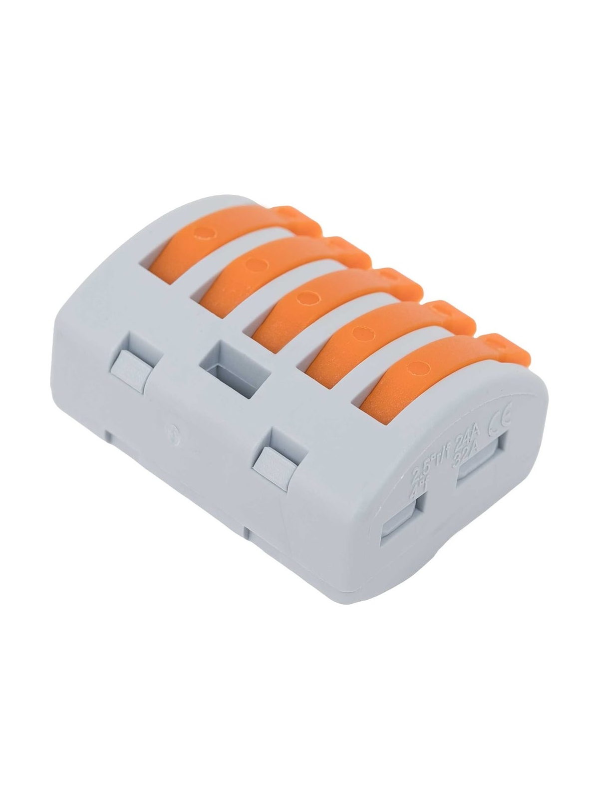 Пятипроводная клемма Gigant 40 шт/уп 0,08-2,5(4)мм² GCT-222-415-40 предназначена для быстрого и надёжного соединения медных проводников при выполнении электромонтажных работ. Применяется в сетях переменного и постоянного тока напряжением до 400 В. Подходит для профессионального использования и бытового монтажа. Клеммы серии 222 позволяют соединять однопроволочные и многопроволочные медные проводники различного сечения в одной клемме: — многопроволочные: 0,14–4 мм²; — однопроволочные: 0,08–2,5 мм². Номинальный ток: — до 24 А (при сечении 2,5 мм²); — до 32 А (при сечении 4 мм²). Рабочая температура окружающей среды — от -40 до +105 °C. Рекомендуемая длина зачистки изоляции — 10 мм. Применяются при монтаже осветительных и розеточных групп, подключении светильников, распределительных коробок, электрощитов, а также при ремонте и модернизации электропроводки. Преимущества: Возможность сочетания проводников разного типа и сечения в одной клемме — удобно при реконструкции и подключении нового оборудования к существующей проводке. Пружинный механизм из нержавеющей стали обеспечивает стабильное контактное давление и надёжную фиксацию без ослабления со временем. Медный контакт с гальваническим покрытием снижает переходное сопротивление и уменьшает риск нагрева. Корпус изготовлен из полимерного материала, соответствующего классу пожарной безопасности UL 94 V0 — не поддерживает горение и самозатухает при устранении источника пламени. Детали выполнены из армированного стекловолокном полимера — повышенная прочность и устойчивость к механическим воздействиям. Быстрый монтаж без применения инструмента: провод вводится в зажим без чрезмерных усилий и надёжно фиксируется без выпадений. Российское производство полного цикла с автоматизированной сборкой и контролем качества — стабильность параметров каждой партии.