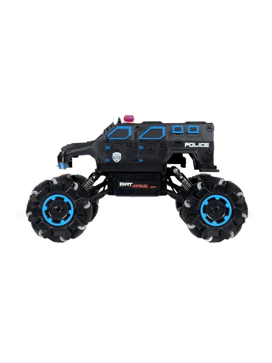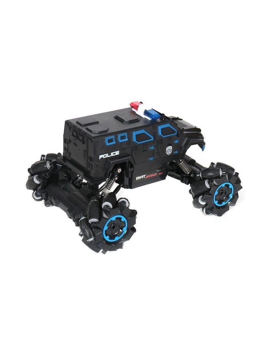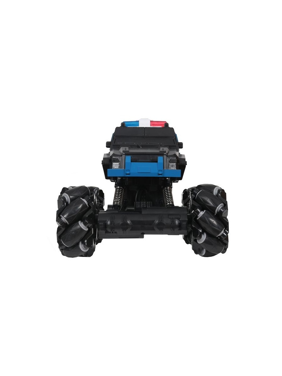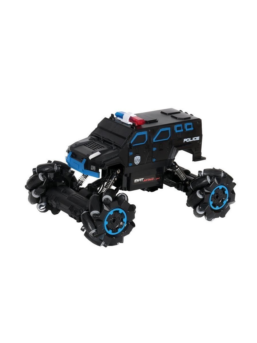 Радиоуправляемый внедорожник для дрифта c расцветкой Полиция. Модель выполнена в масштабе 1:15. Благодаря колесам роллерам машинка способна перемещается боком, влево и направо, так же можно комбинировать движения с ездой прямо и назад. Таким образом, получается визуальный эффект дрифта. Большие колеса позволяют не только преодолевать препятствия, а также выполнять разворот на месте по часовой стрелке.