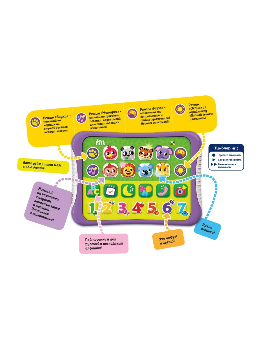 Развивающая игрушка Kids Hits Хит Пэд "Веселые друзья" — это замечательный способ погрузить вашего малыша в мир знаний и веселья! С этим планшетом, предназначенным для детей от 3 лет, ваши дети смогут знакомиться с интересными фактами о животных, изучать алфавит, формы и цвета, расширяя свои знания и развивая любопытство.