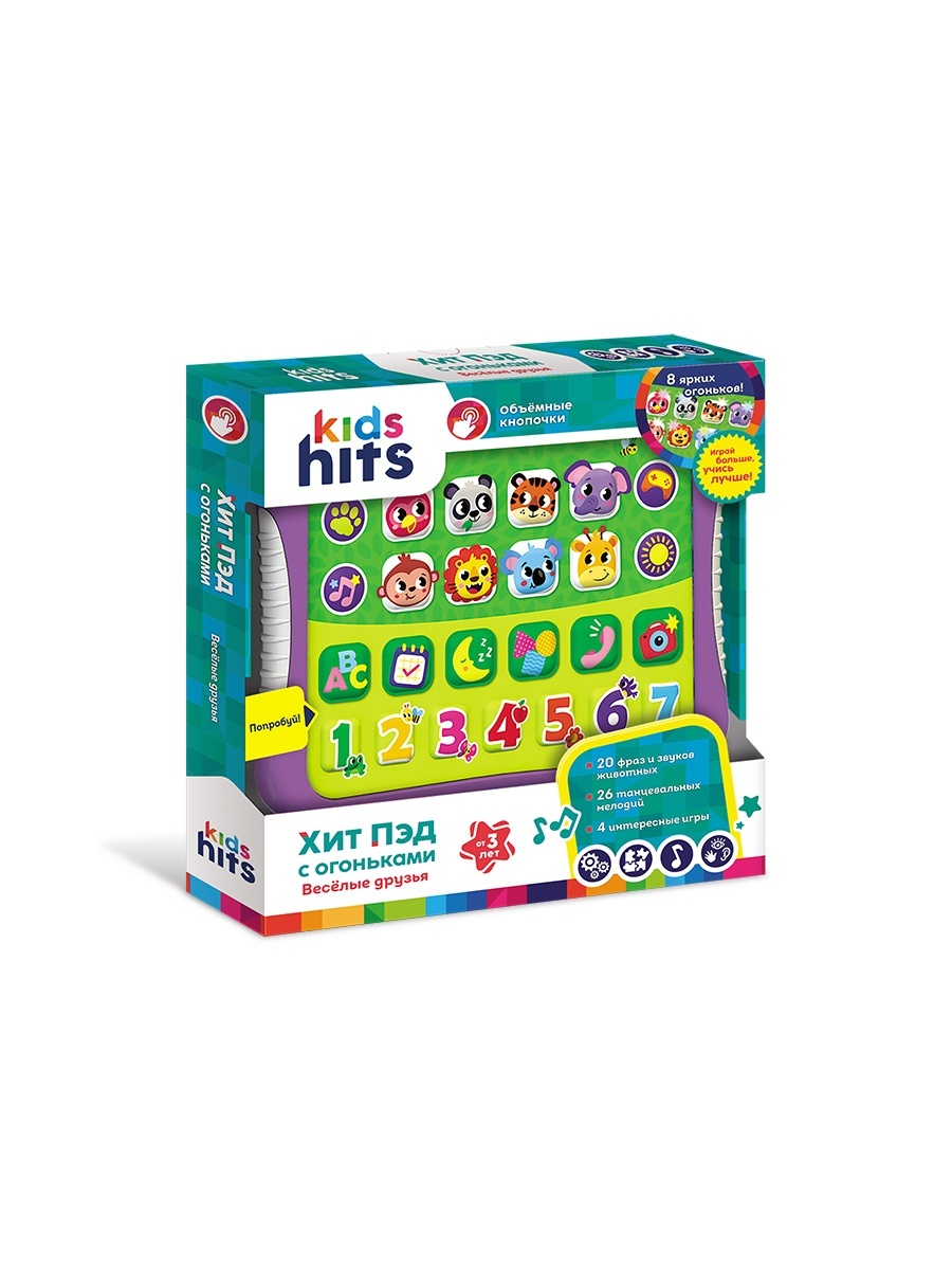 А благодаря тумблеру громкости, вы всегда сможете контролировать уровень звука на максимуме, среднем или вовсе выключить его. Развивайте логическое мышление и сенсорное восприятие вашего ребенка с Kids Hits Хит Пэд "Веселые друзья"!
