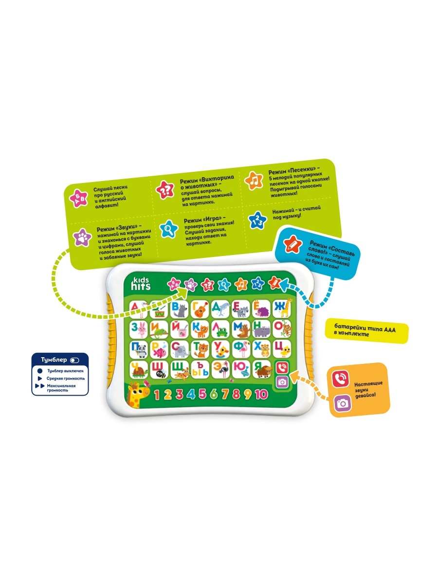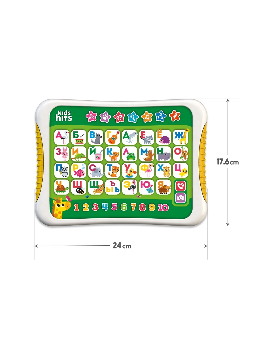 Развивающая игрушка Kids Hits Хит Пэд "Веселая азбука" — это идеальное решение для детей от 3 лет, желающих весело и увлекательно изучать мир вокруг. С помощью 95 фраз и звуков, а также 14 песен и мелодий, ваш ребенок погрузится в захватывающий процесс обучения. В трех увлекательных играх он сможет изучать алфавит, счет, цвета и животных, развивая познавательные способности и логическое мышление.