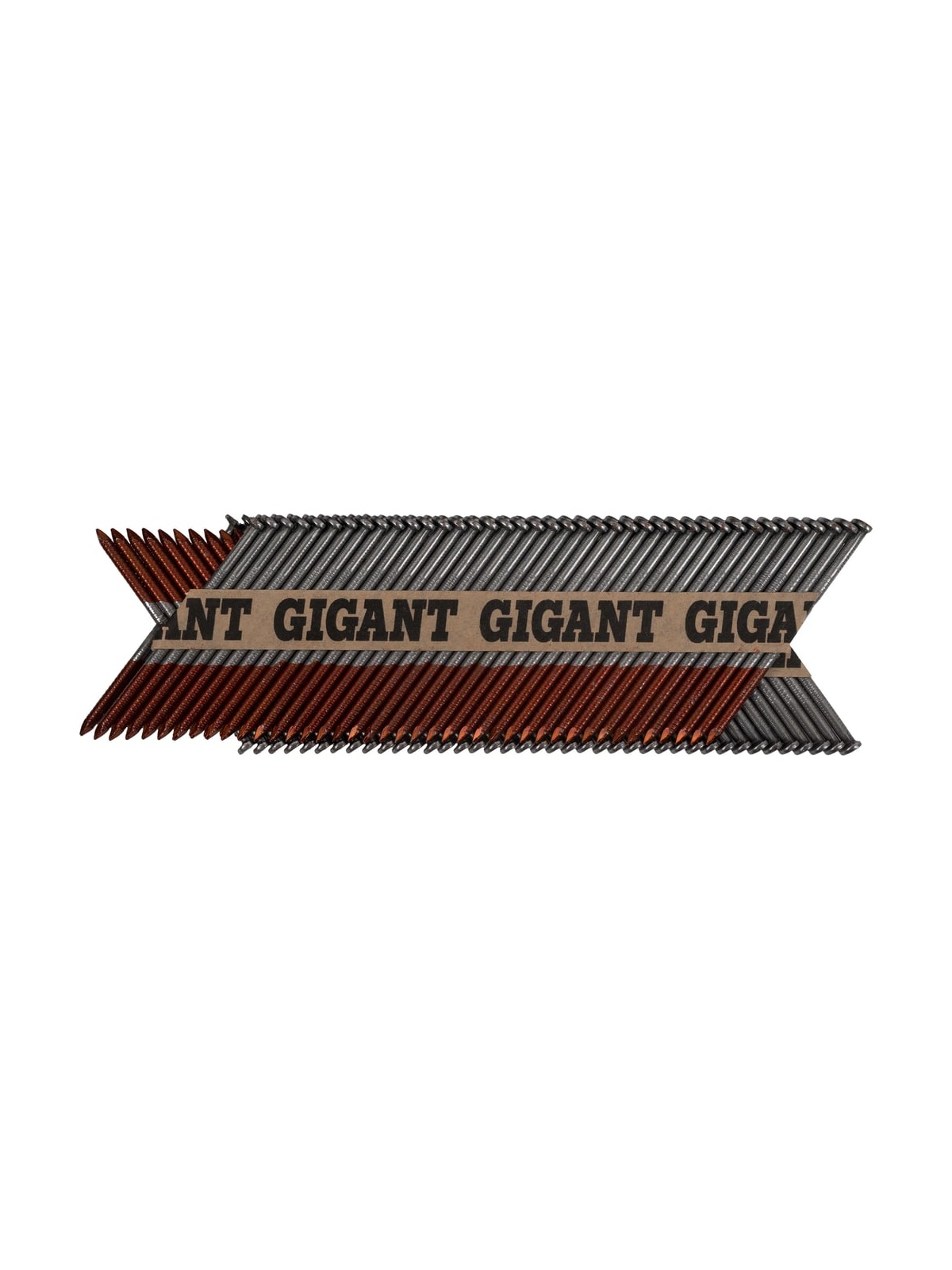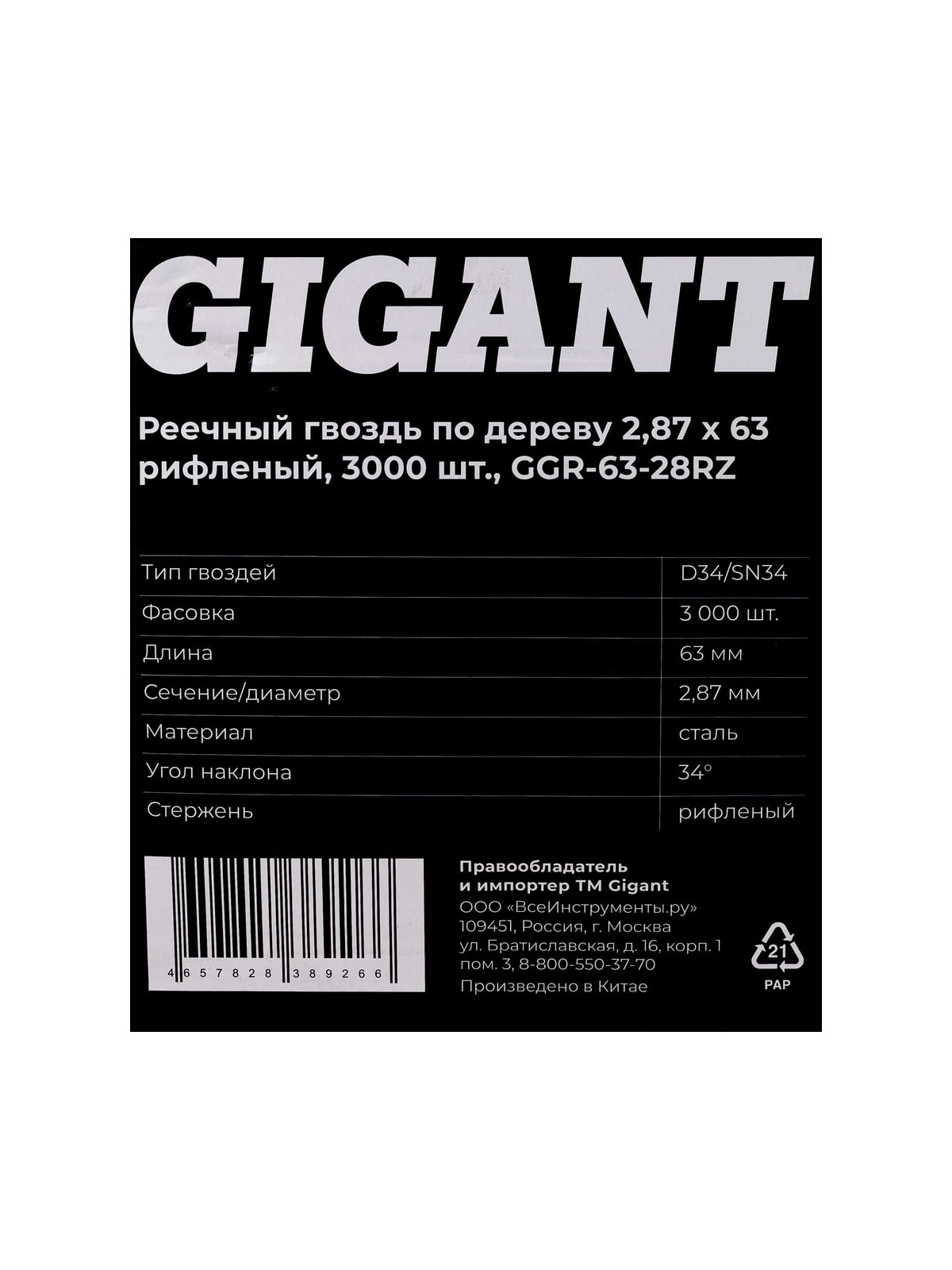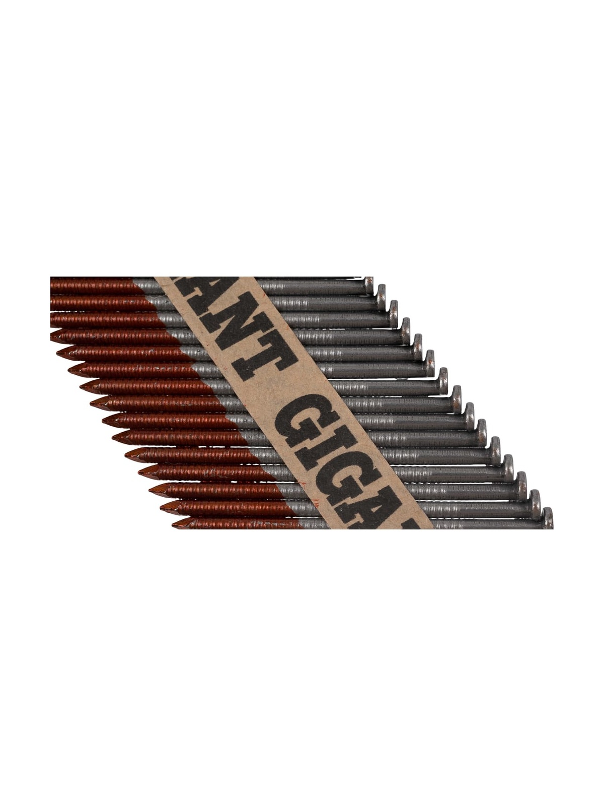 Реечный гвоздь по дереву 2,87x63 рифлёный, 3000шт. Gigant GGR-63-28RZ используется в строительстве (сборке стропильных систем, деревянных каркасов), упаковочных работах и иных сферах. Рифленый стержень обеспечивает надежное сцепление с материалом, предотвращая выскальзывание. Упаковка из 3000 штук делает их экономичным выбором для крупных проектов. Расположены под углом 34 градуса, это позволяет не задевать шляпку соседнего гвоздя при монтаже и увеличивает срок службы пистолета. В комплекте 75 кассет на бумаге, в каждой кассете по 40 гвоздей. Могут использоваться с газовыми или аккумуляторными пистолетами большинства производителей, представленных на рынке (Hybest, Fubag, Зубр, Metabo и др.). Кольцевая накатка обеспечивает повышенное сцепление с древесиной. Бумажная основа и клей подобраны таким образом, что кассеты не разбиваются при падении, а при монтаже бумага полностью отделяется с гвоздем и не застревает в обойме.