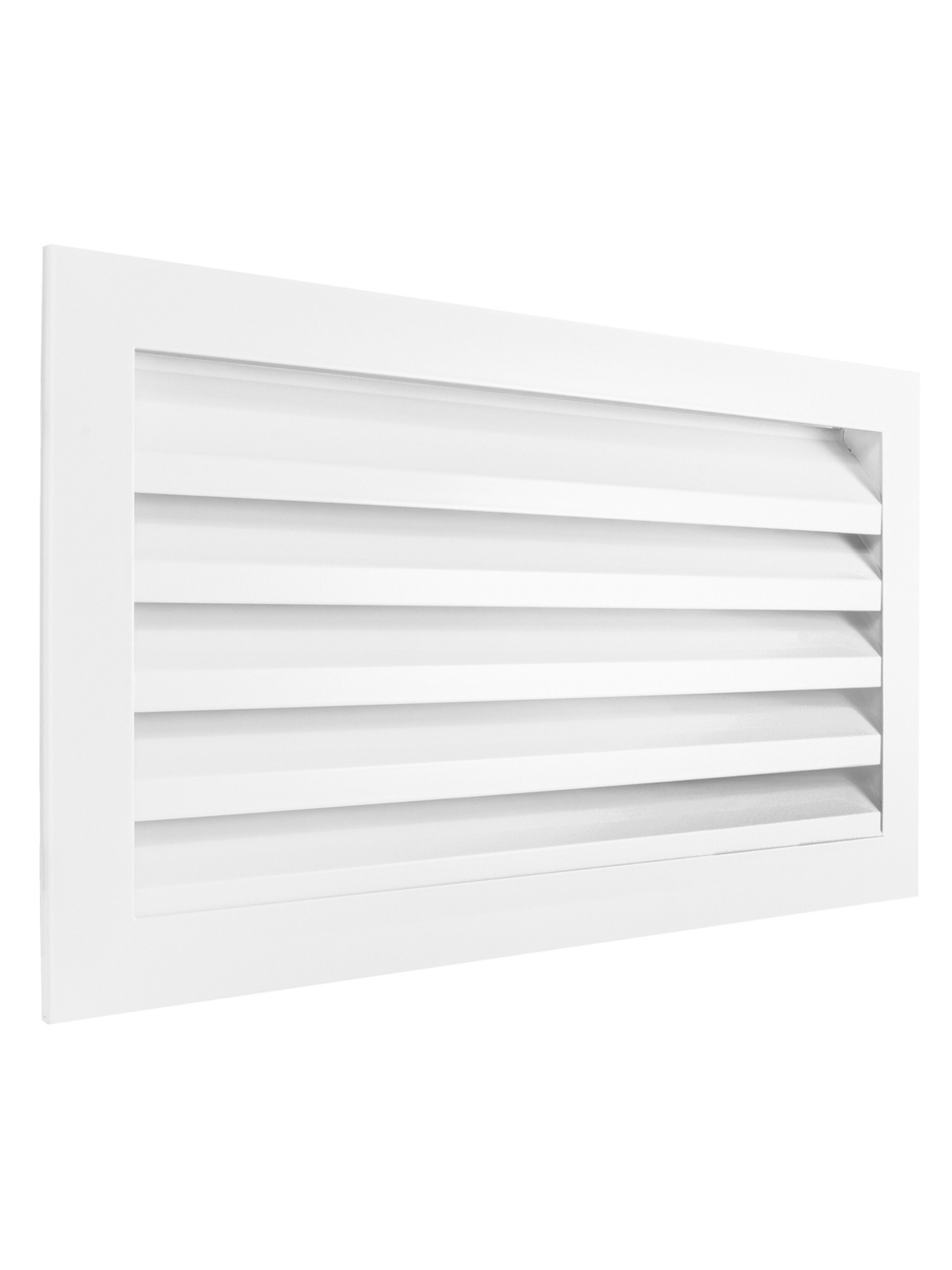 - Неподвижные алюминиевые жалюзи, расположенные под углом 45°, с рамкой.