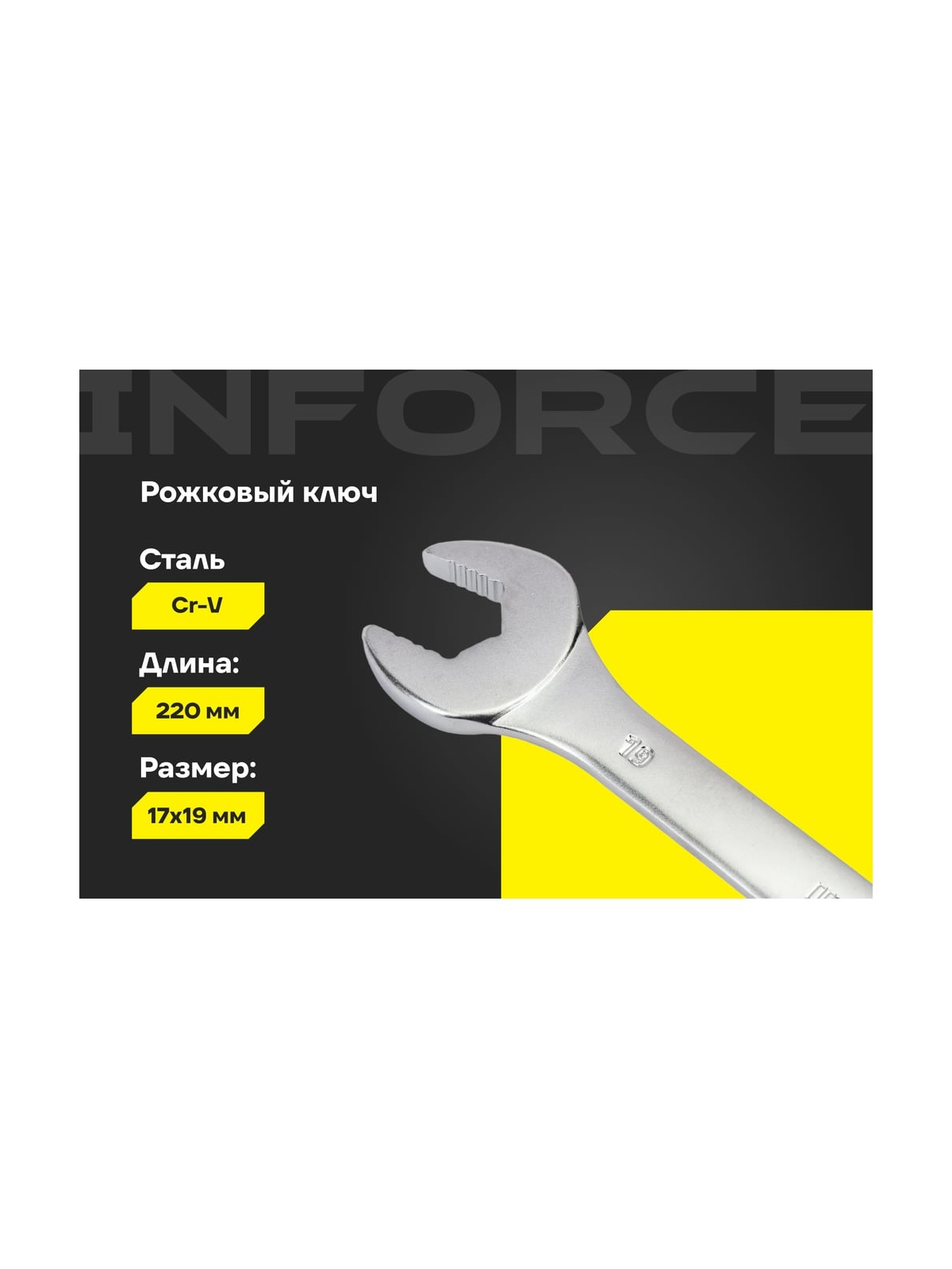 Рожковый ключ 17x19мм Inforce 06-05-63выполнен из прочной хромованадиевой стали. Сплав выдерживает значительное давление и воздействие коррозии. Инструмент обладает оптимальной длиной для качественной работы в ограниченном пространстве и с тугим крепежом.