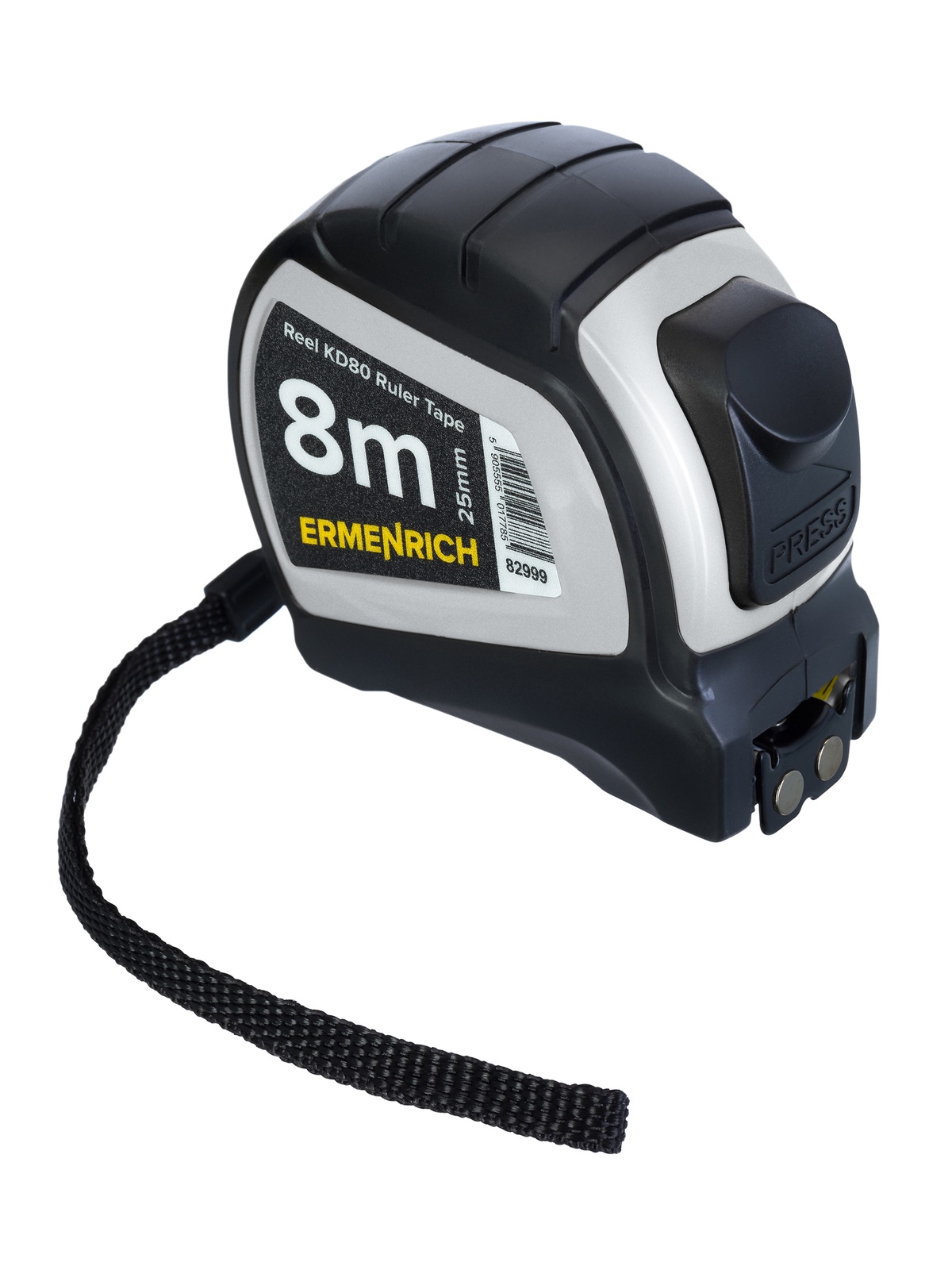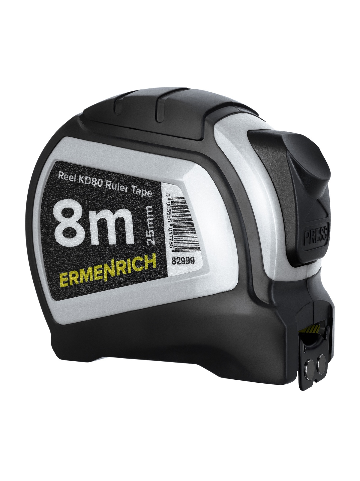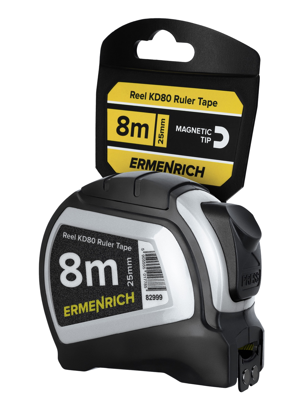 8-метровая рулетка Ermenrich Reel KD80 – это классический инструмент для ремонтных, строительных или бытовых работ. Она изготовлена из прочной матовой стали, имеет прорезиненный пластиковый корпус, благодаря чему прослужит долго.