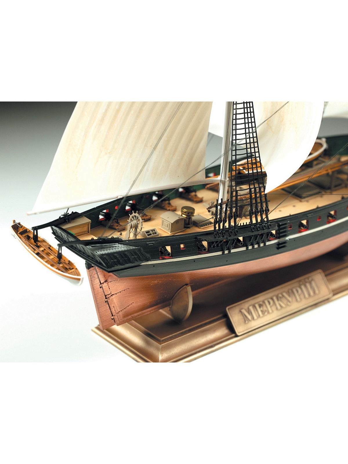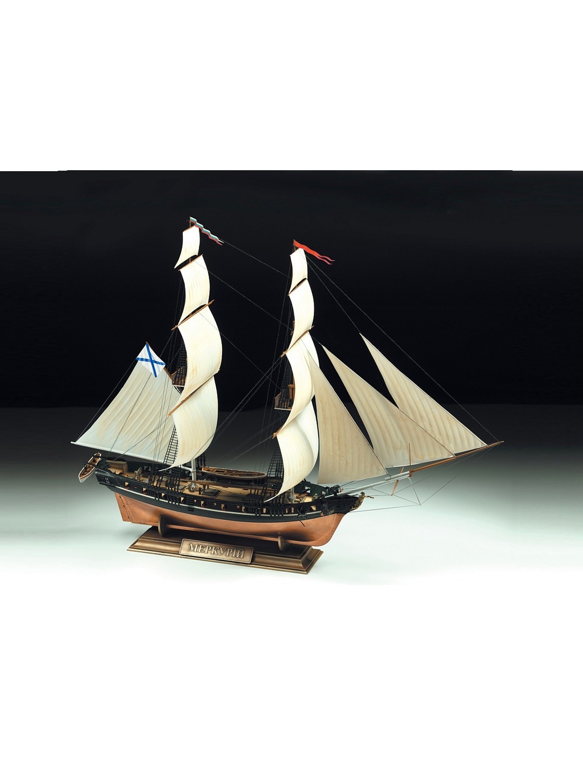 20-пушечный бриг "Меркурий" заложили в Севастополе в 1819 году. Корабельный мастер И.Я. Осминин задумывал "Меркурий" как специальный корабль для охраны Кавказского побережья и несения дозорной службы. "Меркурий" мог идти как под парусами, так и на веслах. 14 (26) мая 1829 года во время Русско-турецкой войны три русских корабля -фрегат "Штандарт", бриги "Орфей" и "Меркурий" несли сторожевую службу у Босфора и заметили турецкую эскадру из 14 судов. Неприятельская эскадра устремилась в погоню за русскими кораблями. "Штандарт" и "Орфей" быстро оторвались от погони, а "Меркурий" под командованием капитан-лейтенанта А.И. Казарского принял бой с лучшими кораблями турецкой эскадры 110-пушечным "Селимие" и 74-пушечным "Реал-бей". "Меркурий", используя весла и искусно маневрируя, мастерски уклонялся от залпов, стреляя по рангоуту и парусам неприятельских кораблей. Около четырех часов длился этот беспримерный в истории неравный бой. "Селимие" и "Реал-Бей" получили критические повреждения, что не позволило им и дальше преследовать Меркурий. "Меркурий" получил 22 попадания в корпус, более 300 в паруса, такелаж и рангоут, но смог присоединиться к своей эскадре. Экипаж "Меркурия" был награжден, а сам бриг получил памятный Георгиевский флаг и вымпел.