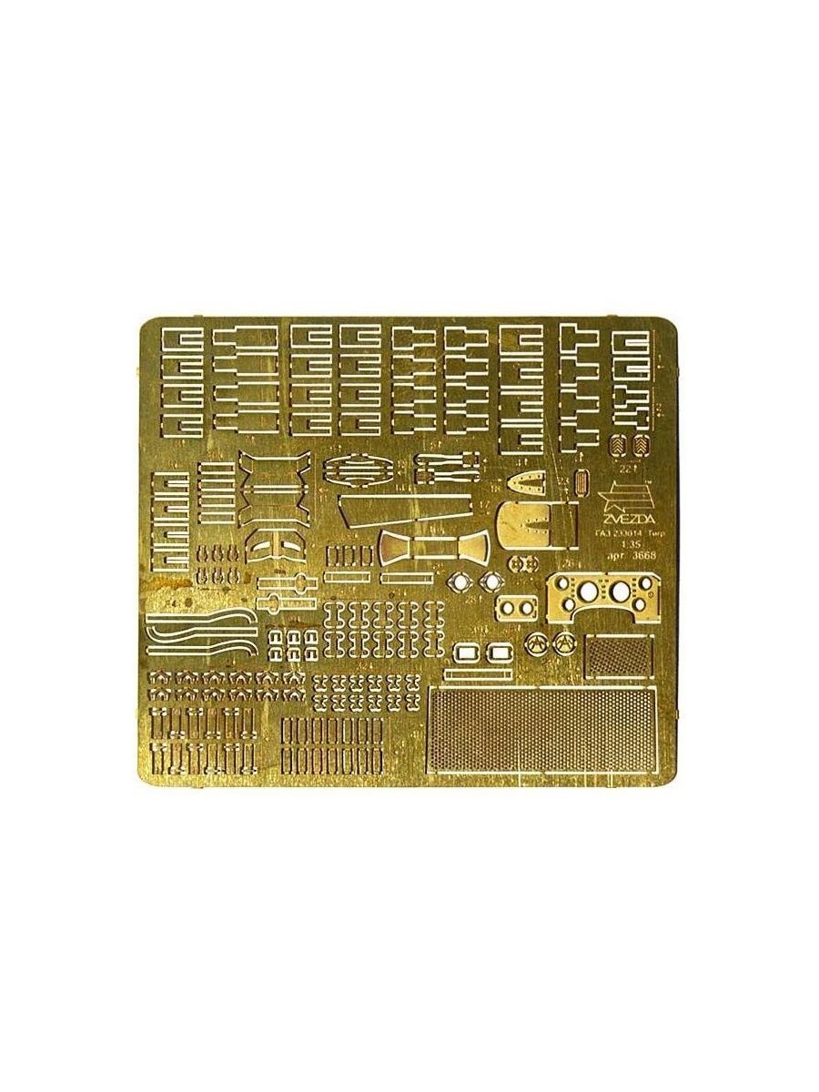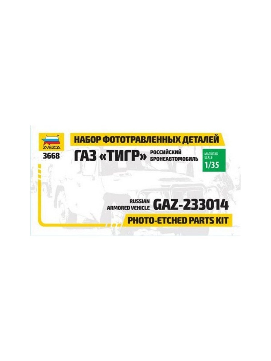 Комплект металлических фототравлёных деталей для установки на модель российского бронеавтомобиля ГАЗ-233014 «Тигр» (артикул zv-3668). Предназначены для замены пластиковых сеток , значительно улучшает вид готовой модели.