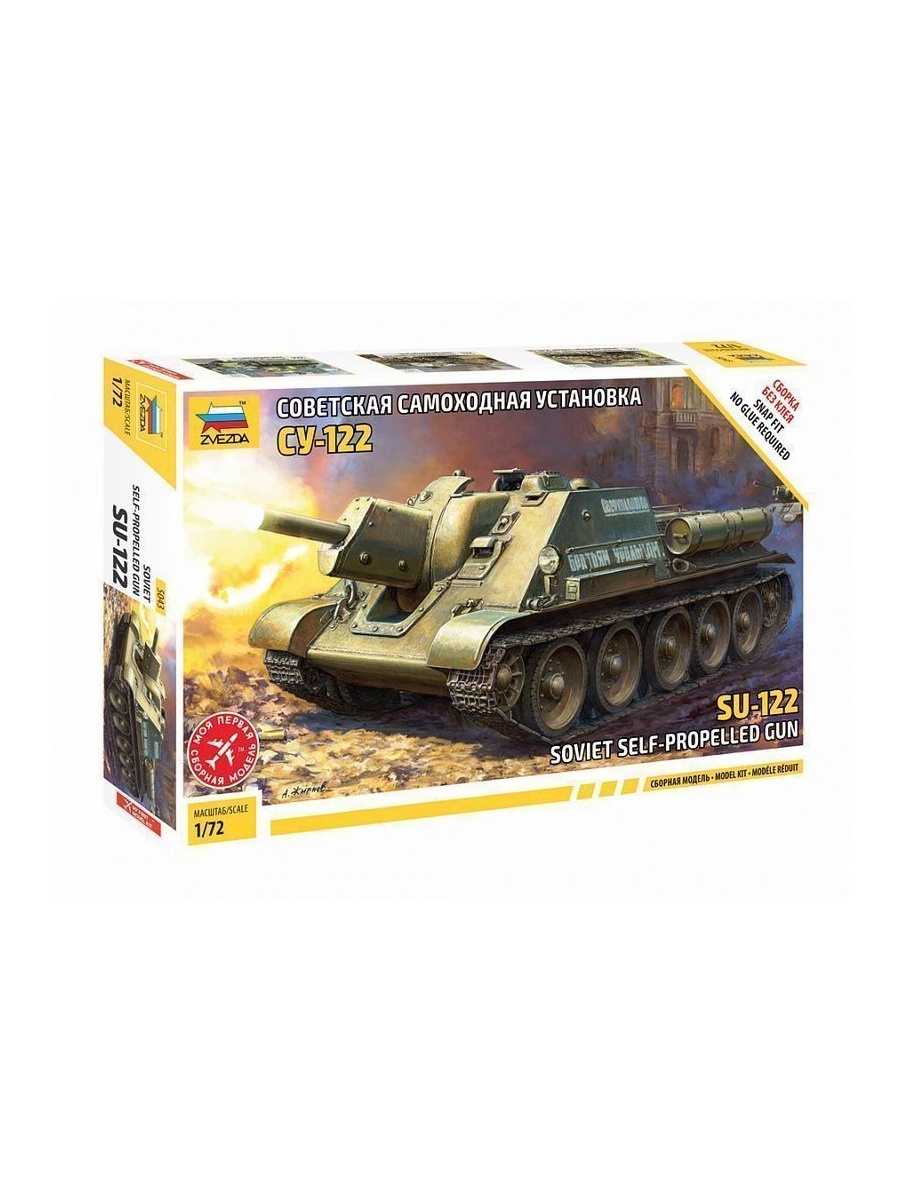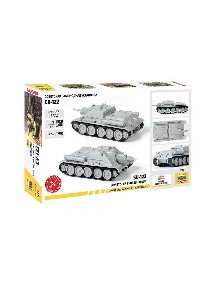 Модель СУ-122 выполнена по технологии «сборки без клея» в масштабе 1/72. Однако, для достижения высокого уровня детализации, ряд дополнительных элементов можно посадить на клей. Краски в комплект не входят.