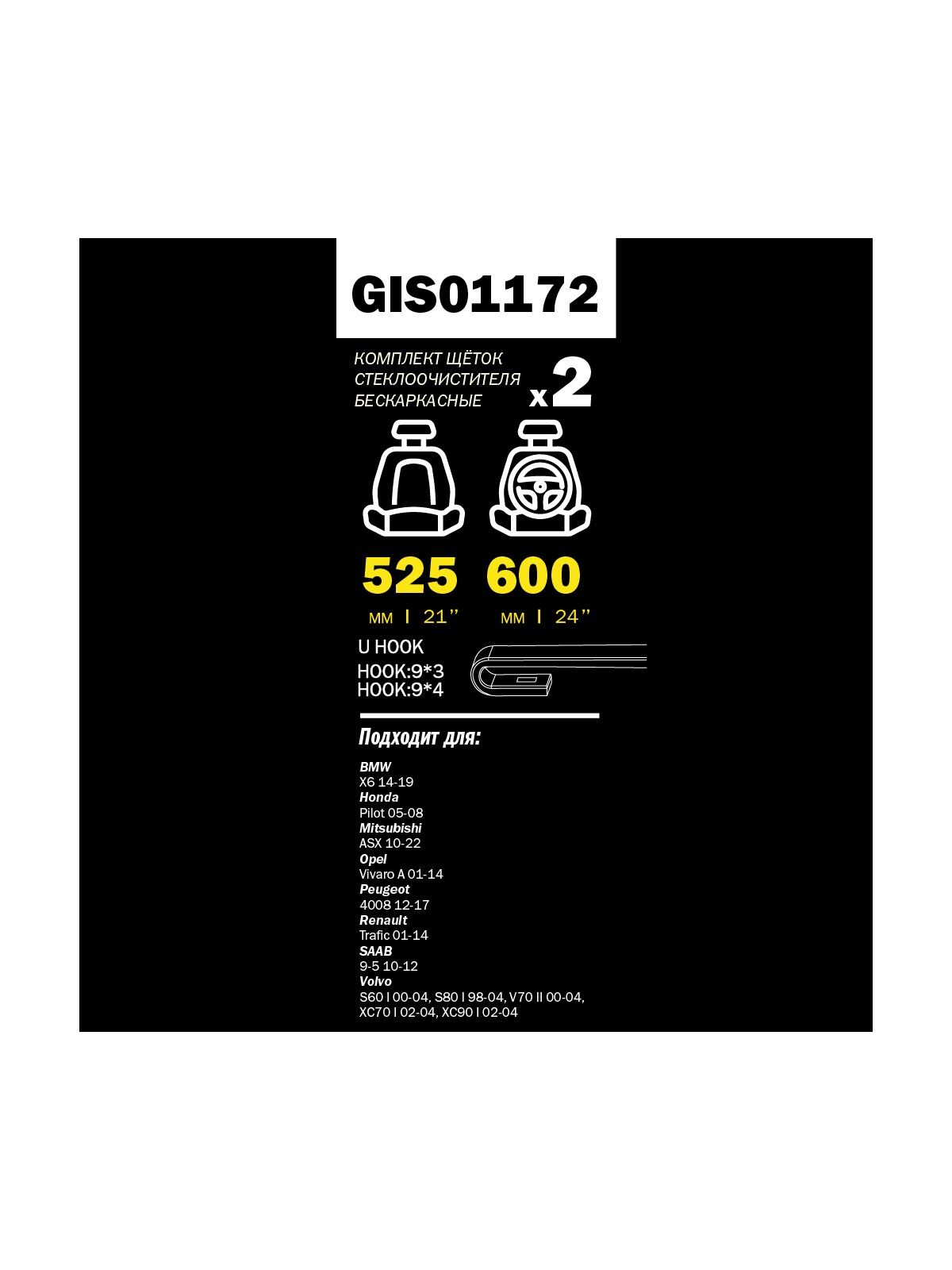 Щетка стеклоочистителя 600/525 мм бескаркасная комплект 2 шт Honda Accord 09-/Mits. Outlander 07-/Peugeot 4007- GANZ PRO-LINE GIS01172.