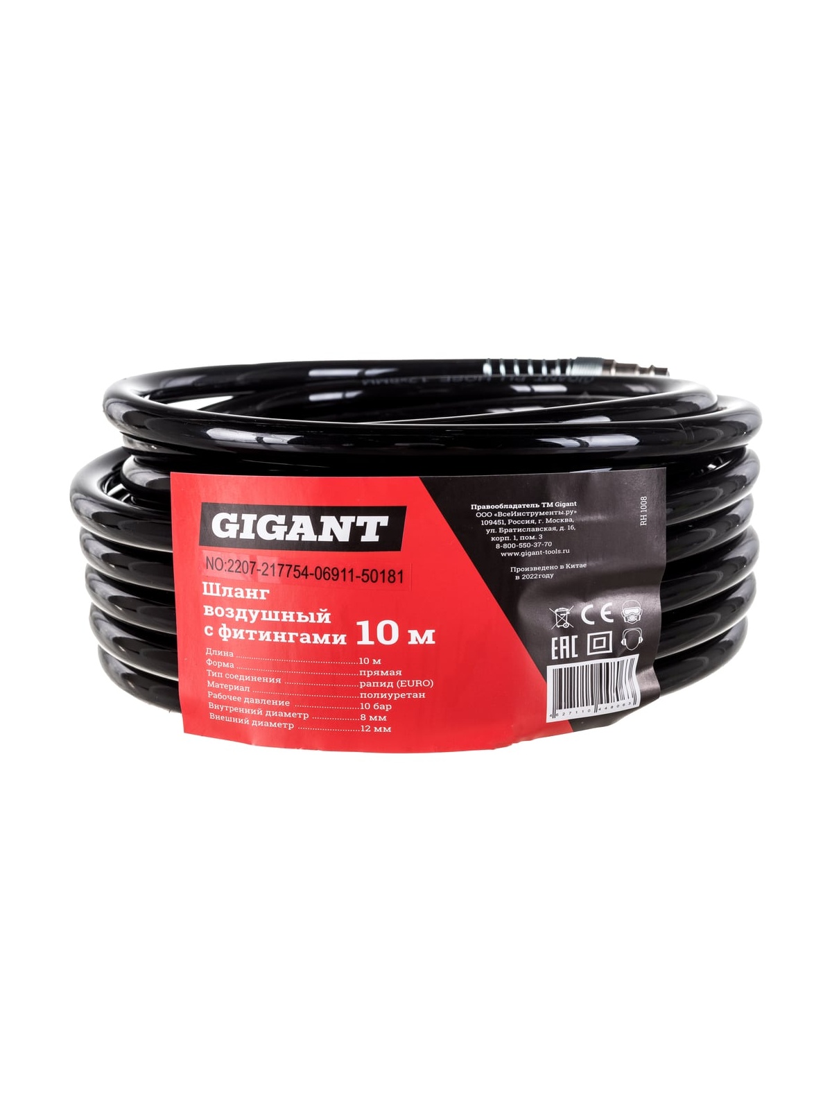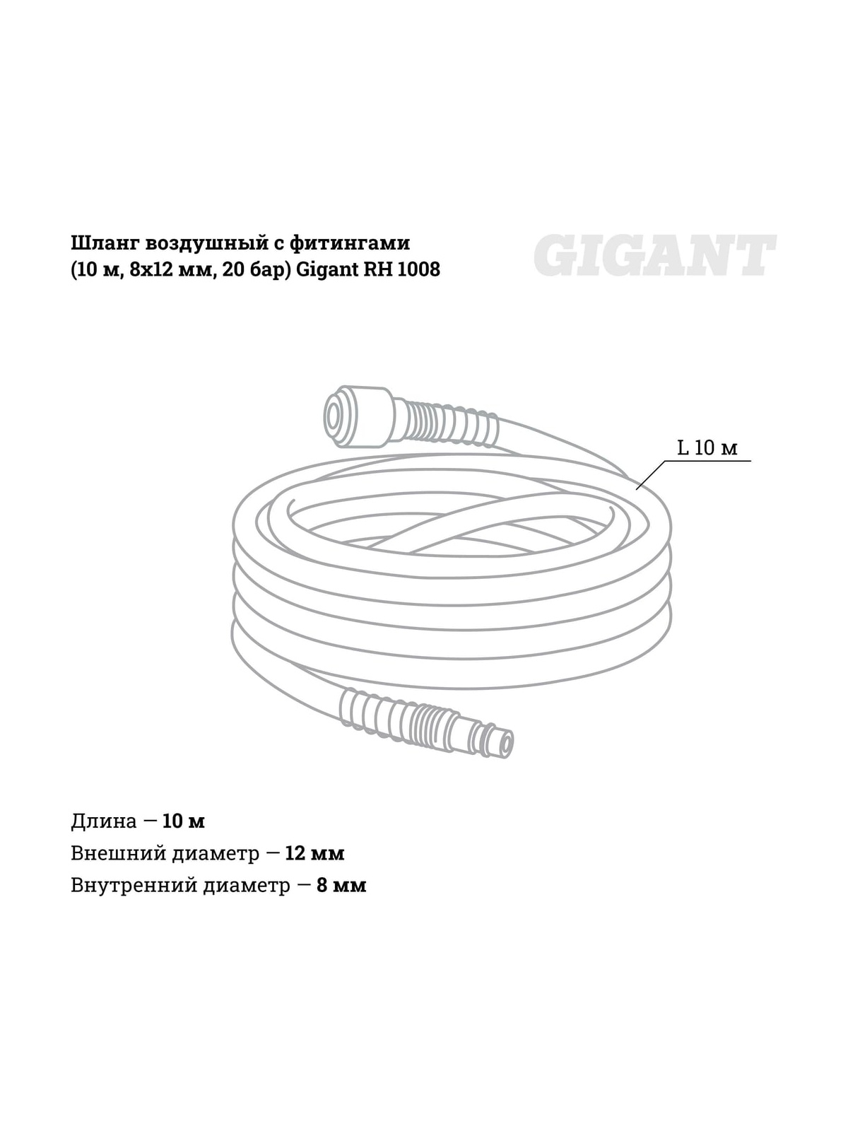 Шланг воздушный с фитингами Gigant RH 1008 применяется для присоединения инструмента к компрессору. Шланг длиной 10 метров позволяет работать на расстоянии от компрессора. Шланг идеально подходит (рекомендуется) для стационарного монтажа пневмолиний.