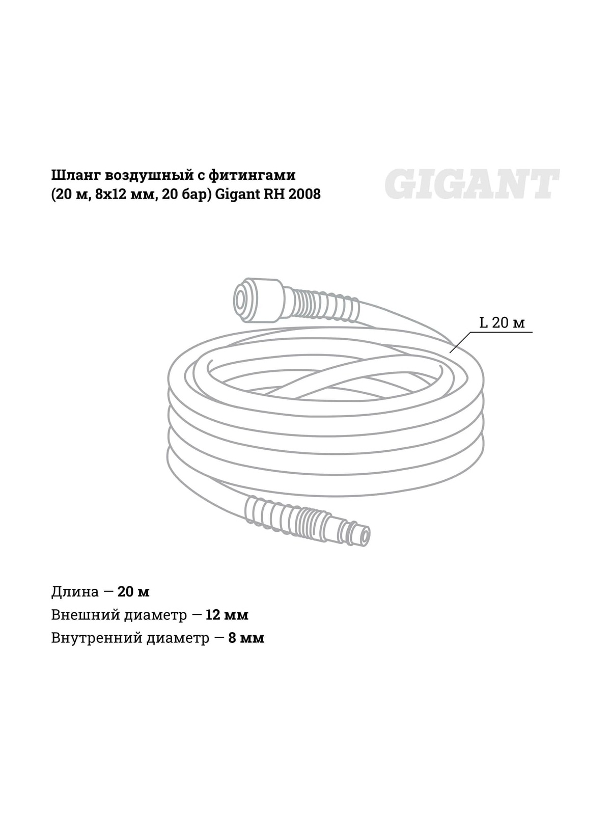 Шланг воздушный с фитингами Gigant RH 2008 применяется для присоединения инструмента к компрессору. Шланг длиной 20 метров позволяет работать на расстоянии от компрессора. Максимальное давление 20 бар. Рабочее давление 10 бар. Шланг идеально подходит (рекомендуется) для стационарного монтажа пневмолиний.