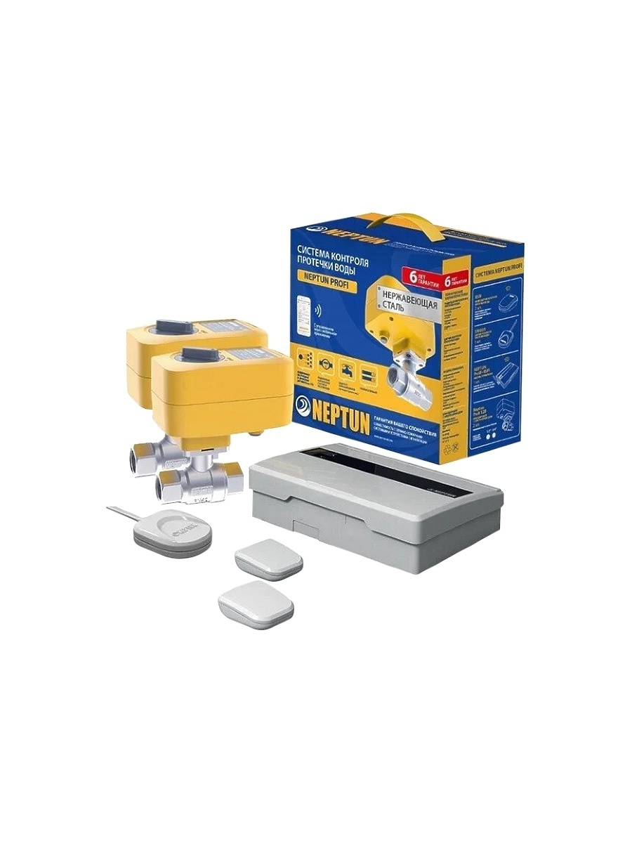 Модуль управления Neptun Base - 1 шт; Кран шаровый с электроприводом Neptun Profi 220В - 2 шт; Датчик проводной SW005 - 3 шт., длина 2 метра (возможно нарастить до 100 м.)