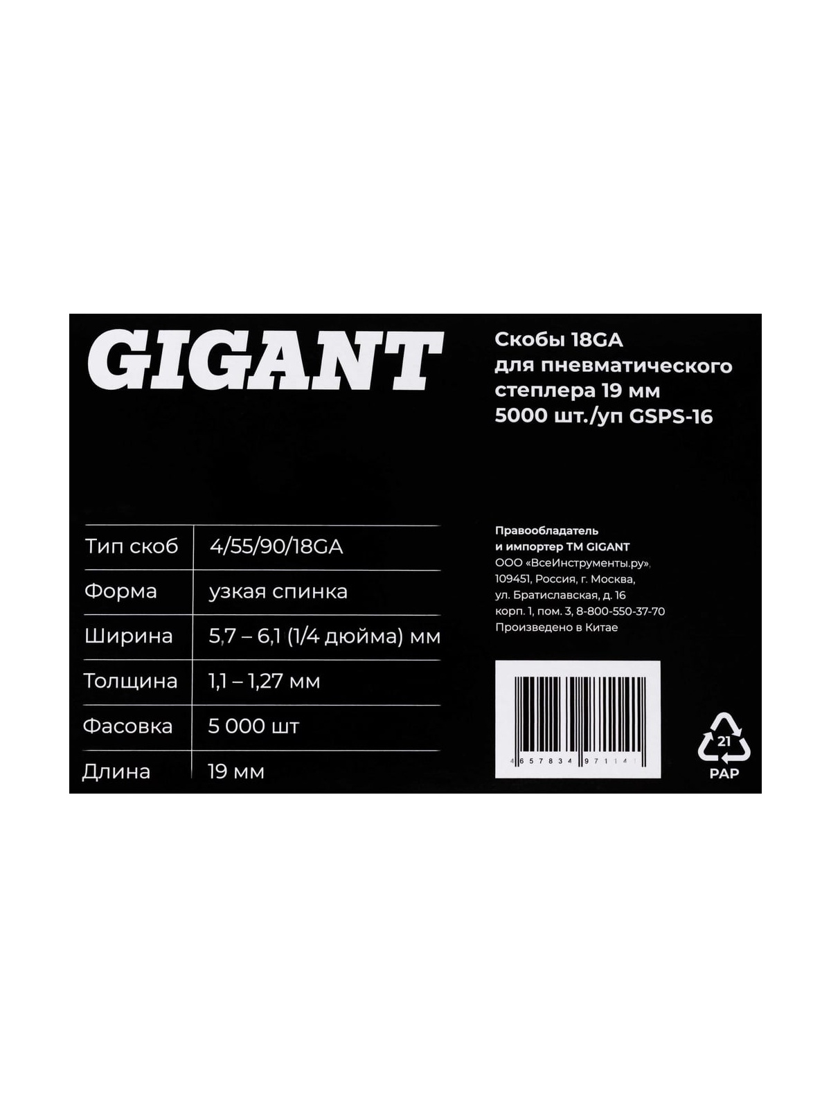 Скобы 18GA для пневматического степлера 19 мм, 5000 шт./уп Gigant GSPS-16 - крепежные элементы сечением 1,25 х 1,0 мм, длиной 19 и шириной 5,7 мм, предназначенные для установки в строительный пневматический степлер. Применяются для сборки деревянных каркасов, ремонта кровли, монтажа окон и дверей, фиксации утеплителей. Скобы изготовлены из закаленной оцинкованной проволоки, защищены от коррозии. Имеют высокую пробивную способность. Обеспечивают надежное и долговечное крепление.