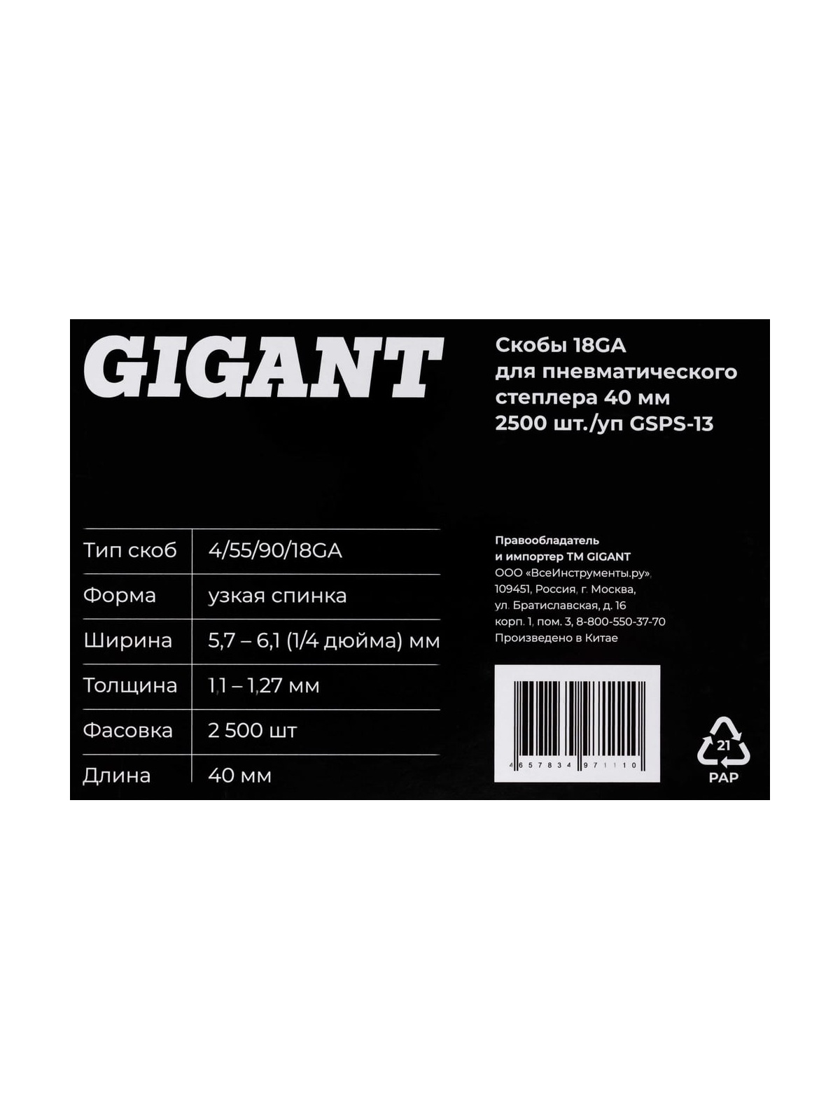 Скобы 18GA для пневматического степлера 40 мм, 2500 шт./уп Gigant GSPS-13 применяются при сборке каркасов, контейнеров, деревянной мебели, креплении облицовочных материалов к поверхностям из фанеры, дерева, ДСП, с помощью степлера электрического или пневматического. Скобы изготовлены из закаленной оцинкованной проволоки, защищены от коррозии. Имеют высокую пробивную способность. Обеспечивают надежное и долговечное крепление.