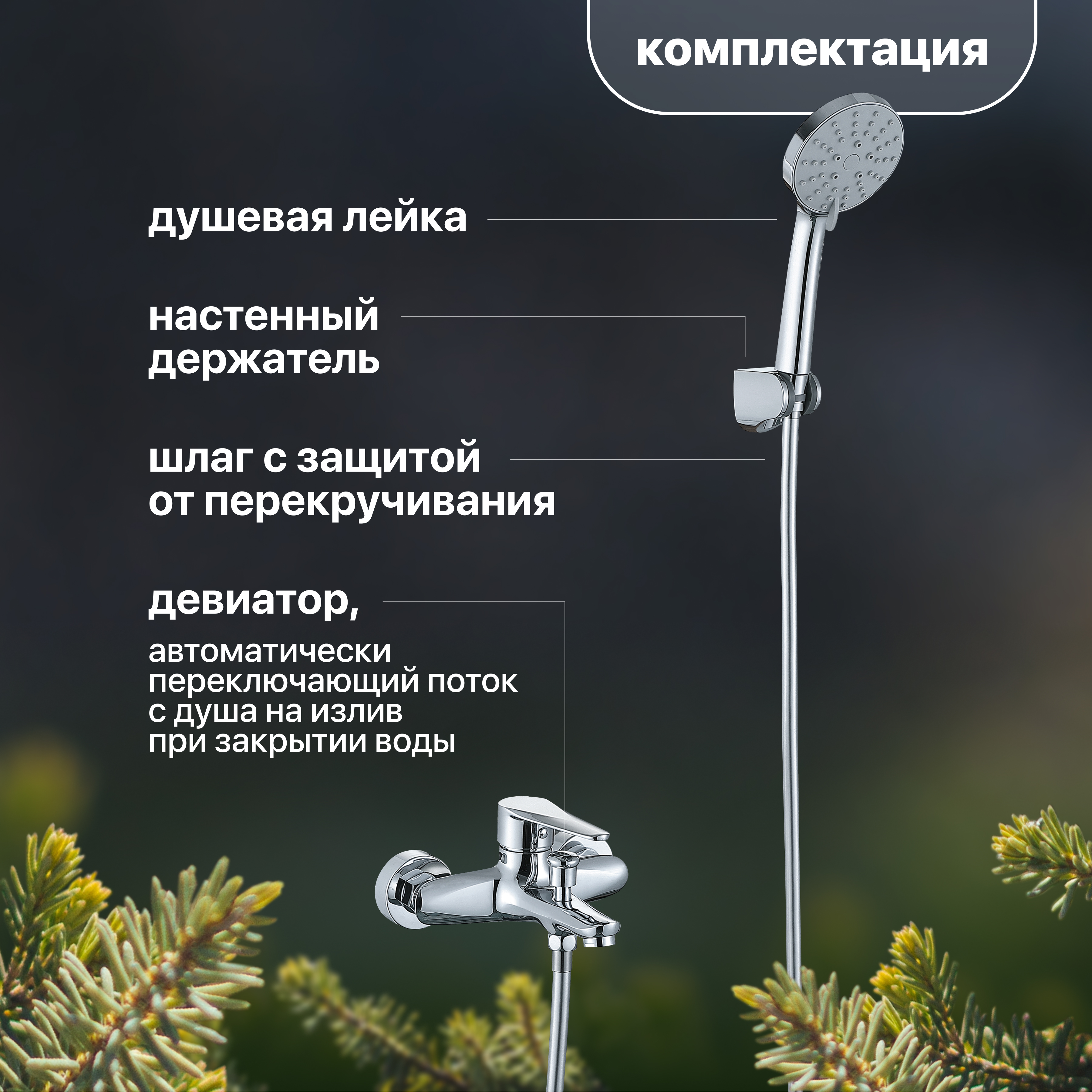 Дополнительное оснащение - настенный держатель,душевой шланг,душевая лейка