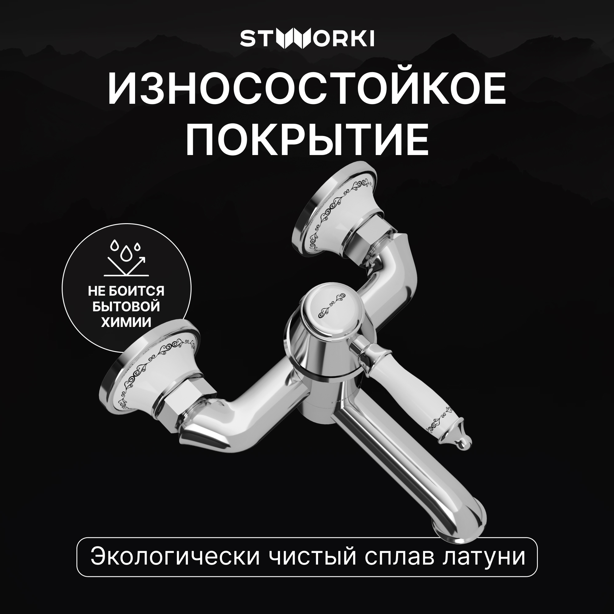 Преимущества - экологически чистый сплав латуни,износостойкое покрытие,картридж повышенной надежности,тихая работа и плавное управление,струя без брызг